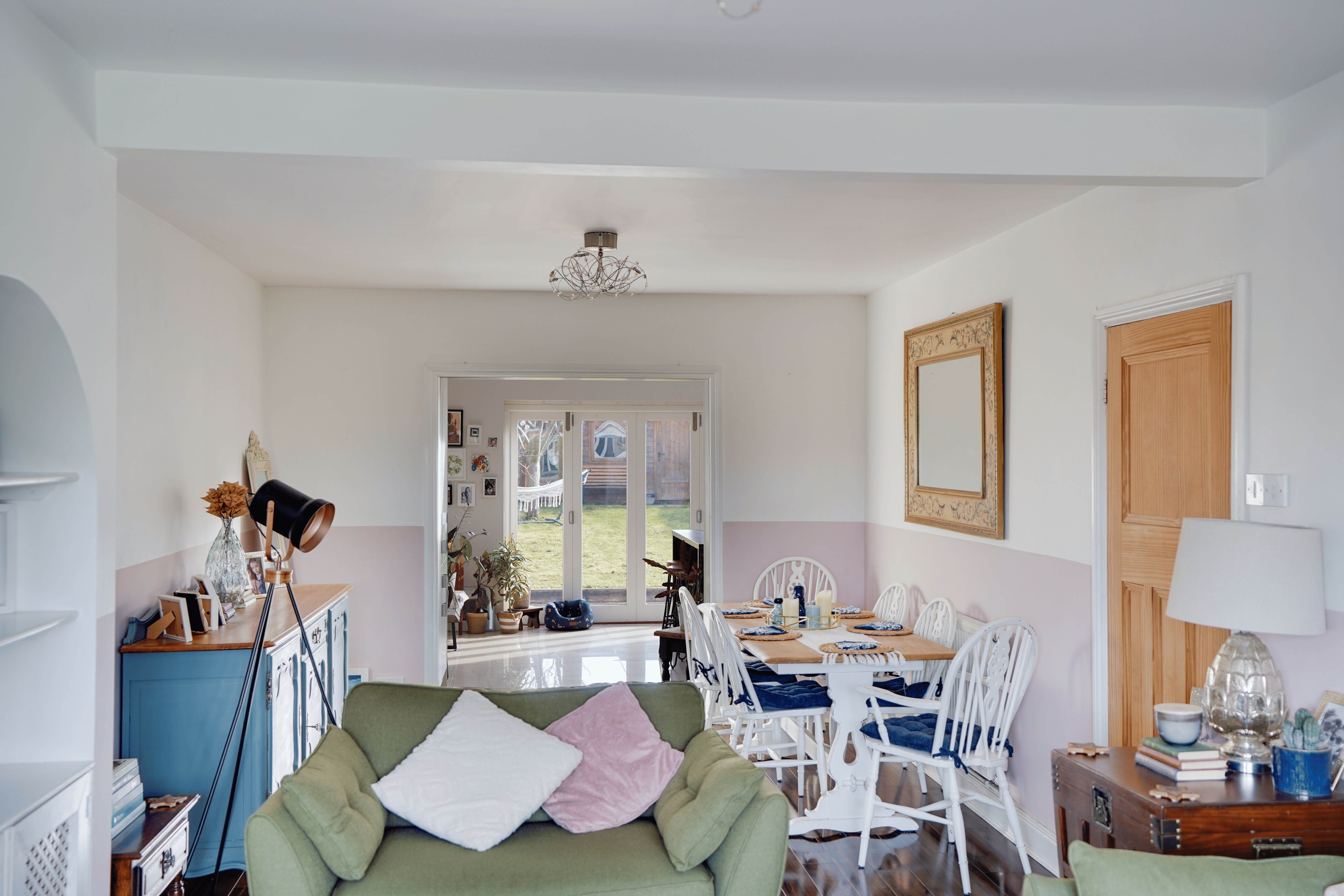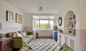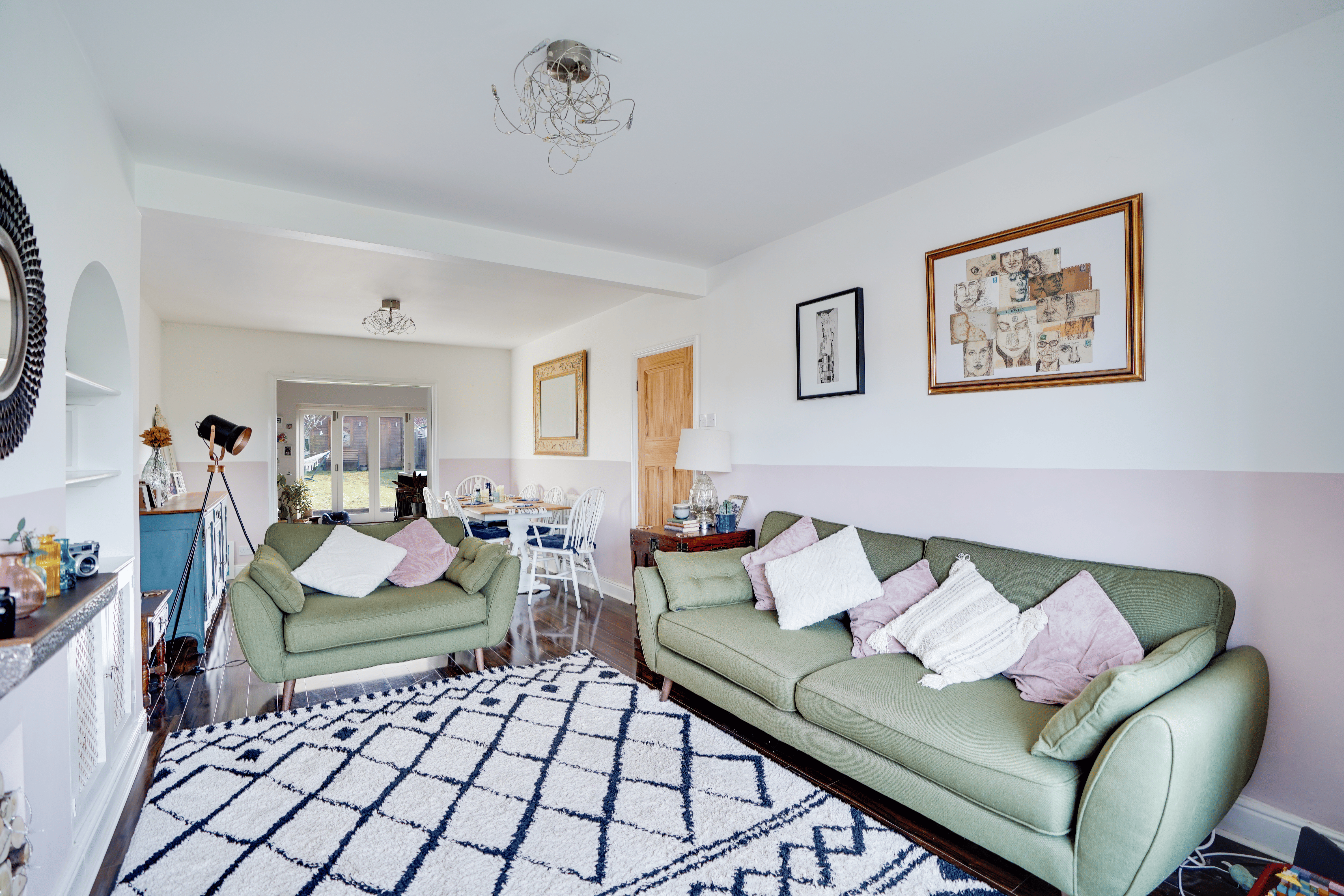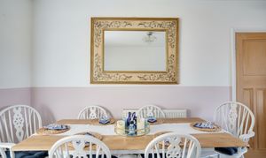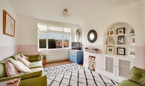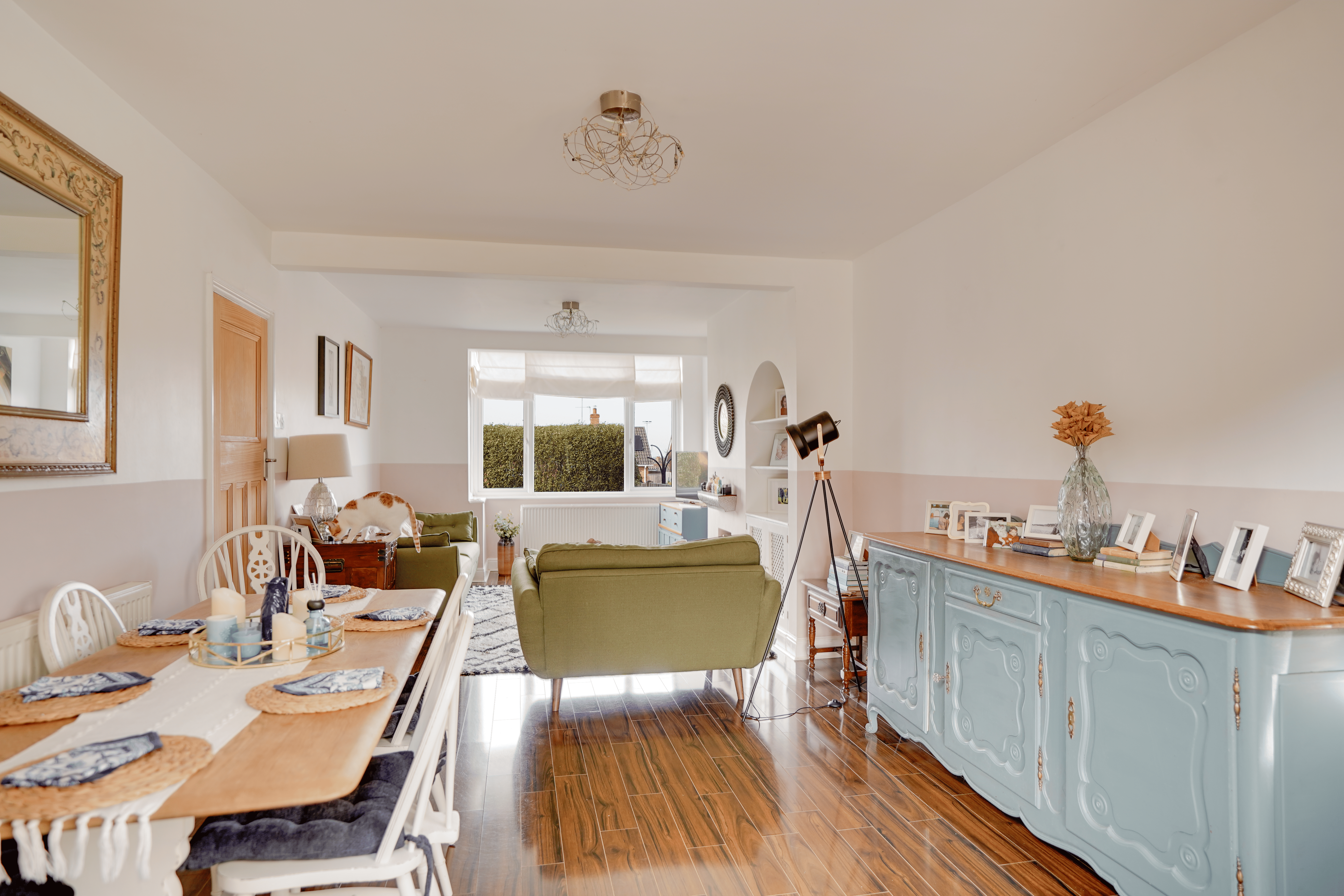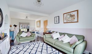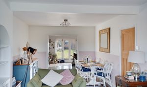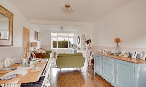 The impressive open-plan sitting and dining room features a charming bay window, creating a bright yet cosy space ideal for both relaxing and entertaining.