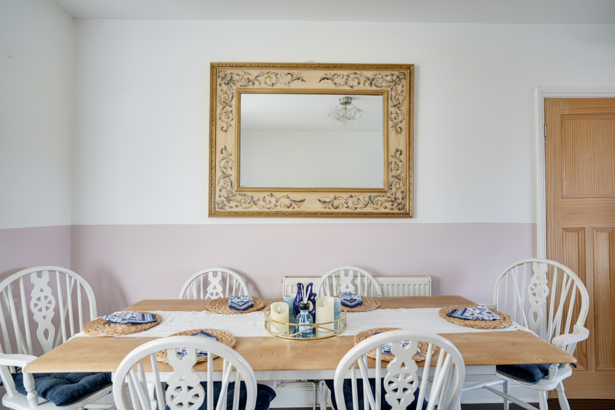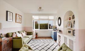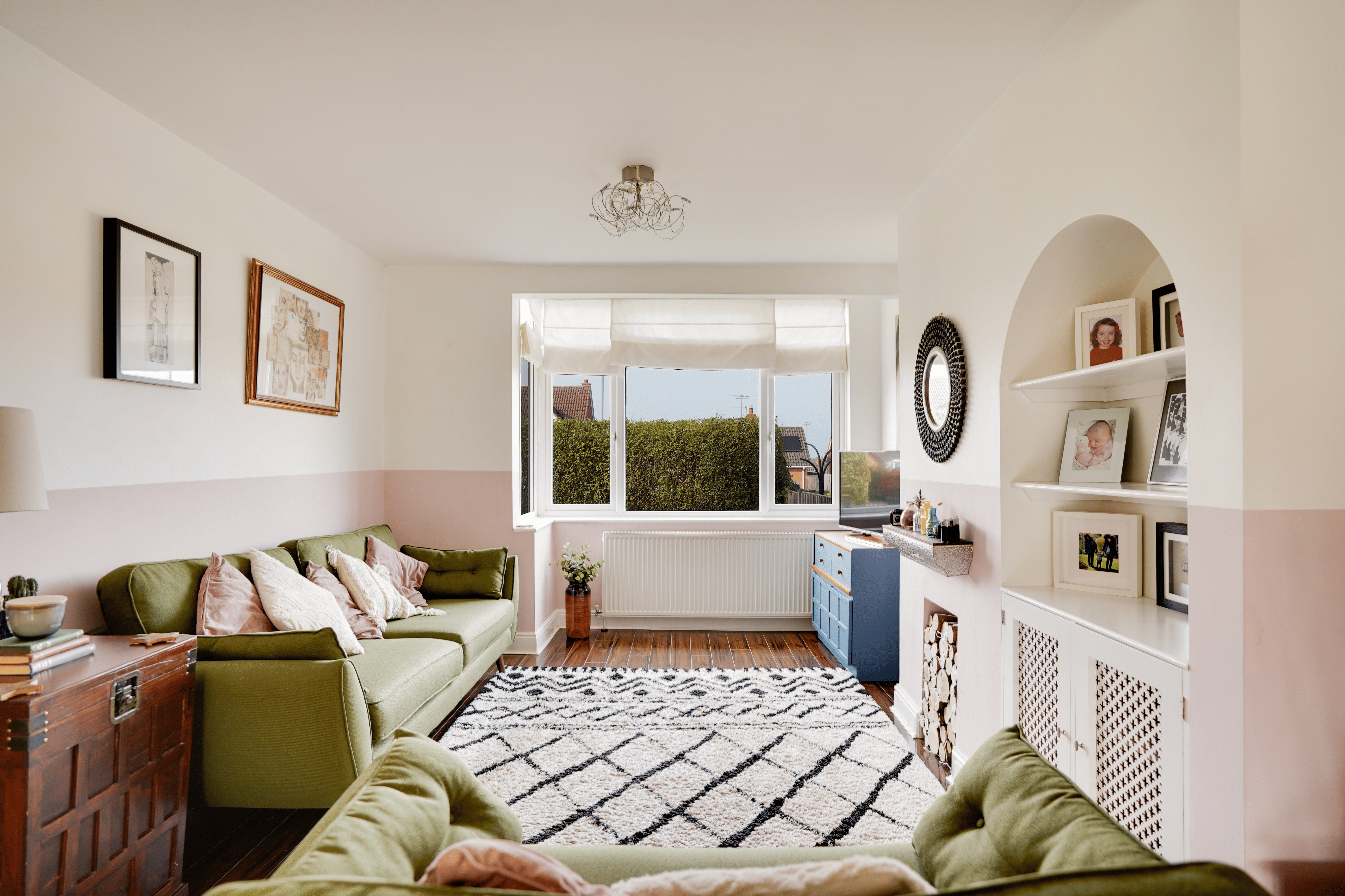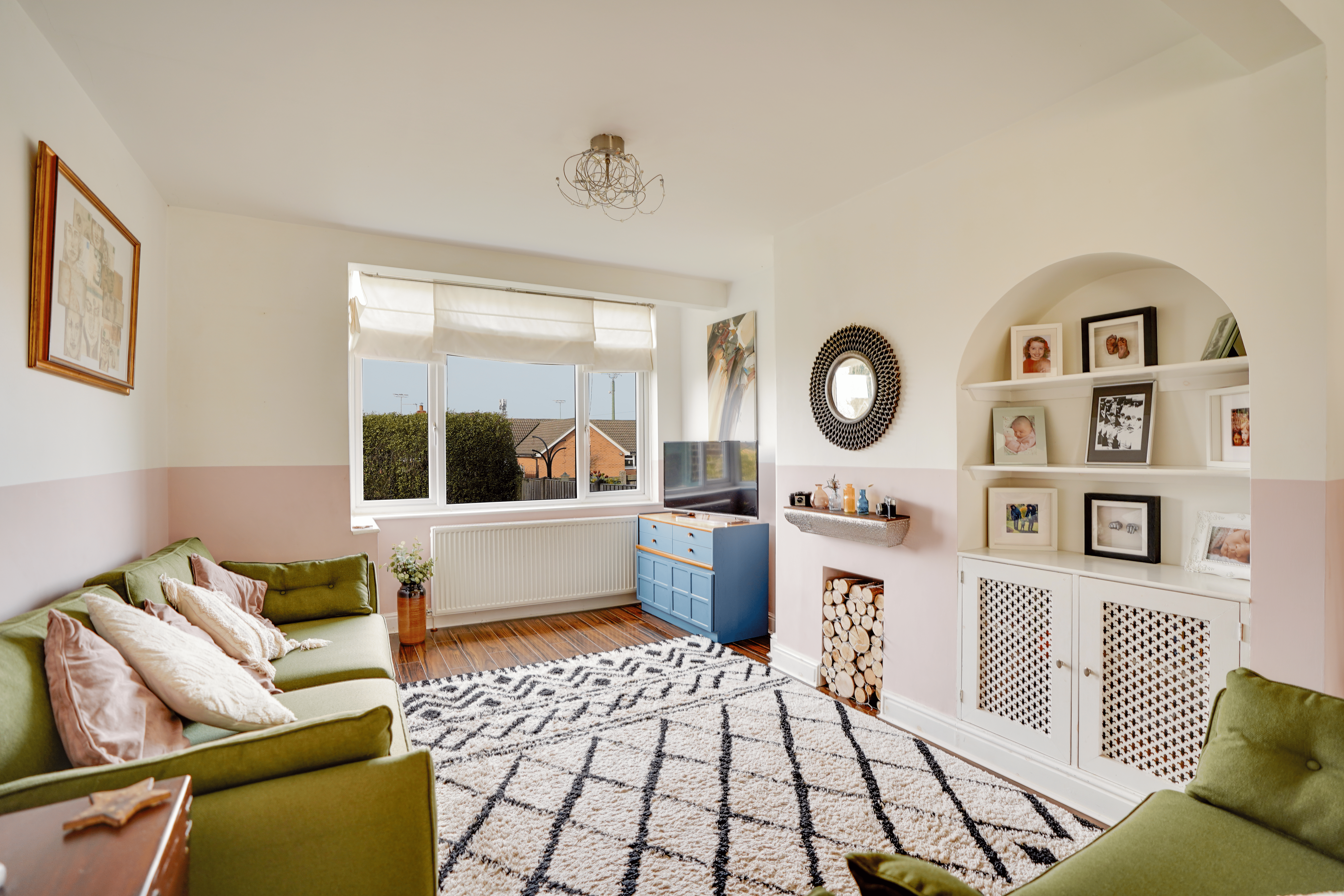 The impressive open-plan sitting and dining room features a charming bay window, creating a bright yet cosy space ideal for both relaxing and entertaining.