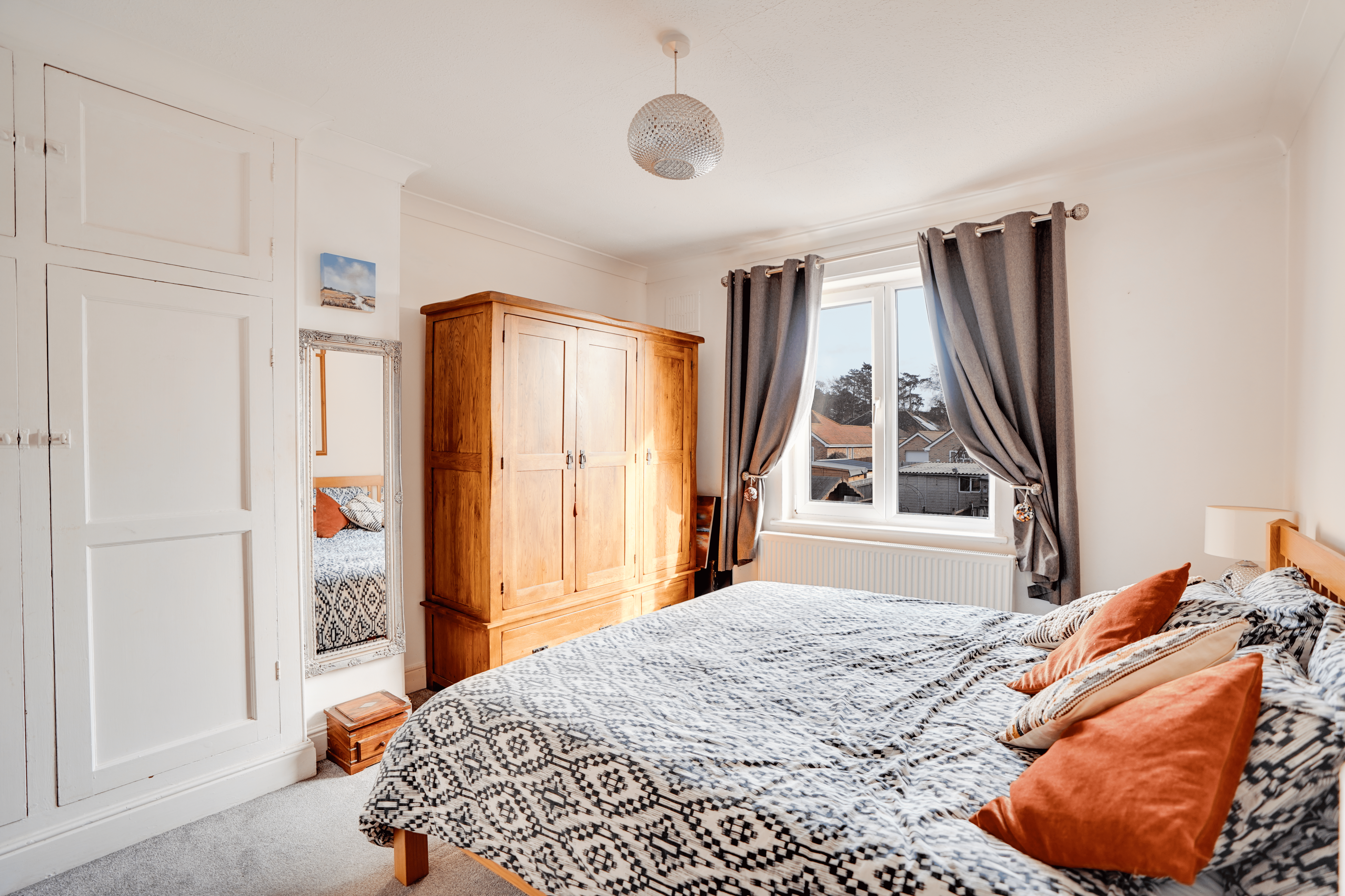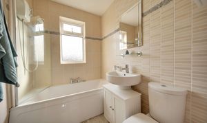 Upstairs, the master bedroom benefits from fitted wardrobes and attractive views over the rear garden. The family bathroom is fully tiled and fitted with a bath with shower attachment over, wash basin, WC and heated towel rail. Bedroom two is a generous double room with a bay window allowing plenty of natural light, while bedroom three offers flexibility as a single bedroom, nursery or dressing room with a front aspect window.