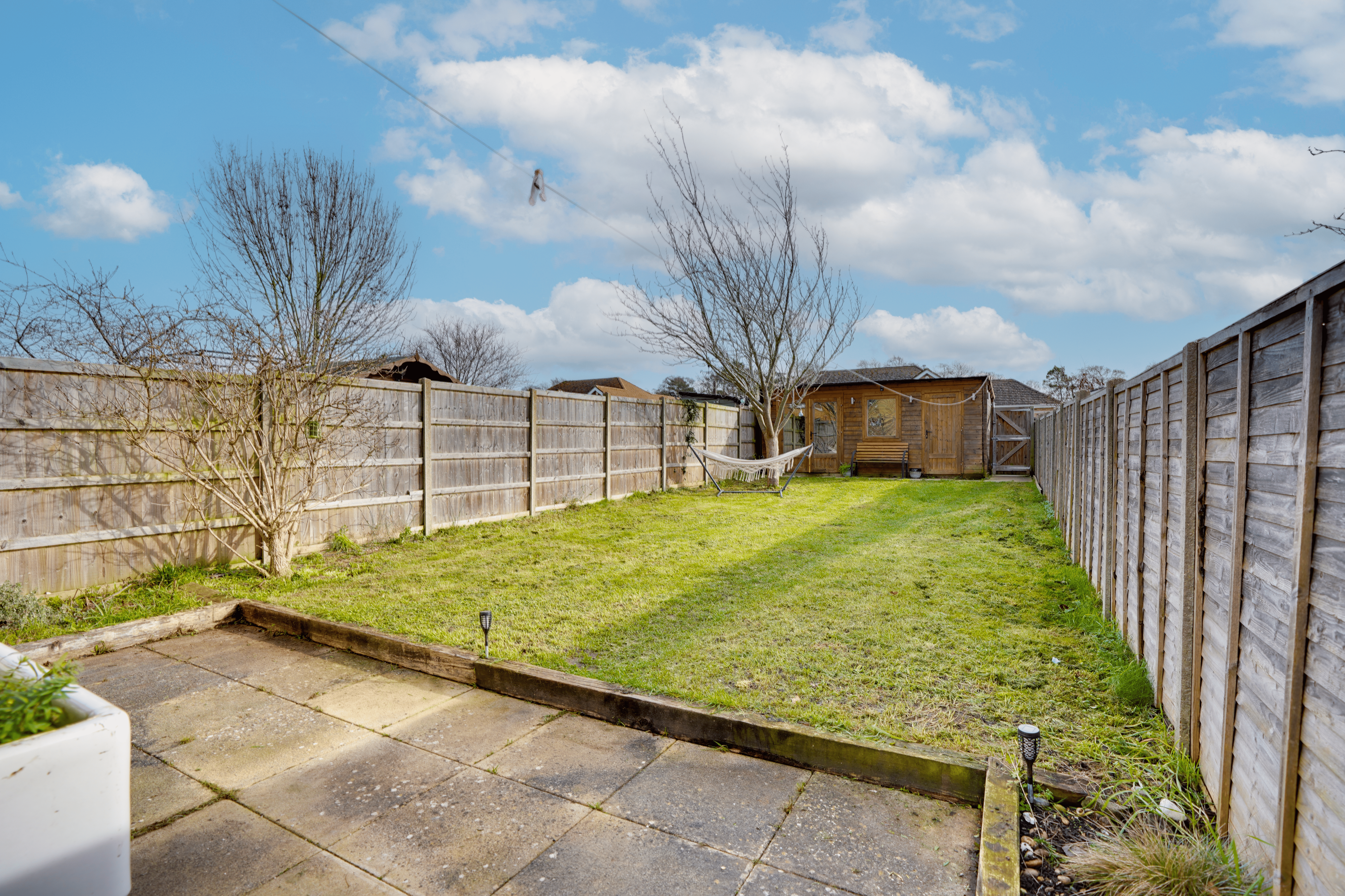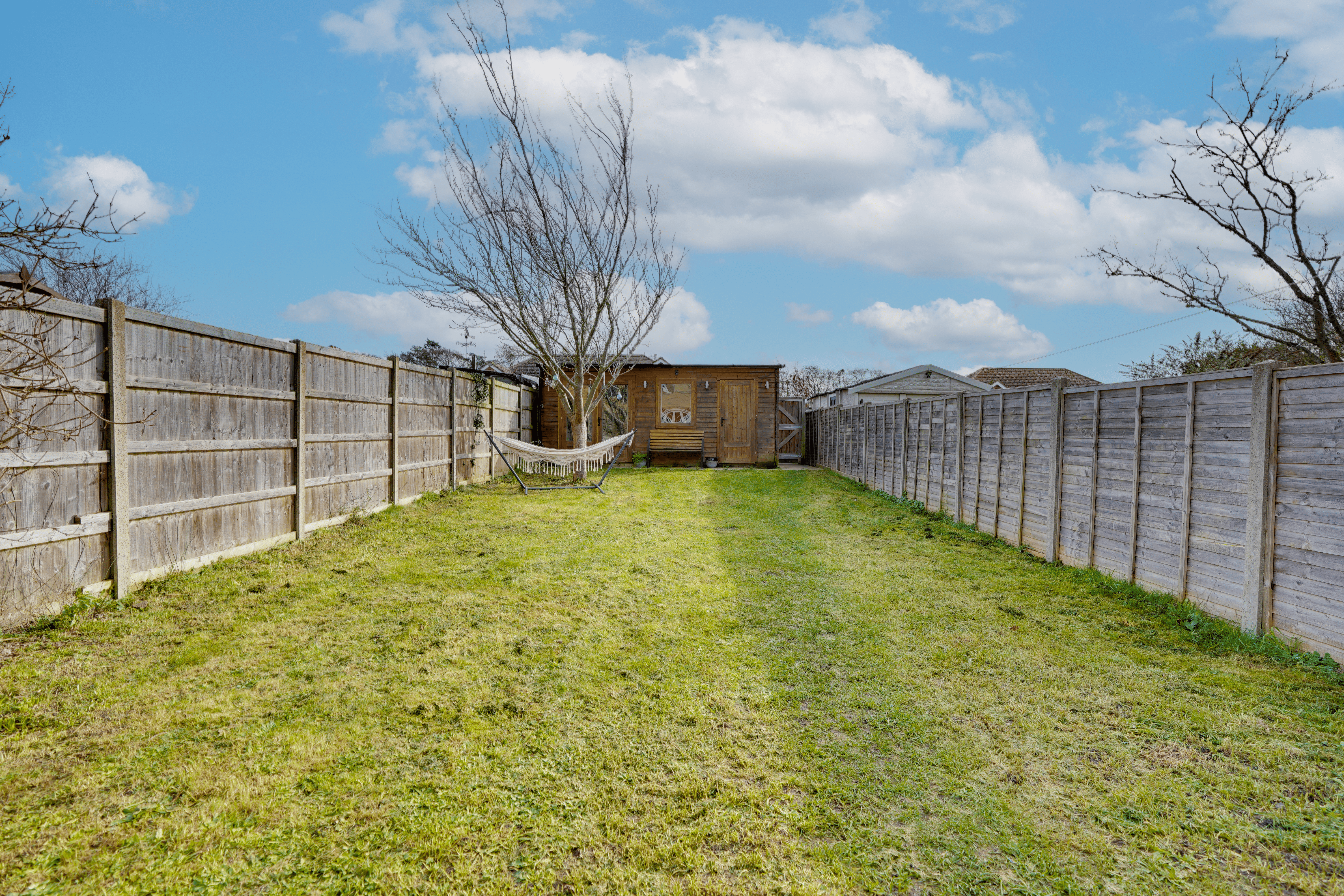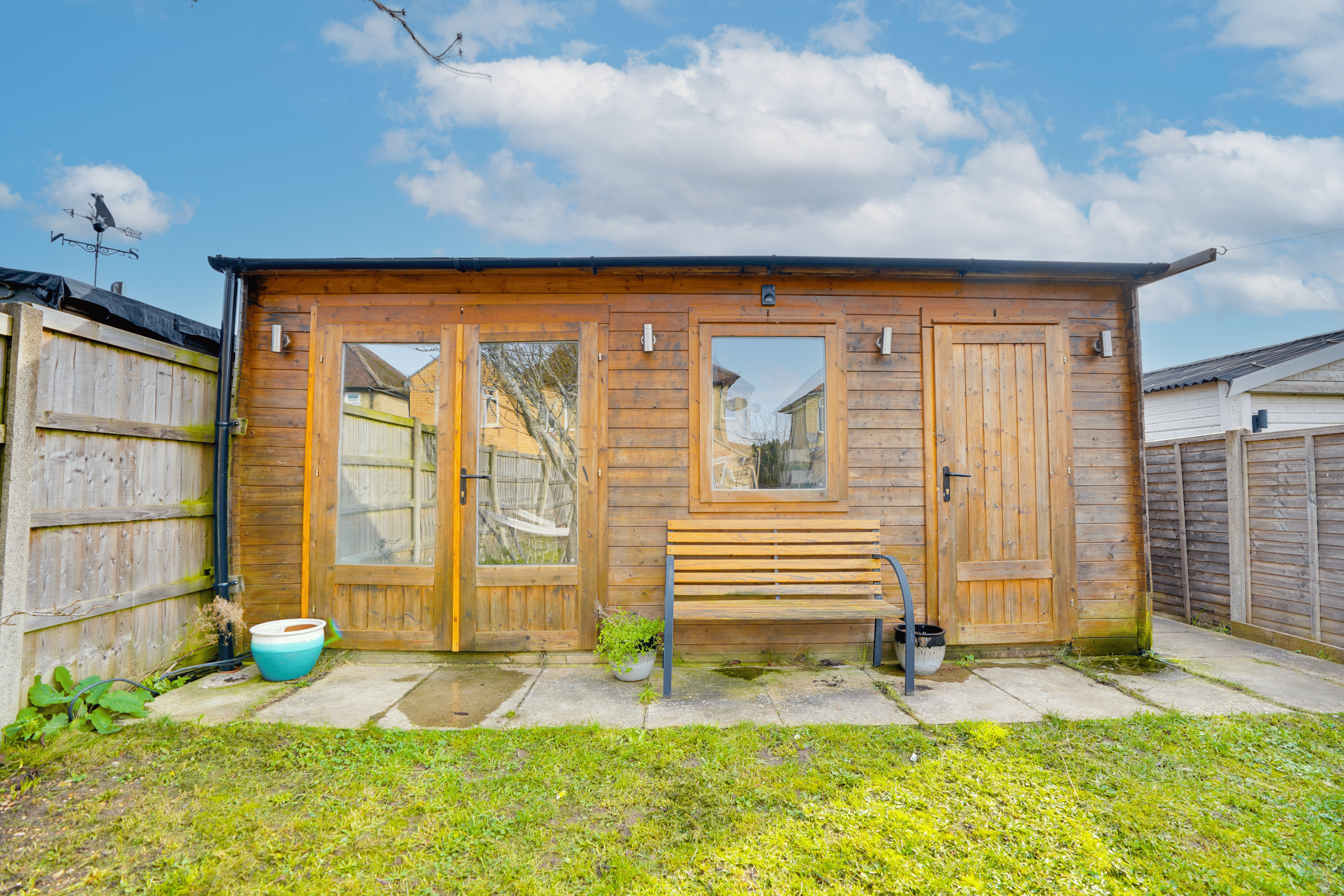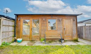 Externally, the property is approached via a gate leading to a predominantly lawned front garden with hedge borders and side access. The rear garden enjoys a patio area ideal for al fresco dining, leading to a private lawn enclosed by 6ft concrete posts and fencing. A particularly useful outbuilding is currently arranged as half home office and half storage space, complete with power and lighting, and a side gate provides access to off-road parking for two vehicles.