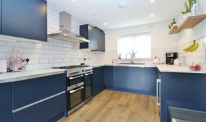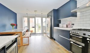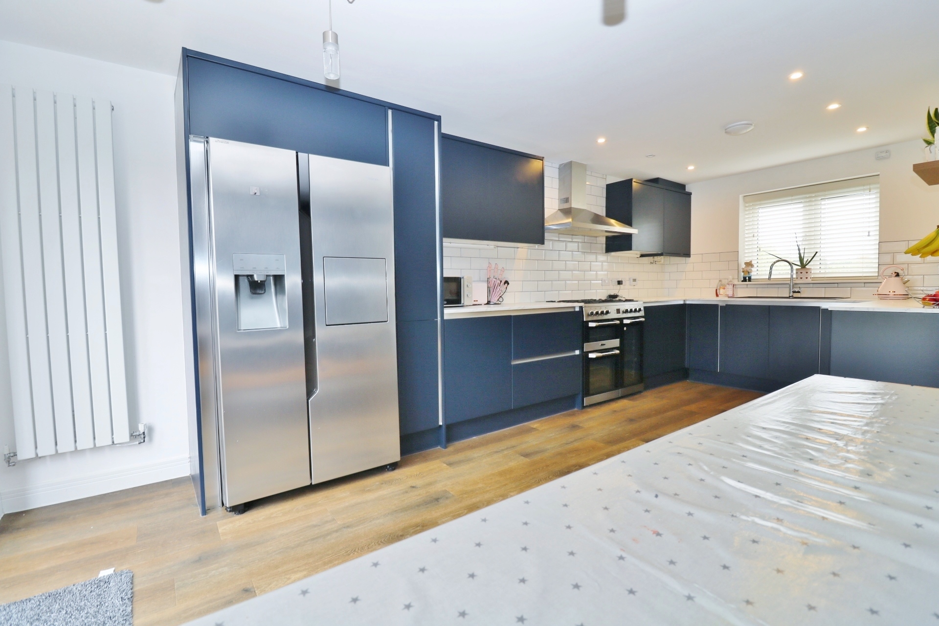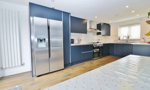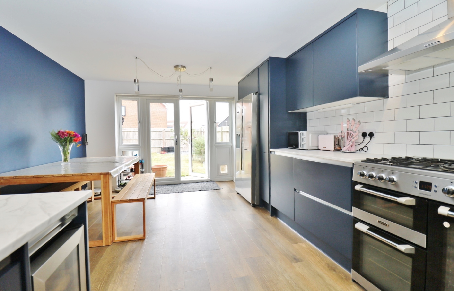 The modern kitchen/diner has been fitted with a stylish range of wall and base units with a Range style cooker (included) with extractor over, an integrated dishwasher, wine cooler and appliance space for an American style fridge/freezer. There is a window to the front and French doors from the dining area leading out to the garden.