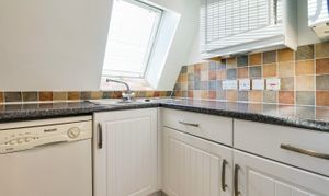 Offering plenty of storage, work surface space and expected appliances, the kitchen is located off of the main entrance hall.
