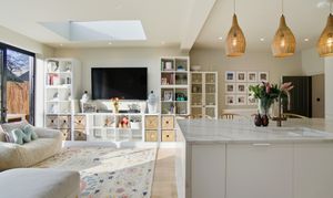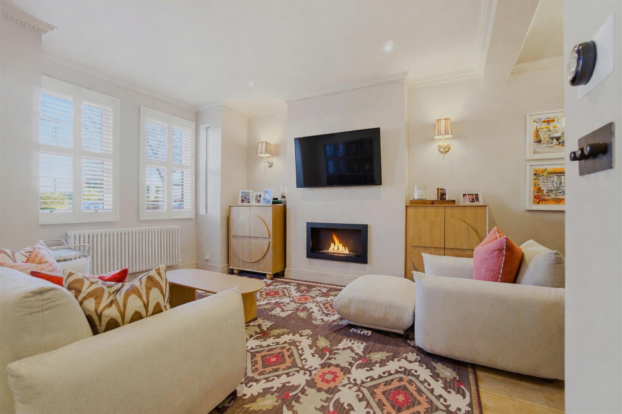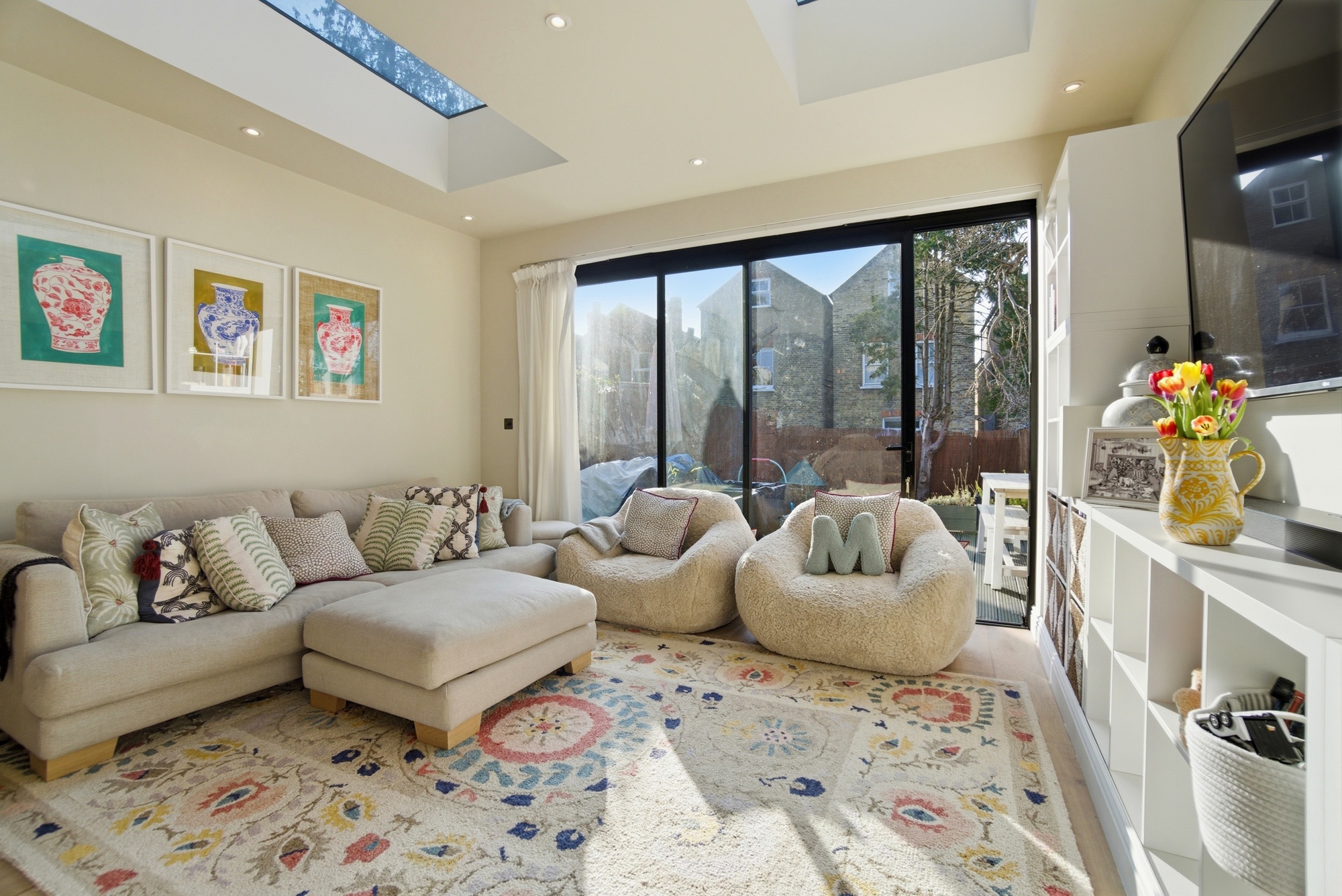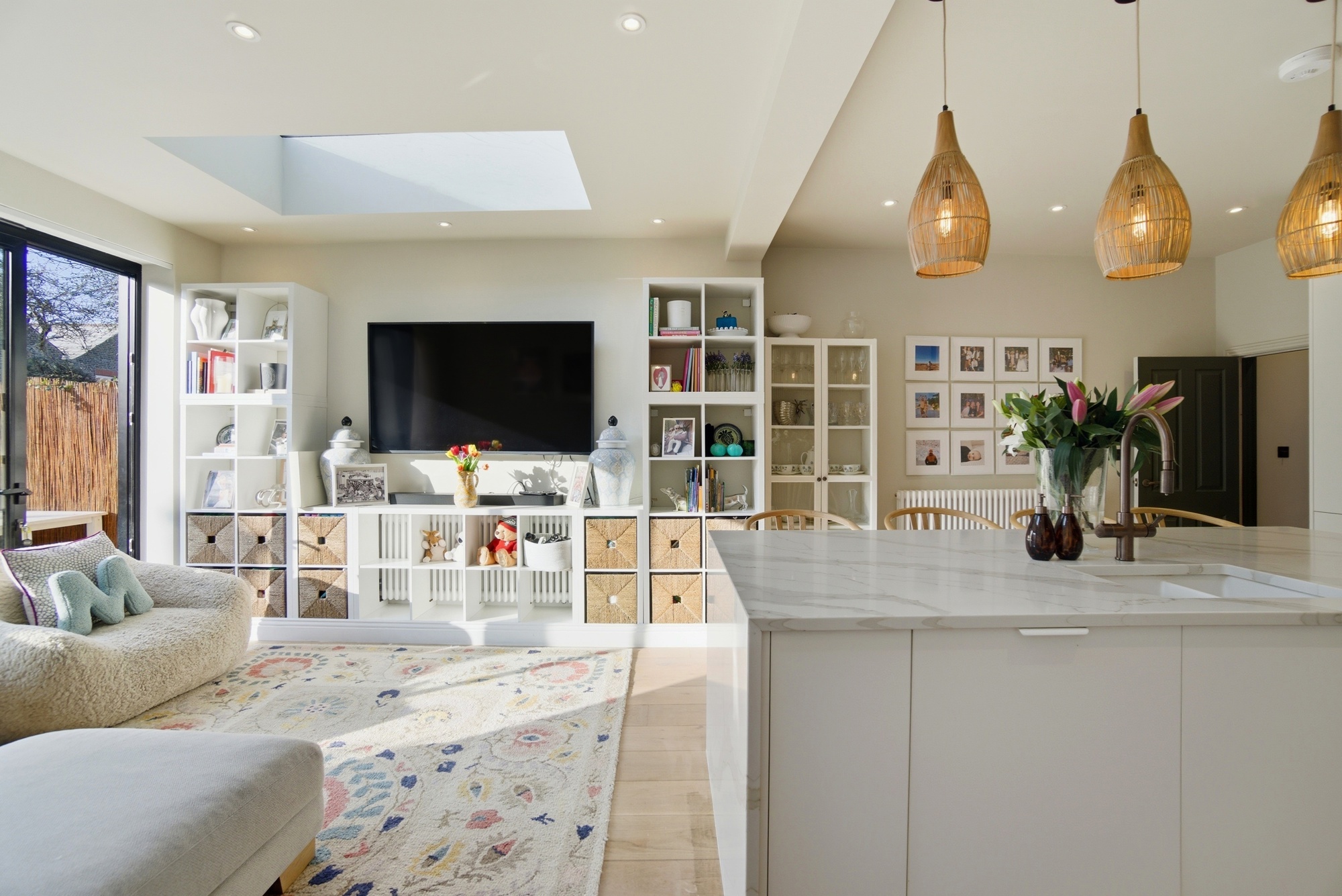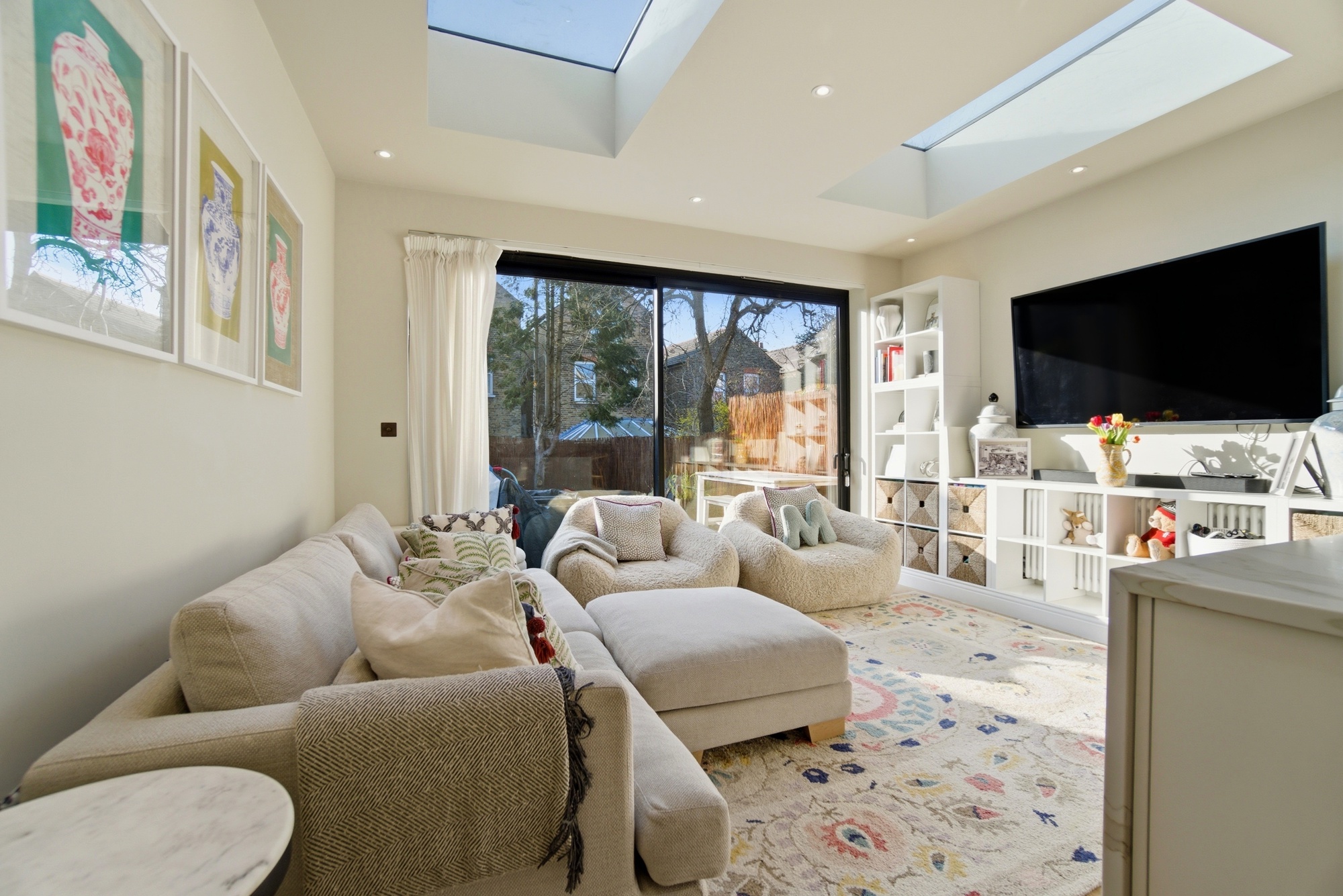 The ground floor opens into a welcoming entrance hall with guest cloakroom and staircase rising to the upper floors. To the front, an elegant reception room with a bay window provides a comfortable setting for both relaxation and entertaining. To the rear, the house opens into a superb open-plan kitchen and breakfast room forming the heart of the home. Designed with both style and practicality in mind, the space enjoys excellent natural light from overhead skylights and wide sliding doors that lead directly onto the terrace and garden beyond.