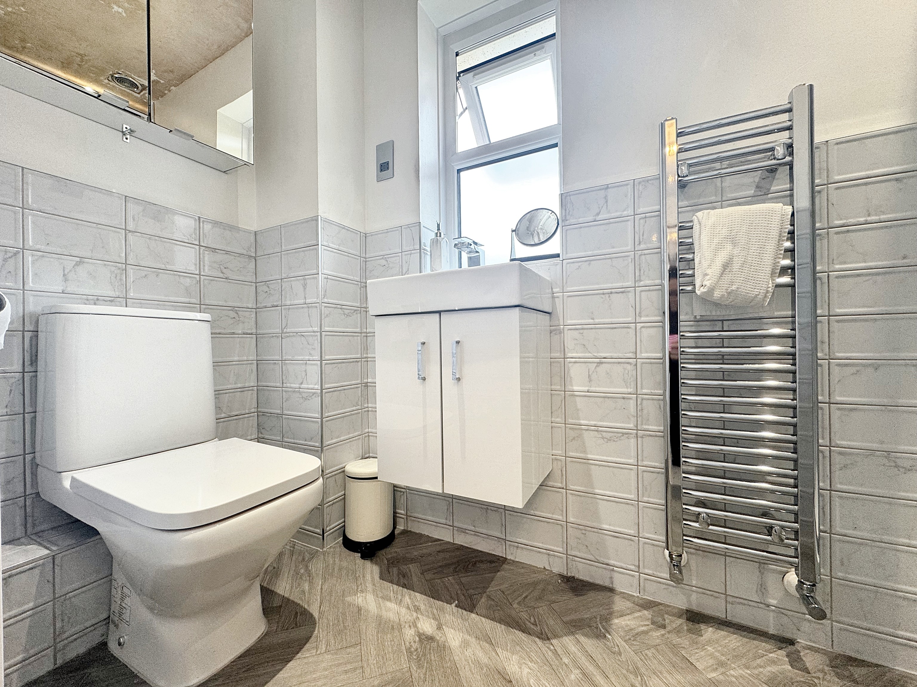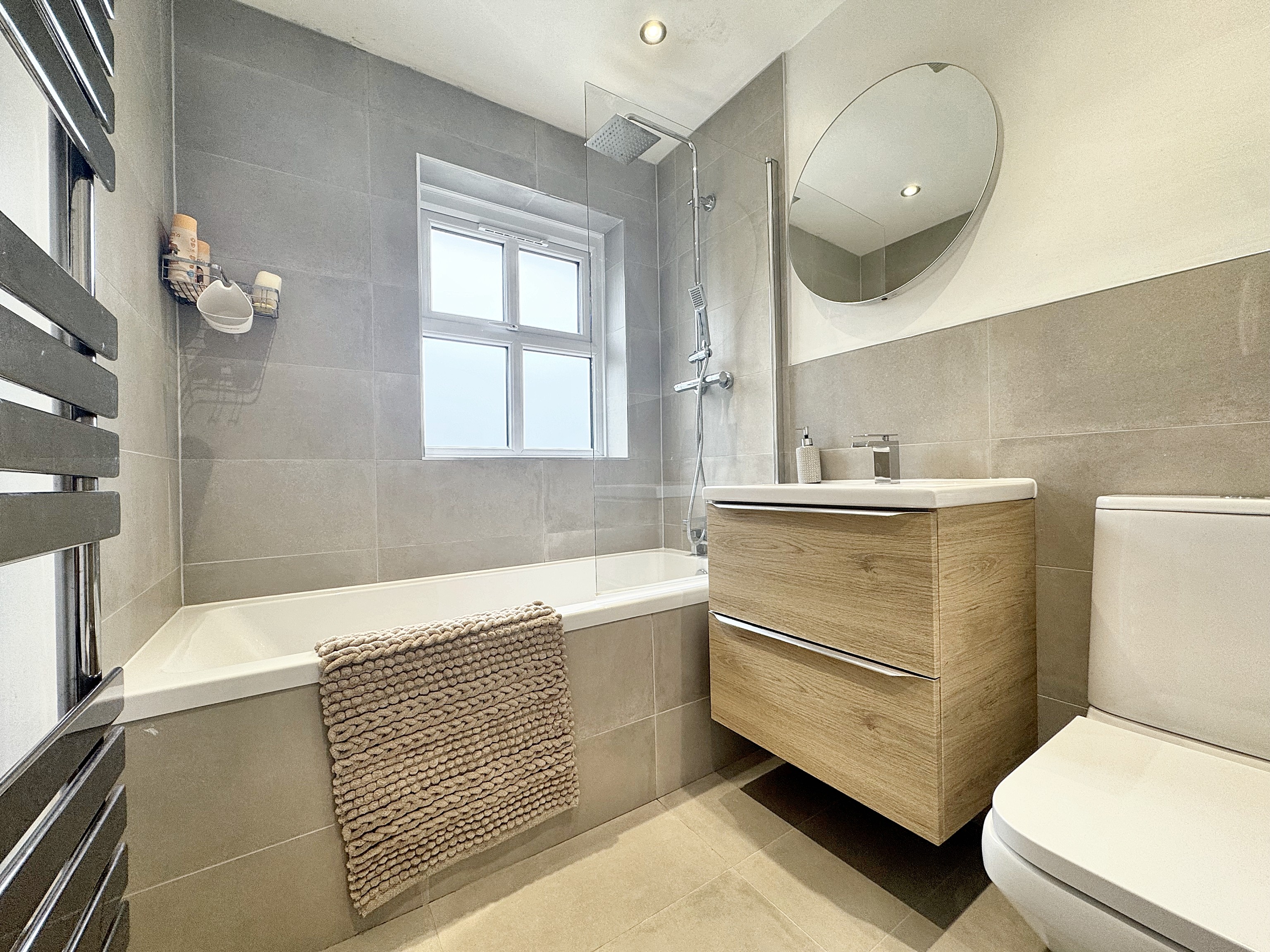 Modern bathroom suite comprising of shower over bath, low level W.C and wash basin with storage drawers. Towel rail.