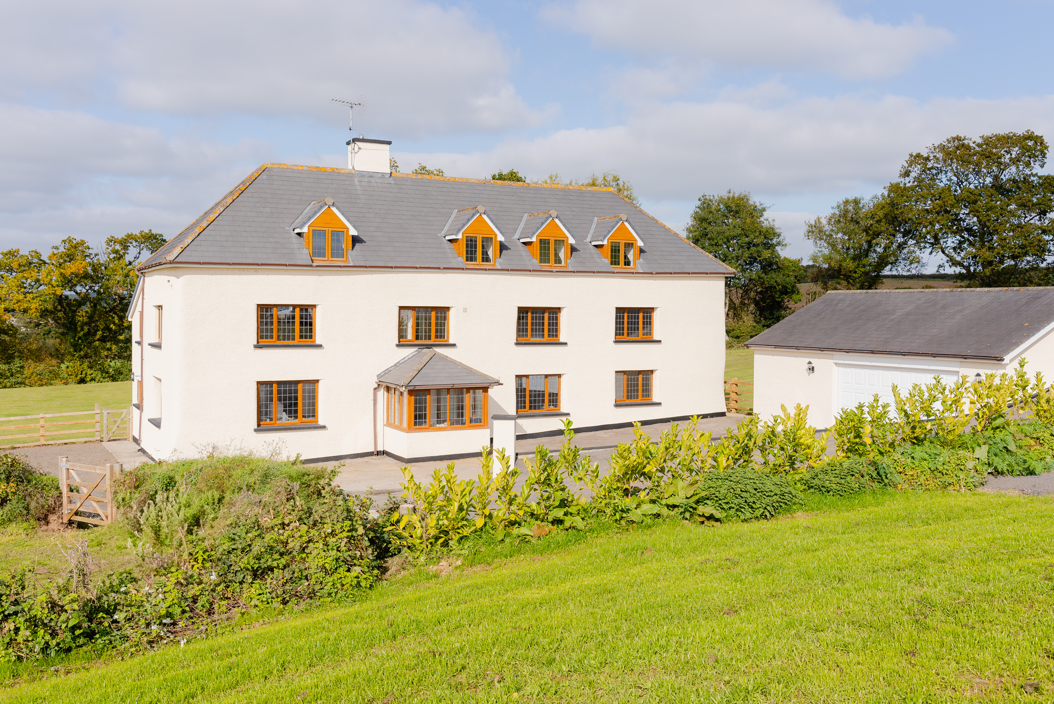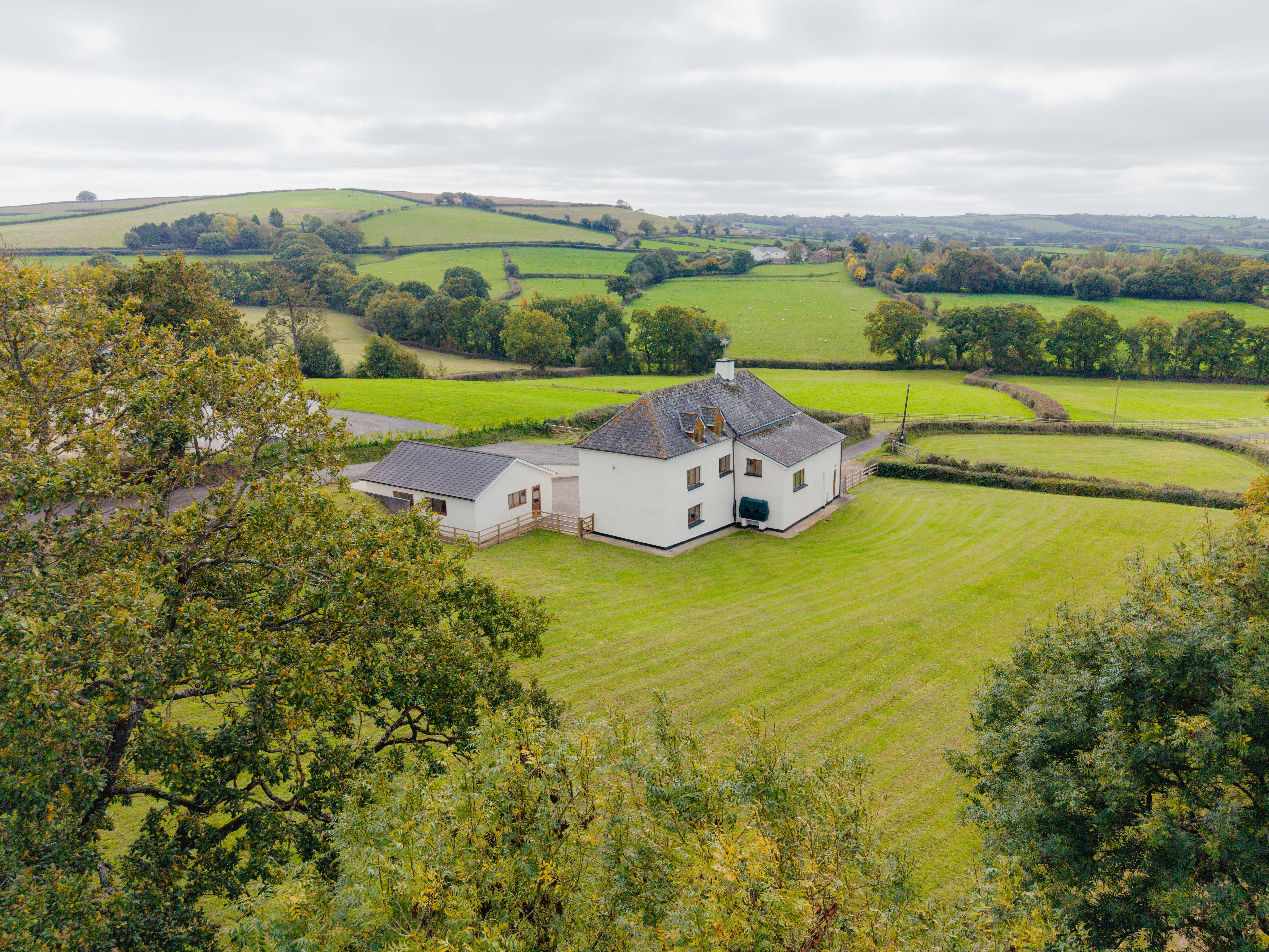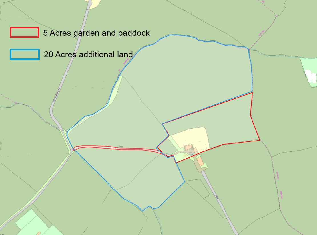 Outside, the property enjoys a private setting approached via a private, sweeping drive, with ample parking and a substantial double garage/workshop. The level gardens adjoin the house to the rear and are adjacent to the paddocks. Three separate paddocks (and the gardens) form the five acre package, perfect for grazing, hobby farming or simply enjoying the peaceful setting. For those looking to expand, further land of up to twenty acres can be purchased by separate negotiation.