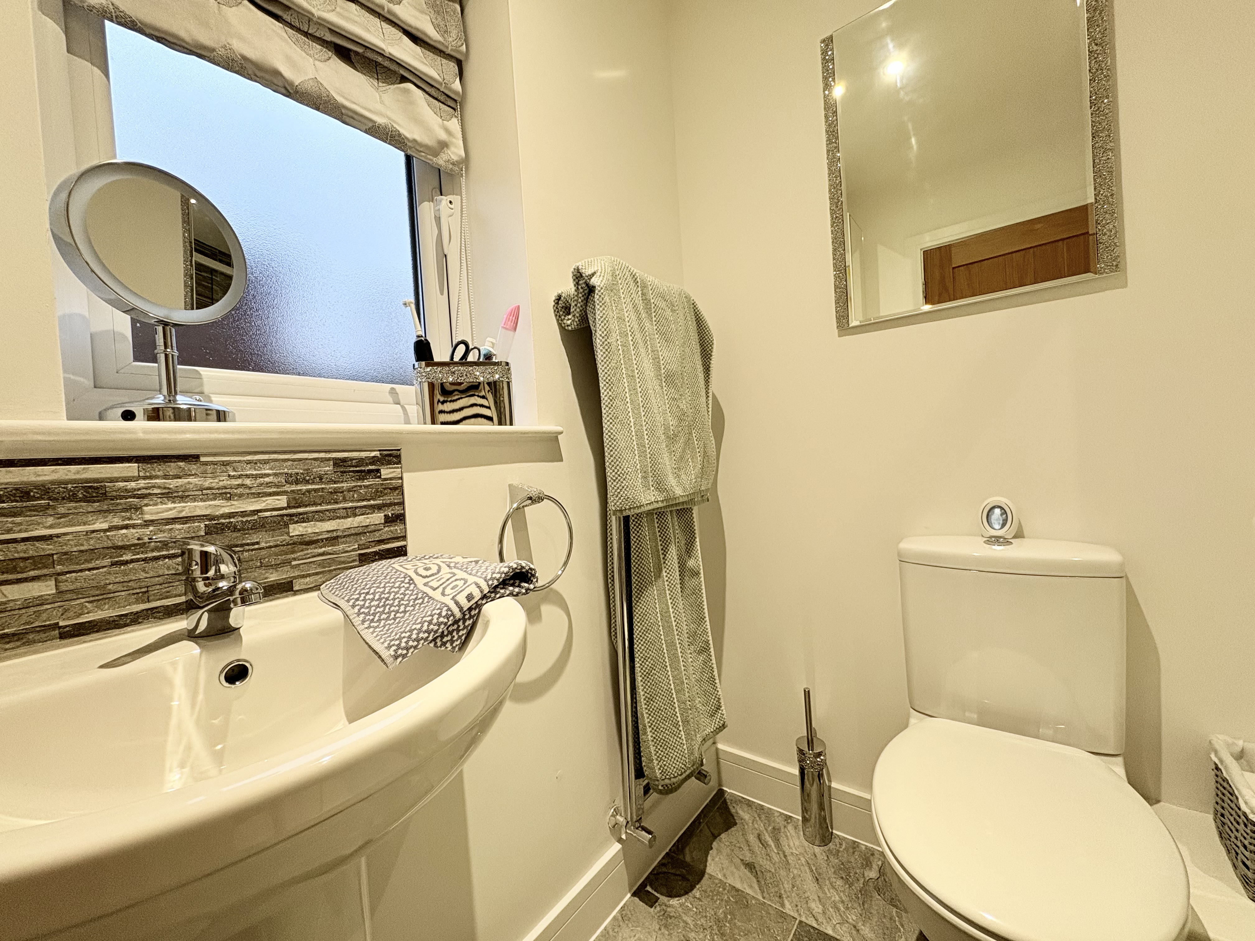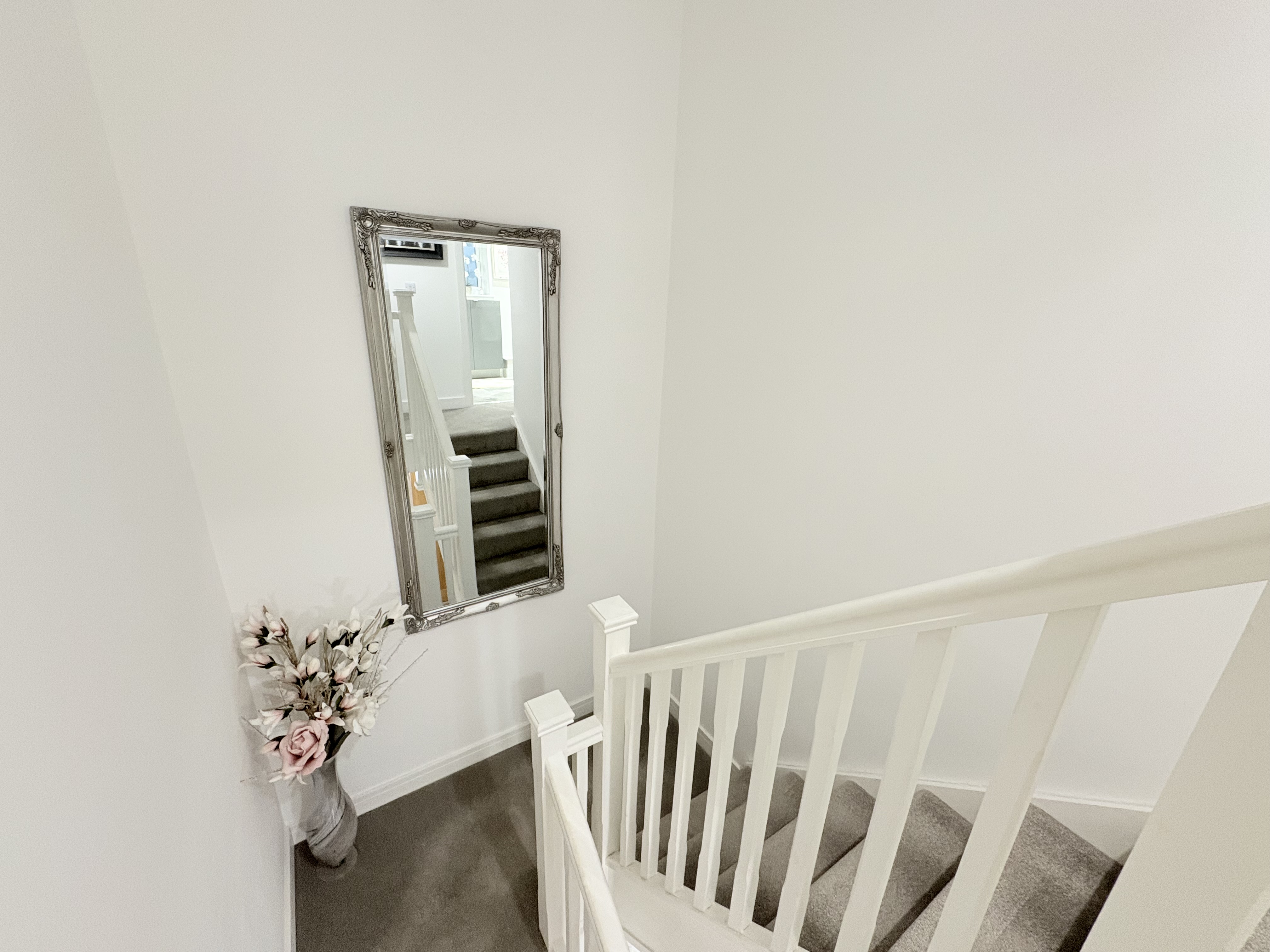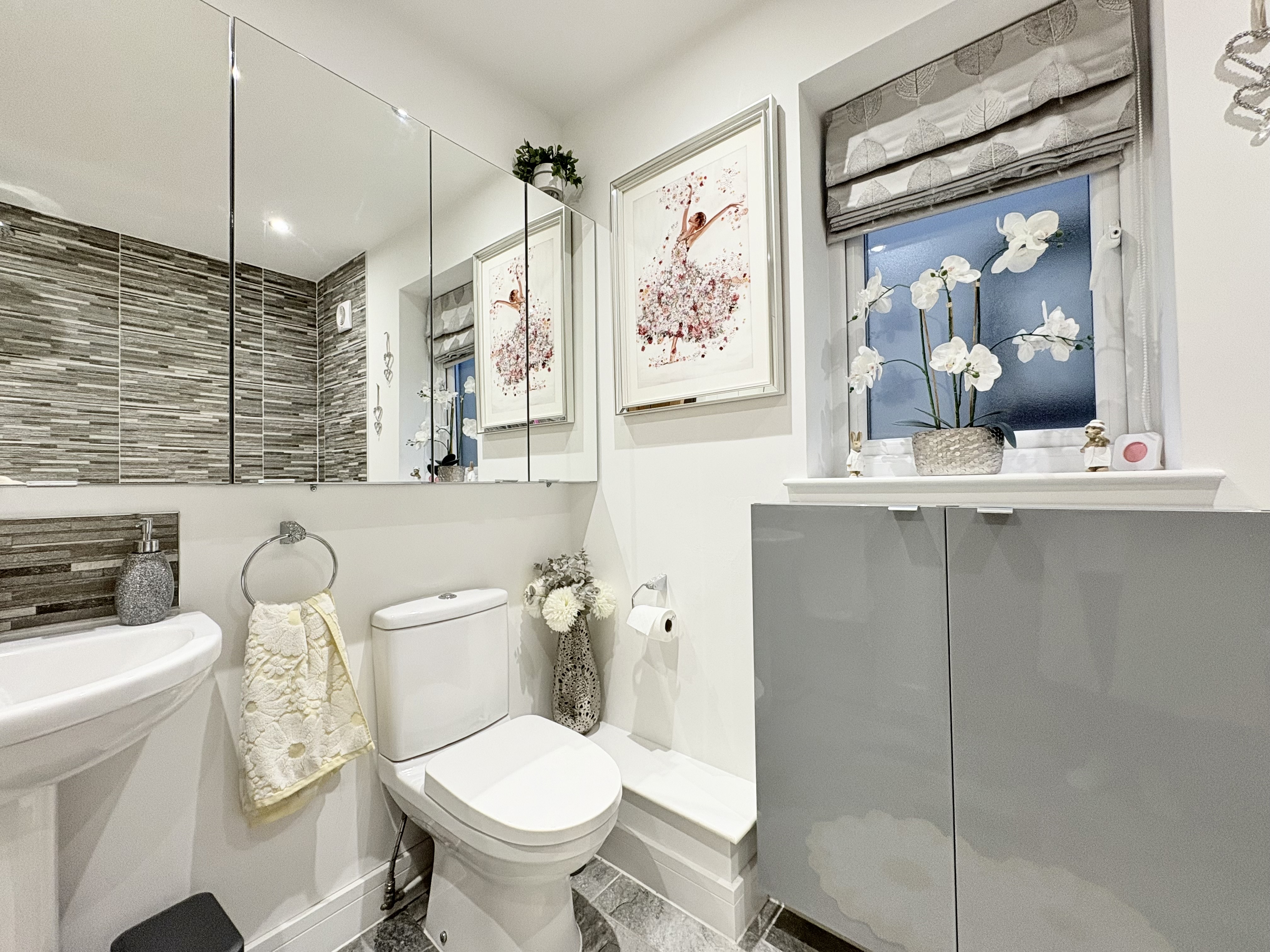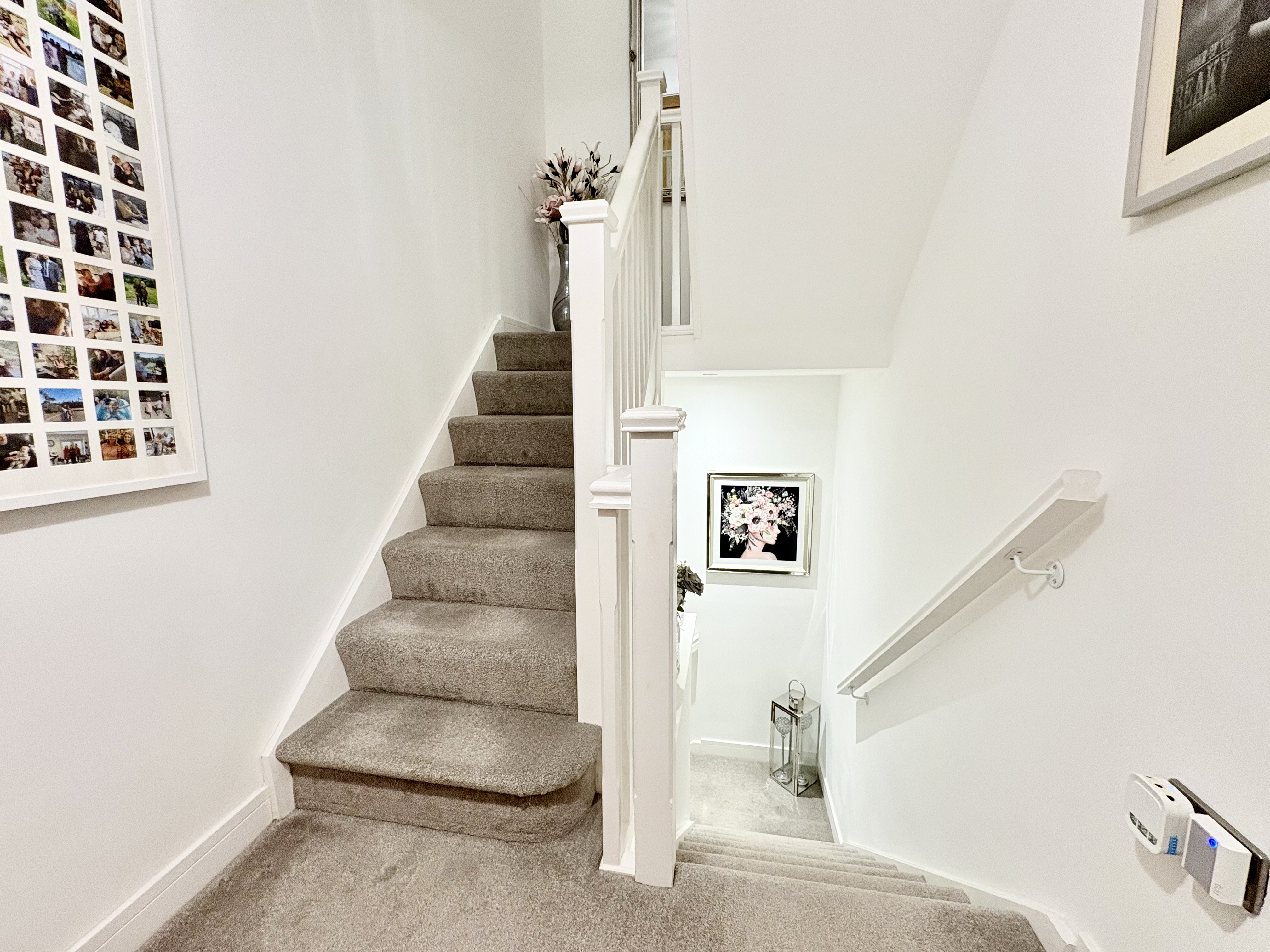 As you enter through the ground floor, you are greeted by a stunning interior, complete with a convenient internal garage capable of fitting one car. Moving to the first floor, the space opens up to reveal a well-appointed w/c, a practical storage cupboard, a spacious kitchen/diner boasting integrated appliances with an inviting island with a breakfast bar, and ample room for a dining table and chairs. The patio doors beckon you to step outside to the landscaped rear garden, where relaxation and entertainment meet seamlessly. The cosy living room has been decorated to a superb standard and offers a lovely Juliette balcony.