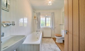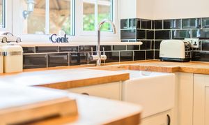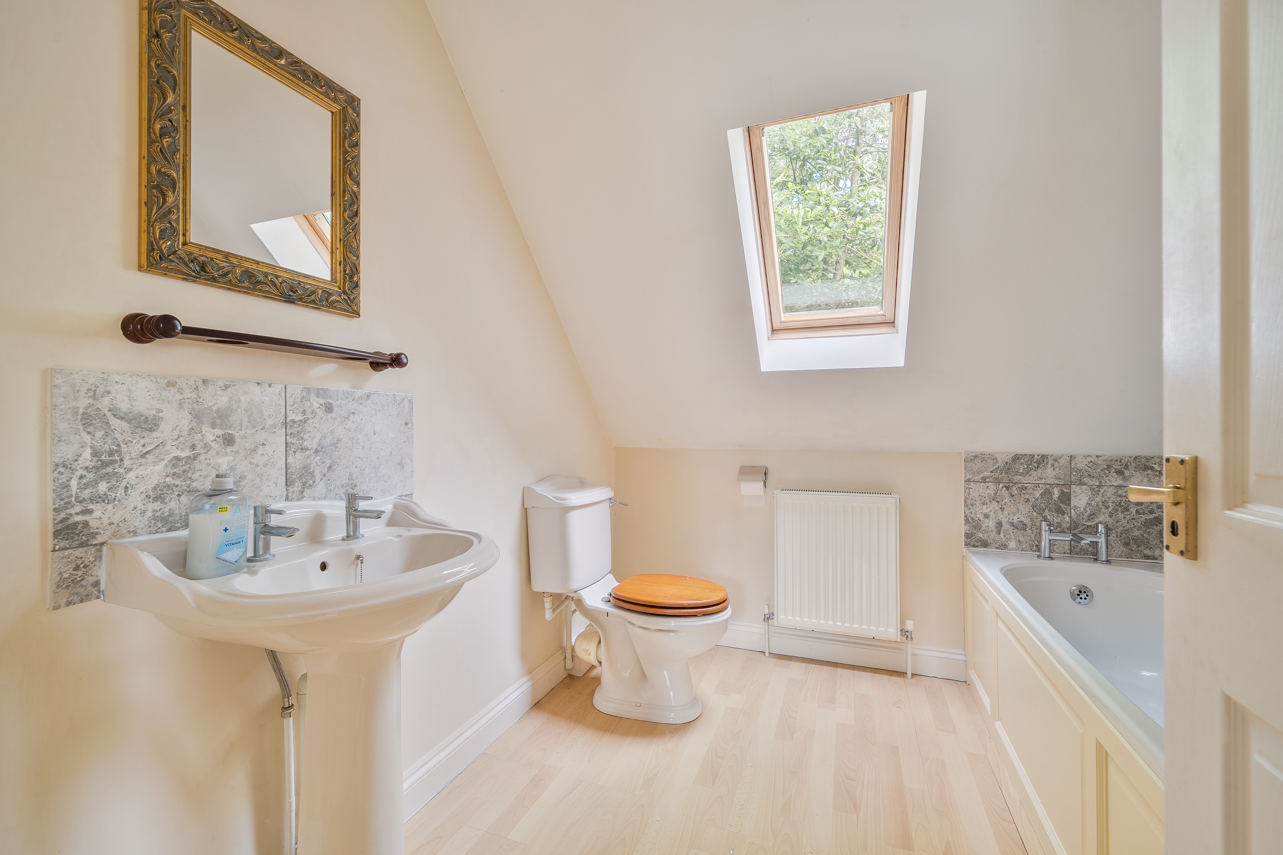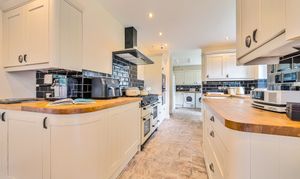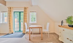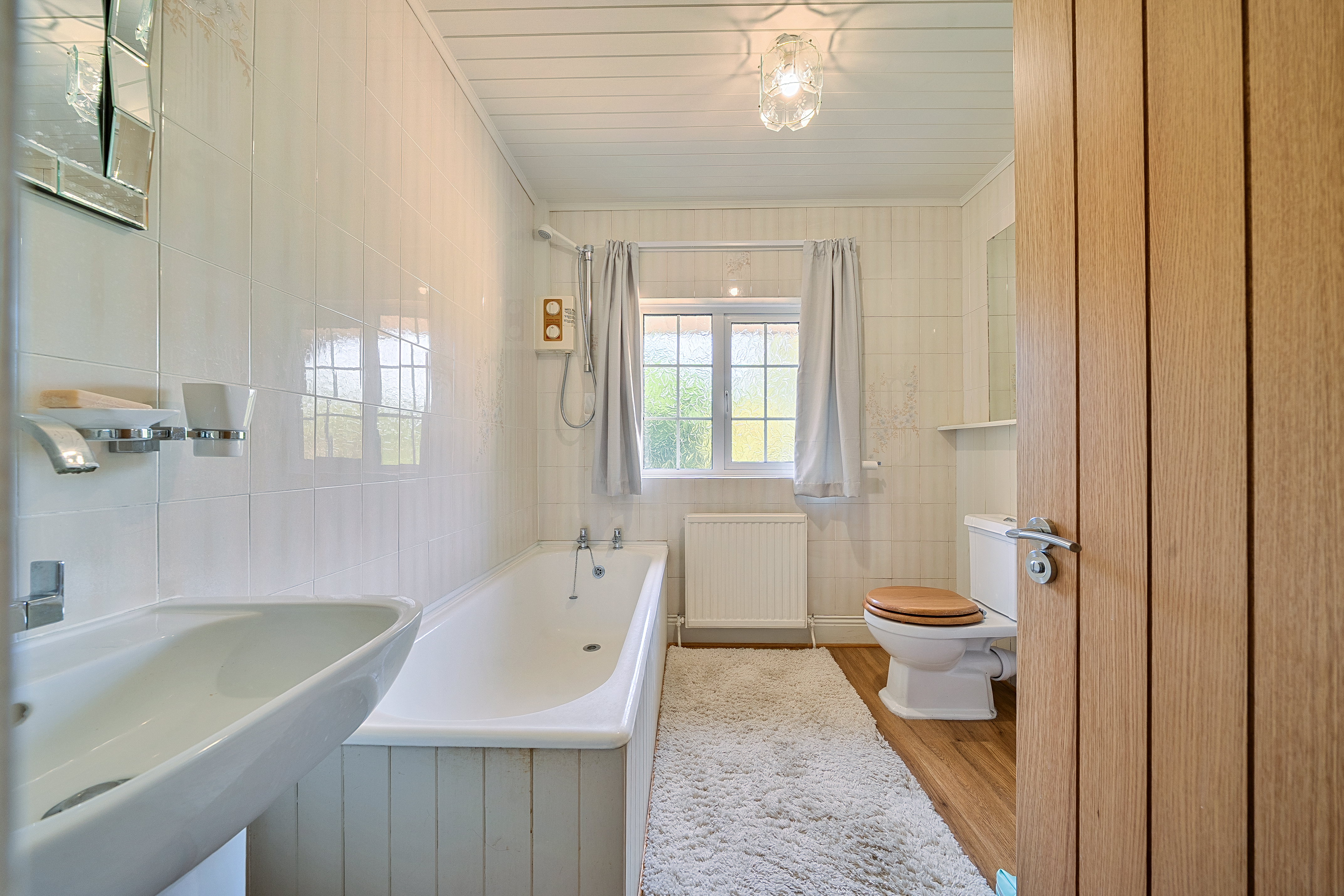 At the heart of the home is the kitchen which has a beautifully crafted, shaker style units with solid oak worktops. Integrated appliances include a dishwasher, twin oven microwave combination and there is space for a range cooker. There is also a sociable dining area—an ideal space for both everyday living and hosting guests. Seamlessly blending indoor and outdoor living, French doors from here open on to a spacious decked terrace - the perfect spot for a morning coffee or summer’s BBQ.