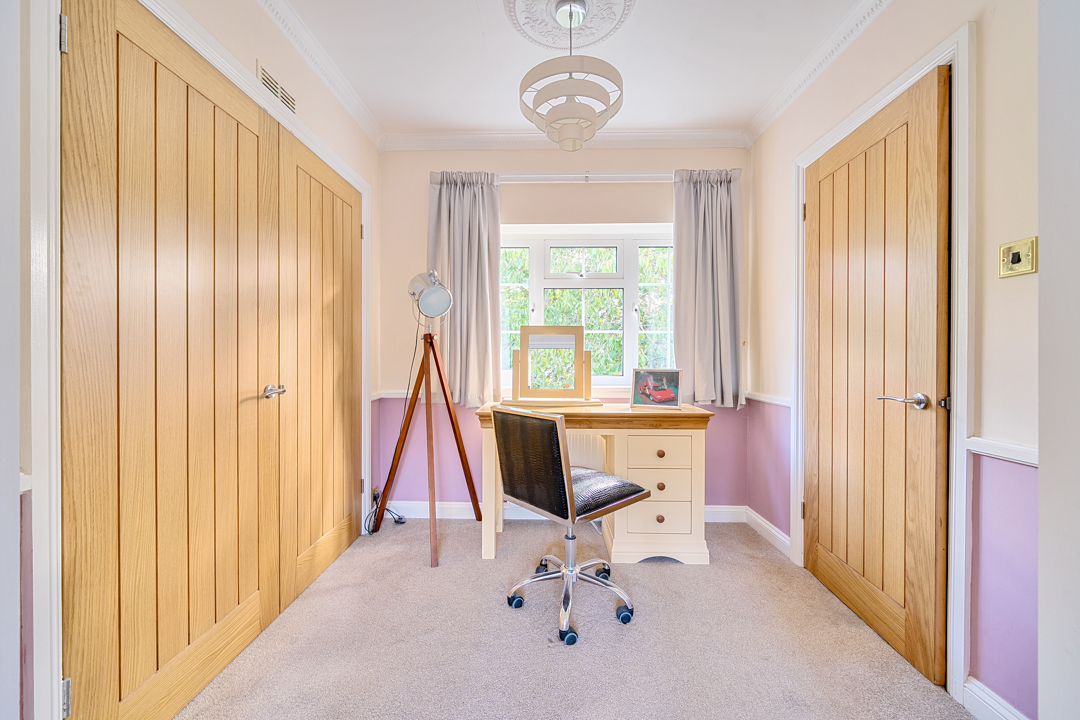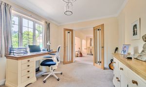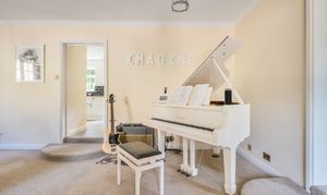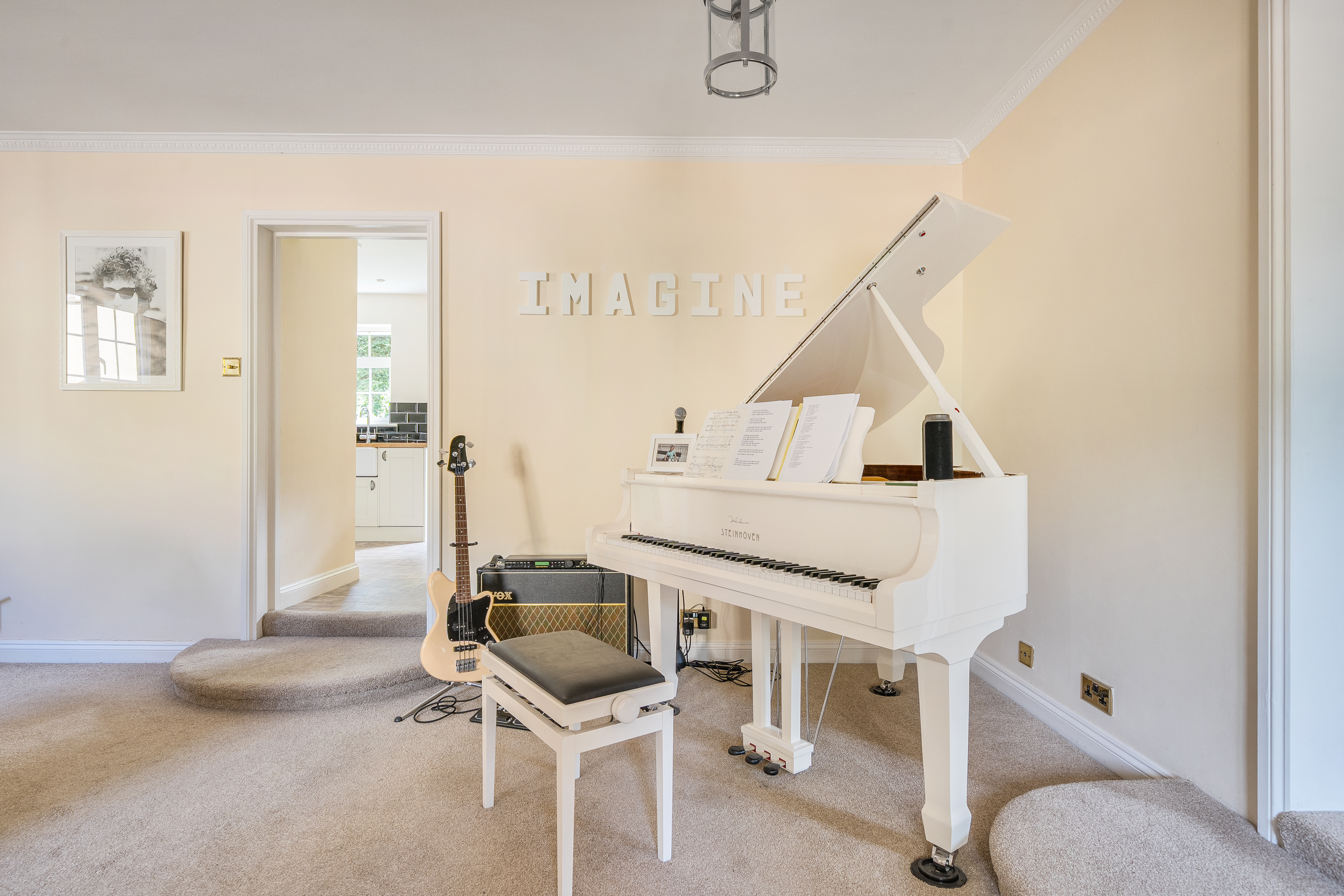 Stepping inside the welcoming front door, the generous and well-balanced layout begins with a bright and spacious entrance hallway, providing a welcoming first impression and access to all principal rooms. To the right the dual-aspect living room features French doors to a raised decked terrace, ideal for entertaining or relaxing, To the left a study/music room and formal dining room create a versatile flow of semi-open plan living spaces, perfect for modern family life.