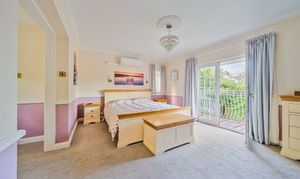 Upstairs, the principal suite is a luxurious retreat, complete with a private balcony, dressing area with fitted wardrobe, air conditioning and an en-suite bathroom. There are two further double bedrooms, two single bedrooms, and a modern family bathroom with white 3 piece suite.