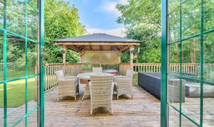 Externally, the gardens are a true highlight—wonderfully private, extensively landscaped, and impeccably maintained. The rear garden is predominantly lawned, with a raised decked patio and a charming pergola housing a hot tub, creating an ideal outdoor retreat.
