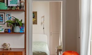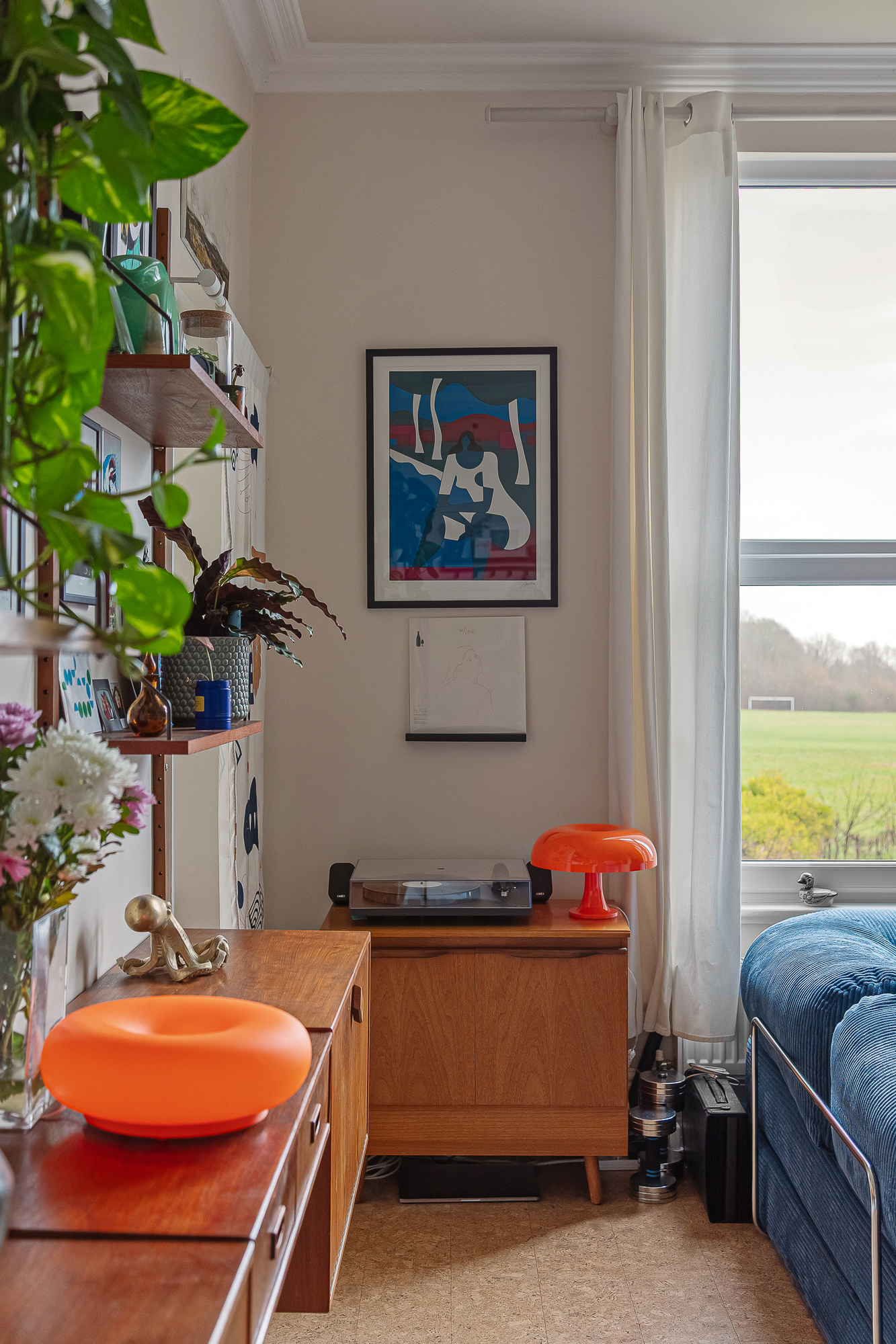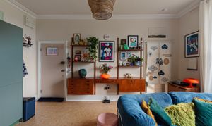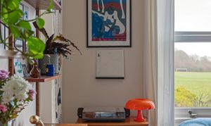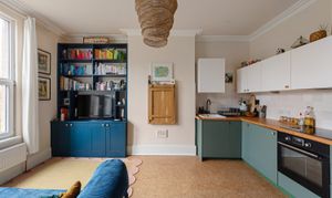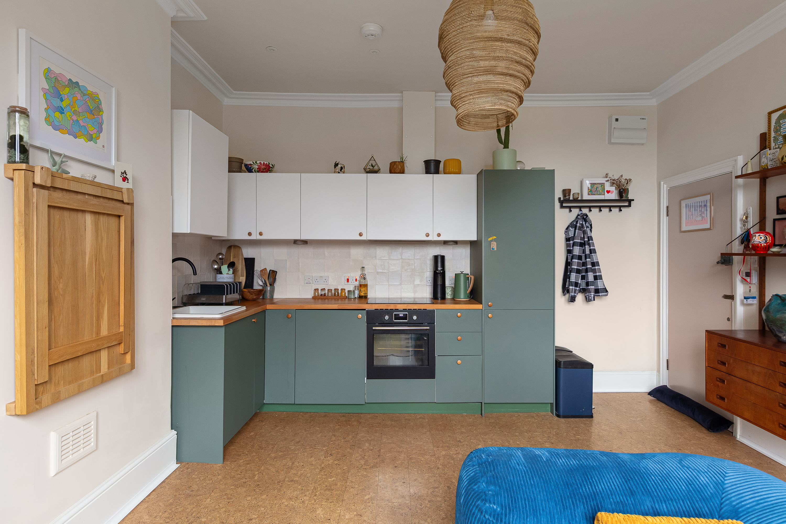 The layout works beautifully. There’s room to properly zone the space — a relaxed seating area, space for dining or working from home, and a kitchen that feels integrated rather than intrusive. Finishes are clean and contemporary, allowing the architecture and the view to do the heavy lifting. It’s the kind of room that feels just as right for slow mornings with coffee as it does for evenings with friends and candles lit. The cork floor, fold-down table, cabinetry, high ceilings and period touches like the cornicing blend clever modern materials with thoughtful design, and it is all just so Goldilocks, a blend that is just so perfect.