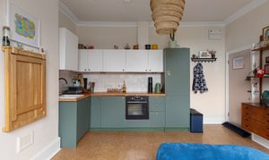 The open-plan kitchen and living space form the heart of the flat, which is a stunningly bright space; large (double-glazed) windows dominate the room, drawing your eye outward and framing a lush, leafy outlook that feels more countryside than Zone 3 London. The sense of visual depth here is rare — greenery rolls away in the distance, changing with the seasons, and bringing an ever-present calm to the space.