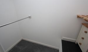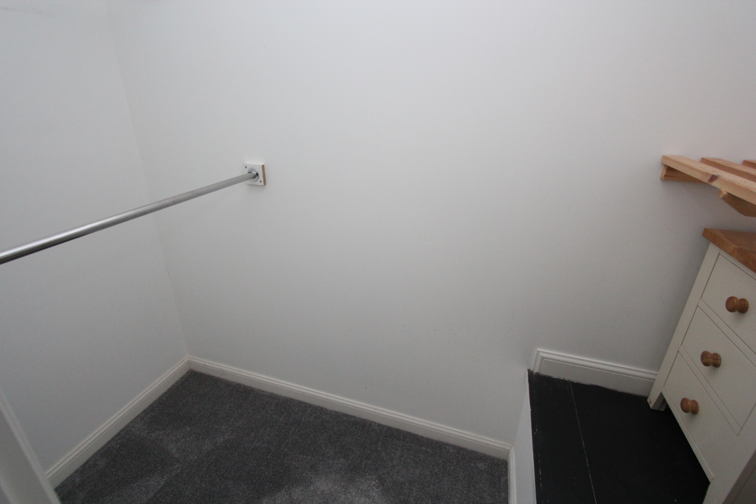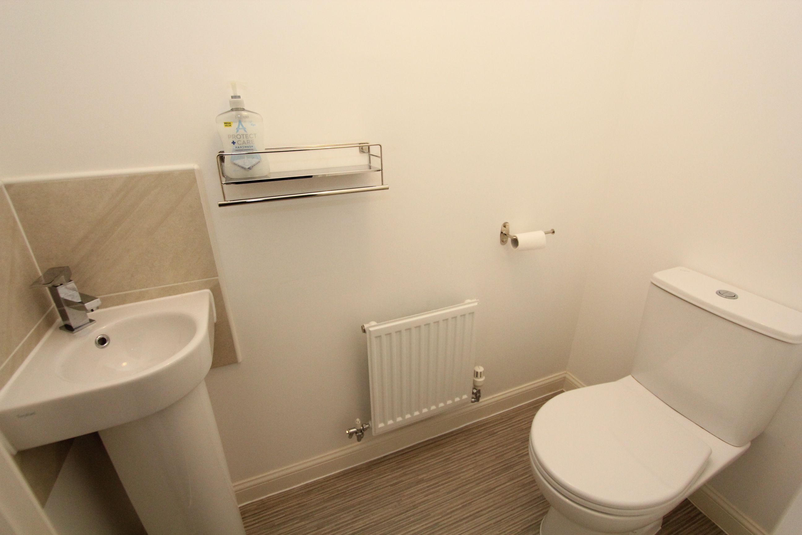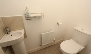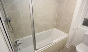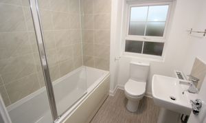 UPVC opaque window to rear. Low level WC. Pedestal wash hand basin with mixer tap. Panelled bath with mixer shower over. Radiator.