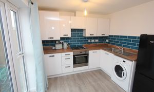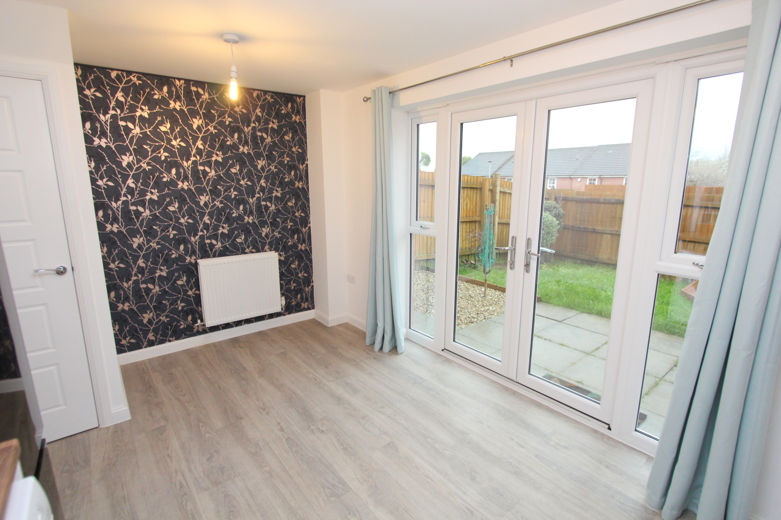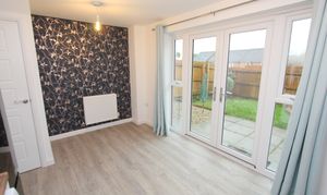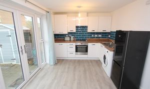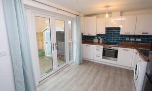 UPVC French doors to rear. Radiator. Under stairs cupboard. Fully fitted kitchen comprising eye level units base units with drawers and work surfaces over. Inset stainless steel sink with mixer tap. Integrated gas hob with oven. Wall mounted combination boiler providing the central heat and hot water. Space for white goods. Partially tiled walls.