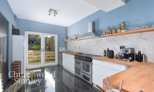 Move through to the heart of the home, and you’ll find an open-plan kitchen and dining area that is both practical and stylish. A large solid wood dining table sits beneath industrial-style pendant lighting, creating an inviting spot for meals and conversation. Feature mirrors enhance the sense of space, while the sleek white cabinetry, butcher block countertops, and marble-effect splashbacks strike a perfect balance between contemporary and warm. The stainless steel range cooker is ideal for those who love to cook, while the breakfast bar and spacious pantry—concealed behind stylish sliding black doors—add both function and flair. At the rear, large double doors open directly onto the garden, seamlessly blending indoor and outdoor living.