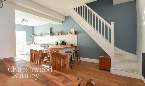 The living room is an elegant and with natural light via its bay window to the front elevation. There is solid interlocking wood flooring under foot and a feature wrought iron fireplace with tile hearth and timber mantle here. An internal glazed door leads into the spacious kitchen / diner at the rear of the home.