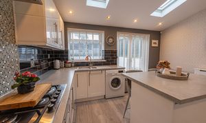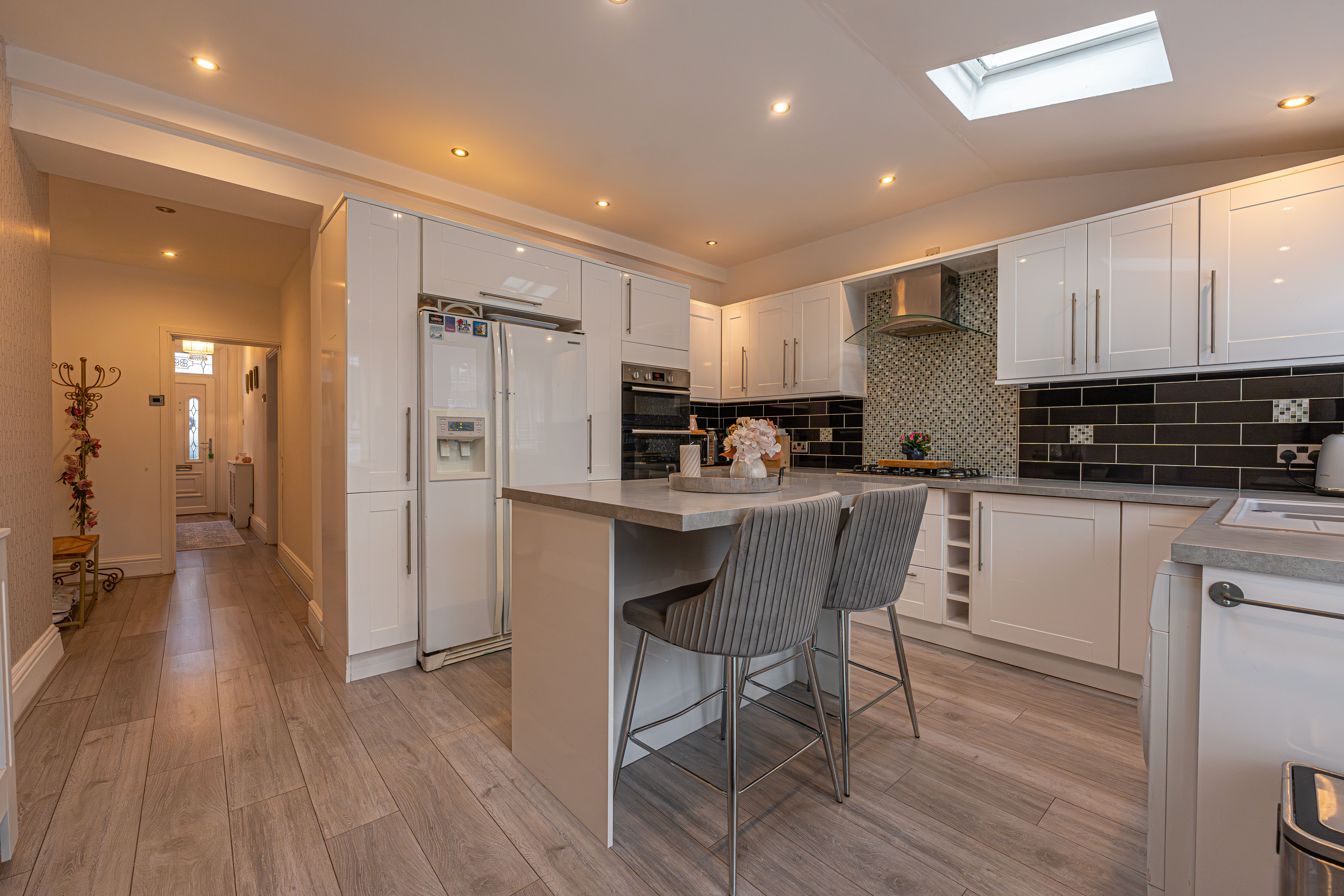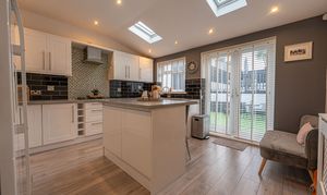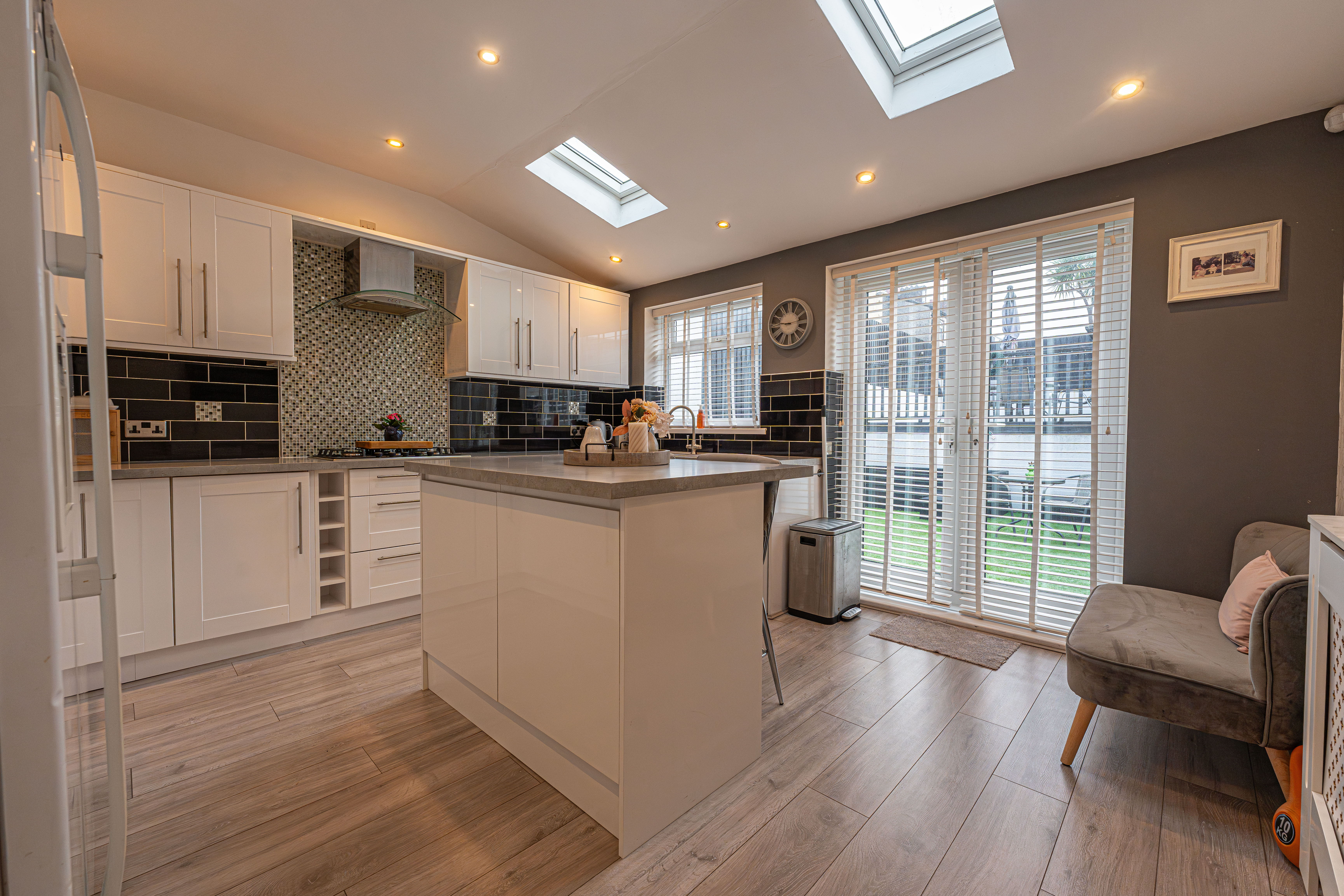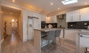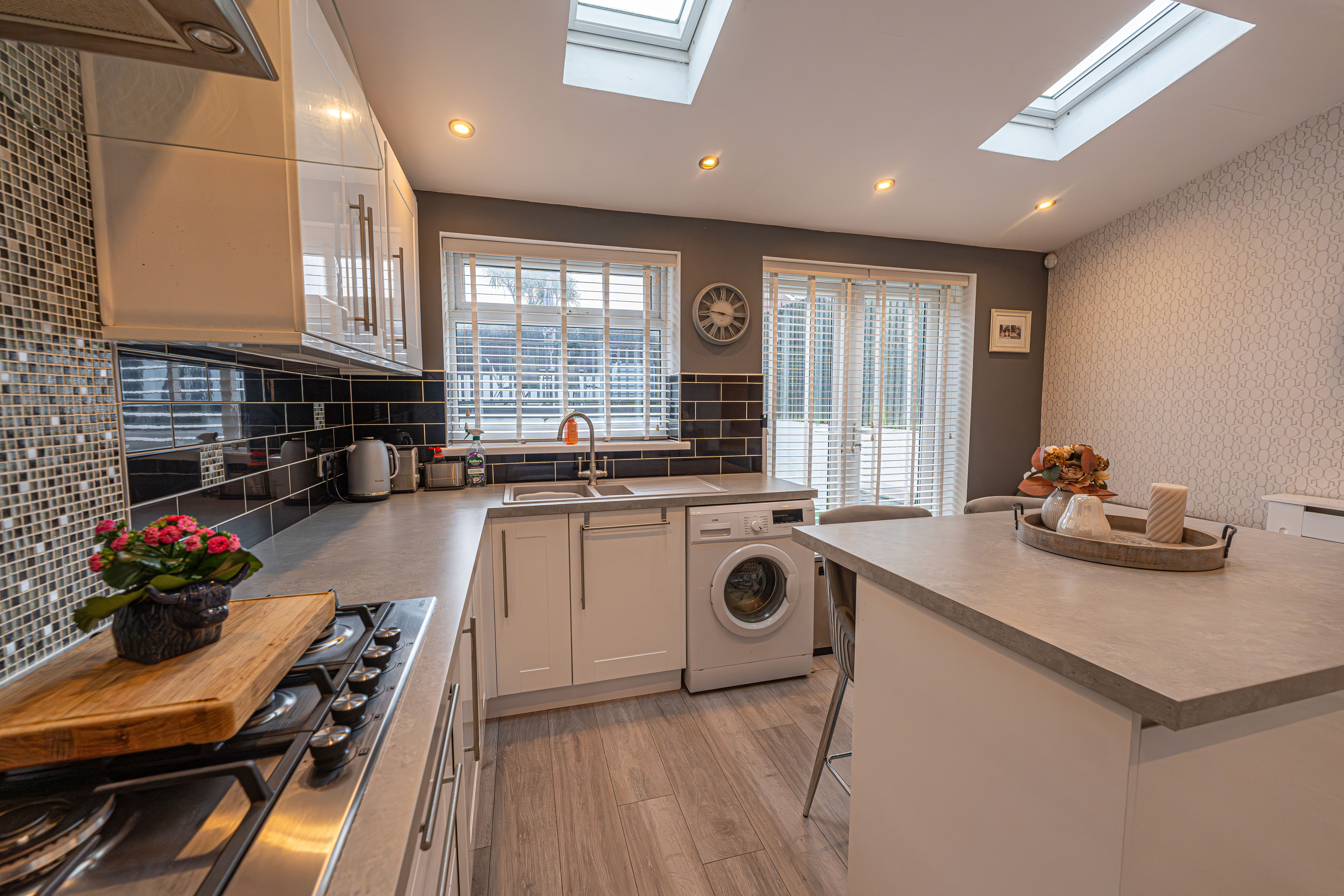 This beautifully presented home offers an exceptional blend of modern style and practical living space throughout. At the heart of the home we have an impressive open plan living and dining area, featuring plush carpeting, sophisticated lighting fixtures, and a charming bay window that lights up the room, creating an inviting space for relaxing and entertaining. The extended kitchen is another standout highlight, showcasing a stylish contemporary design with sleek storage fixtures and numerous integrated appliances. The kitchen also features a central island with a breakfast bar, and benefits from a flood of natural light from overhead skylights, and French doors that open to the garden. The kitchen also features a flexible hallway that could be well suited to a cloakroom or utility area, with additional storage cupboards fitted under the staircase,