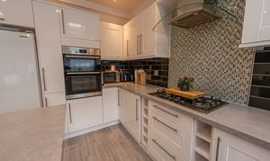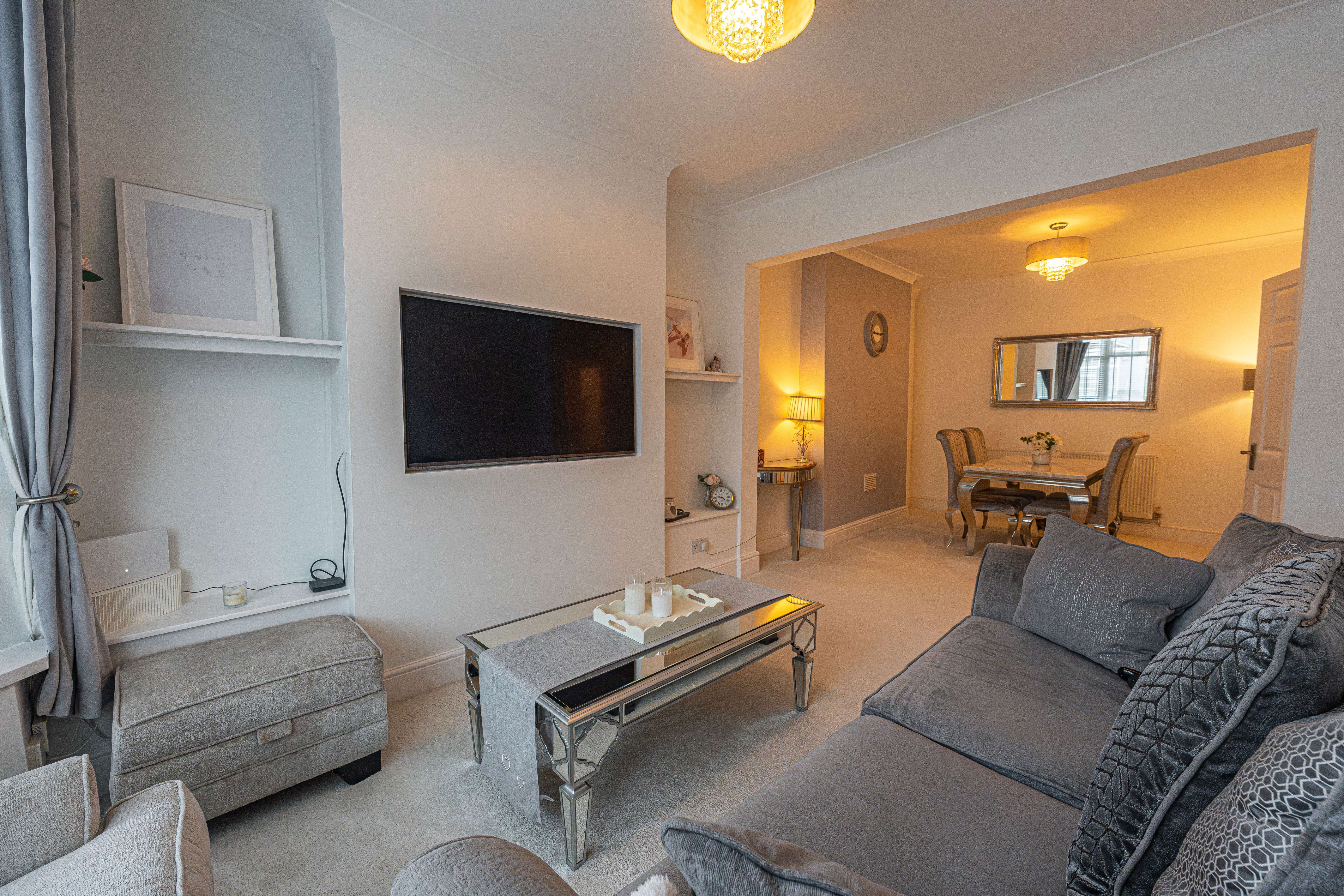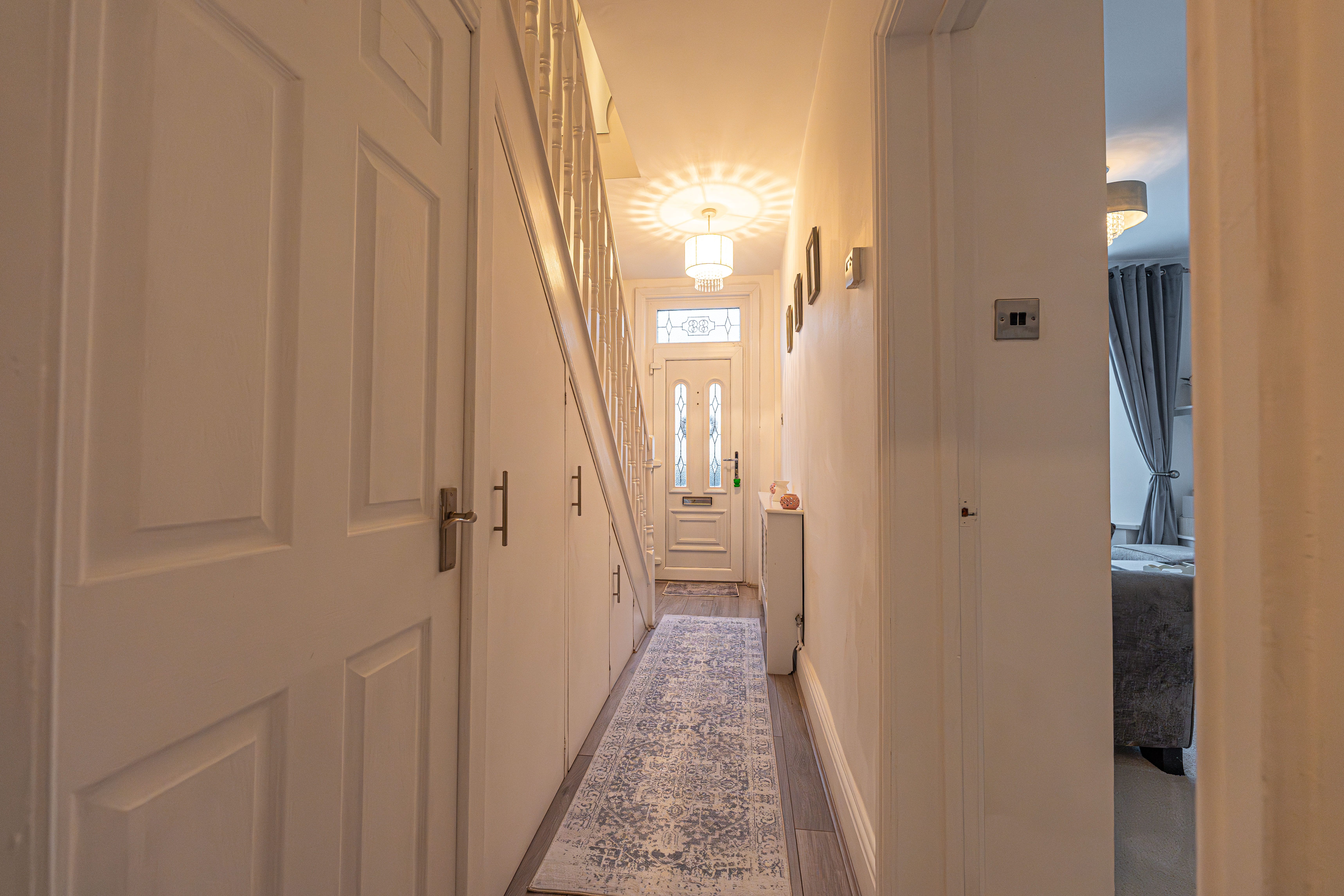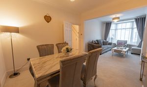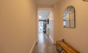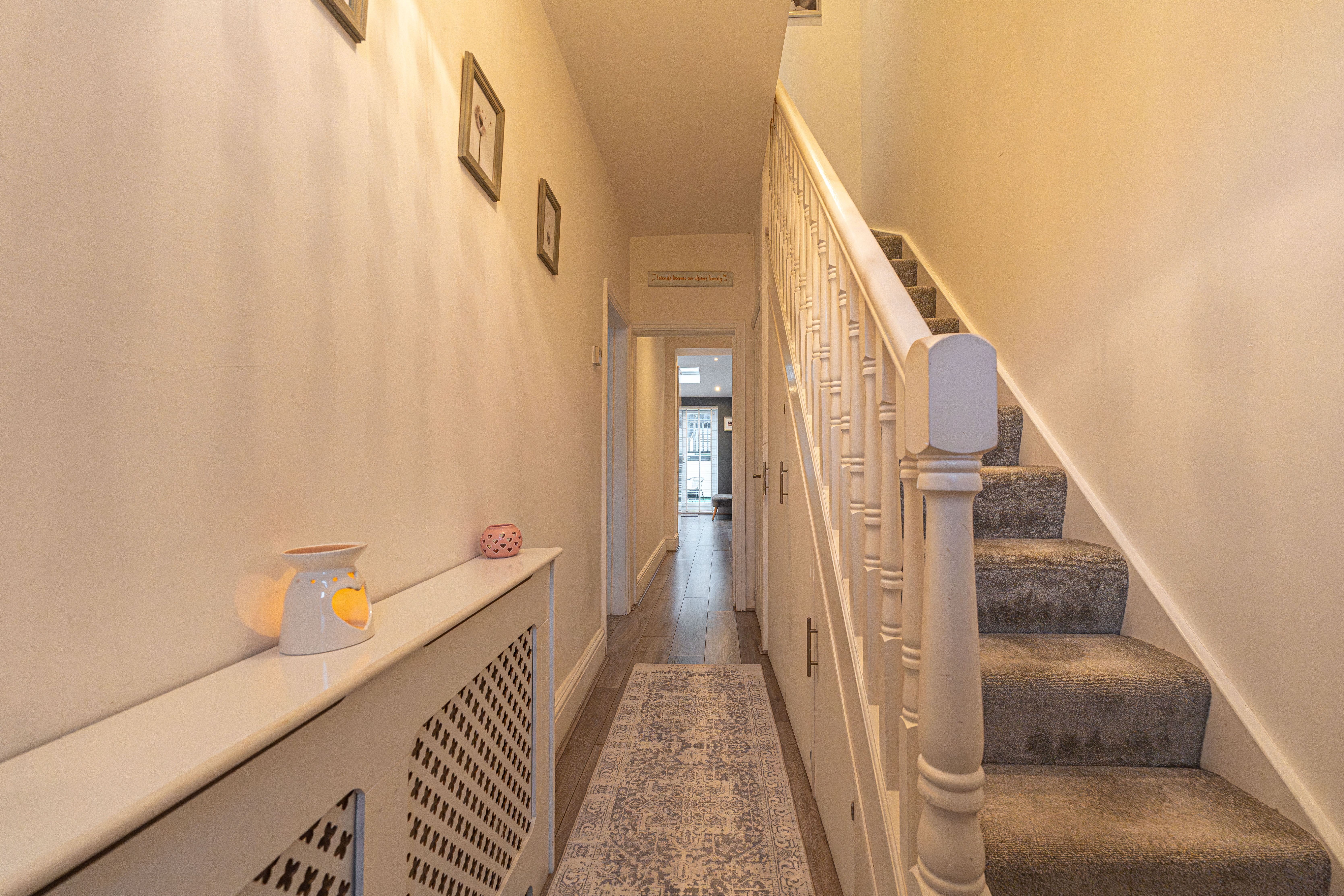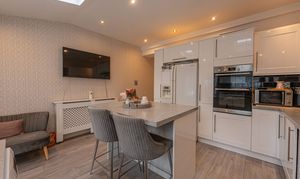 This beautifully presented home offers an exceptional blend of modern style and practical living space throughout. At the heart of the home we have an impressive open plan living and dining area, featuring plush carpeting, sophisticated lighting fixtures, and a charming bay window that lights up the room, creating an inviting space for relaxing and entertaining. The extended kitchen is another standout highlight, showcasing a stylish contemporary design with sleek storage fixtures and numerous integrated appliances. The kitchen also features a central island with a breakfast bar, and benefits from a flood of natural light from overhead skylights, and French doors that open to the garden. The kitchen also features a flexible hallway that could be well suited to a cloakroom or utility area, with additional storage cupboards fitted under the staircase,