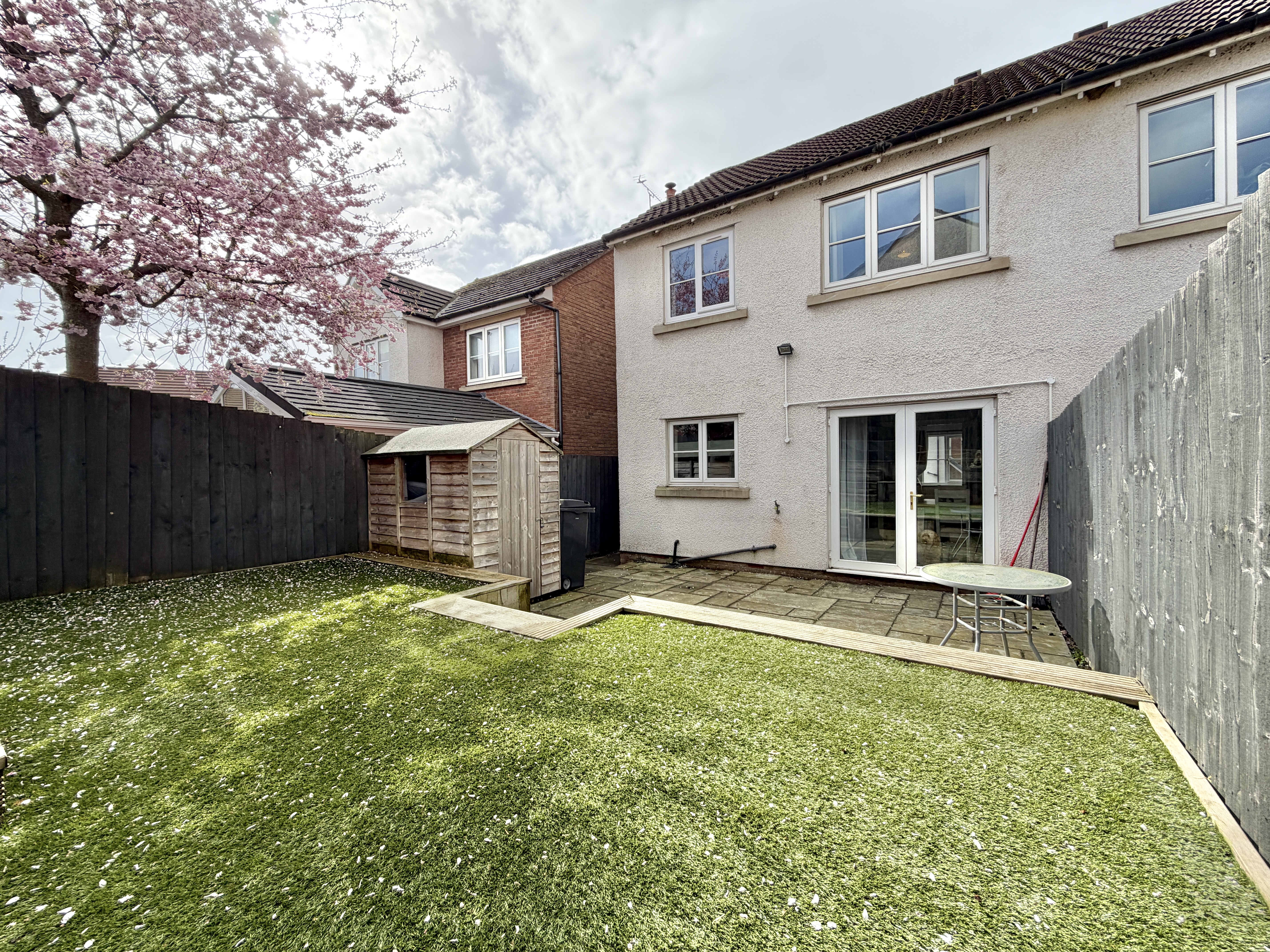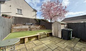 The dining area benefits from patio doors that open directly onto the rear garden, creating a seamless connection between indoor and outdoor living. The landscaped garden has been thoughtfully designed, featuring a well-maintained lawn, garden shed and a decking area perfect for outdoor dining, relaxing, or hosting guests during the warmer months.