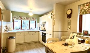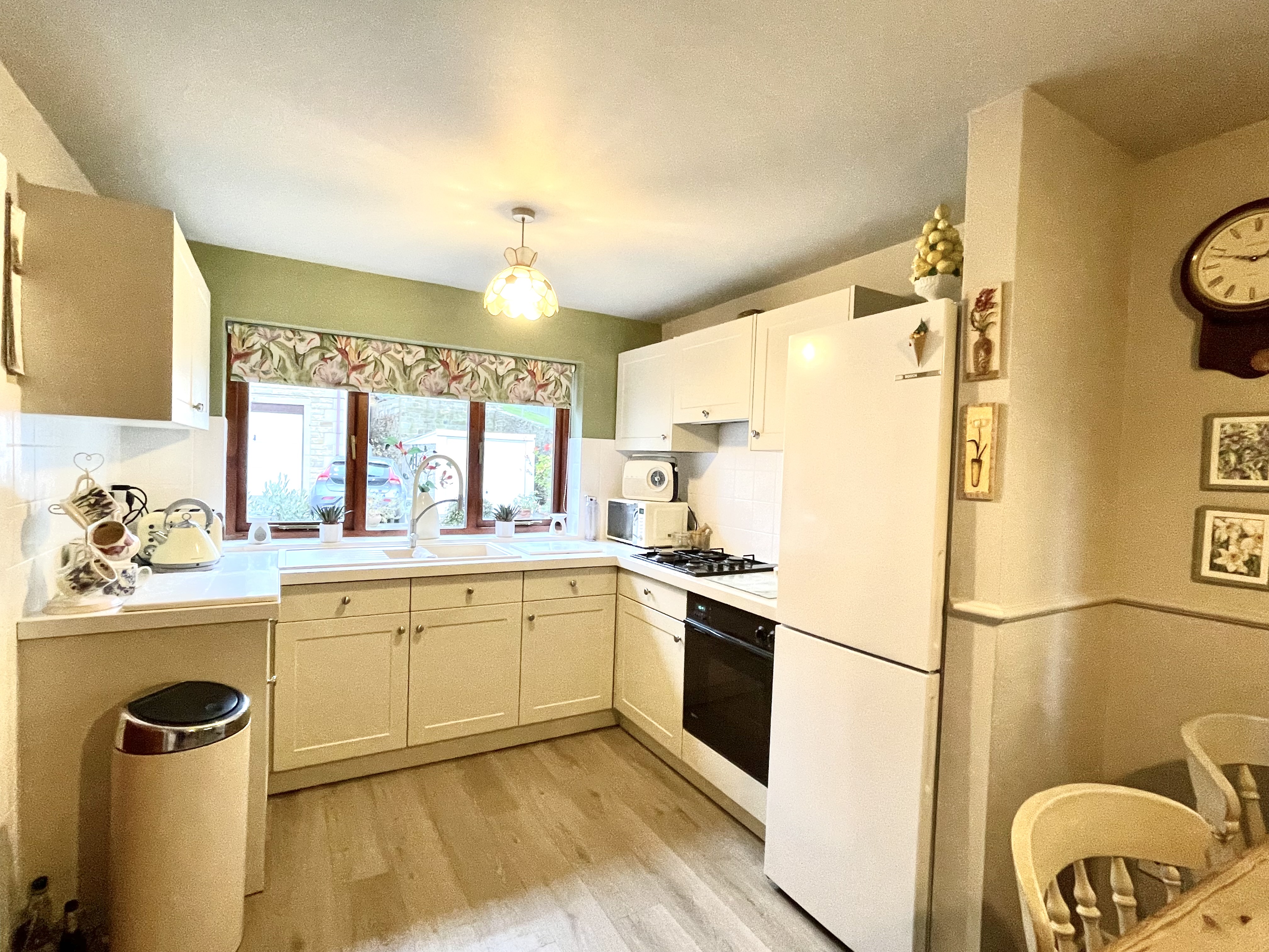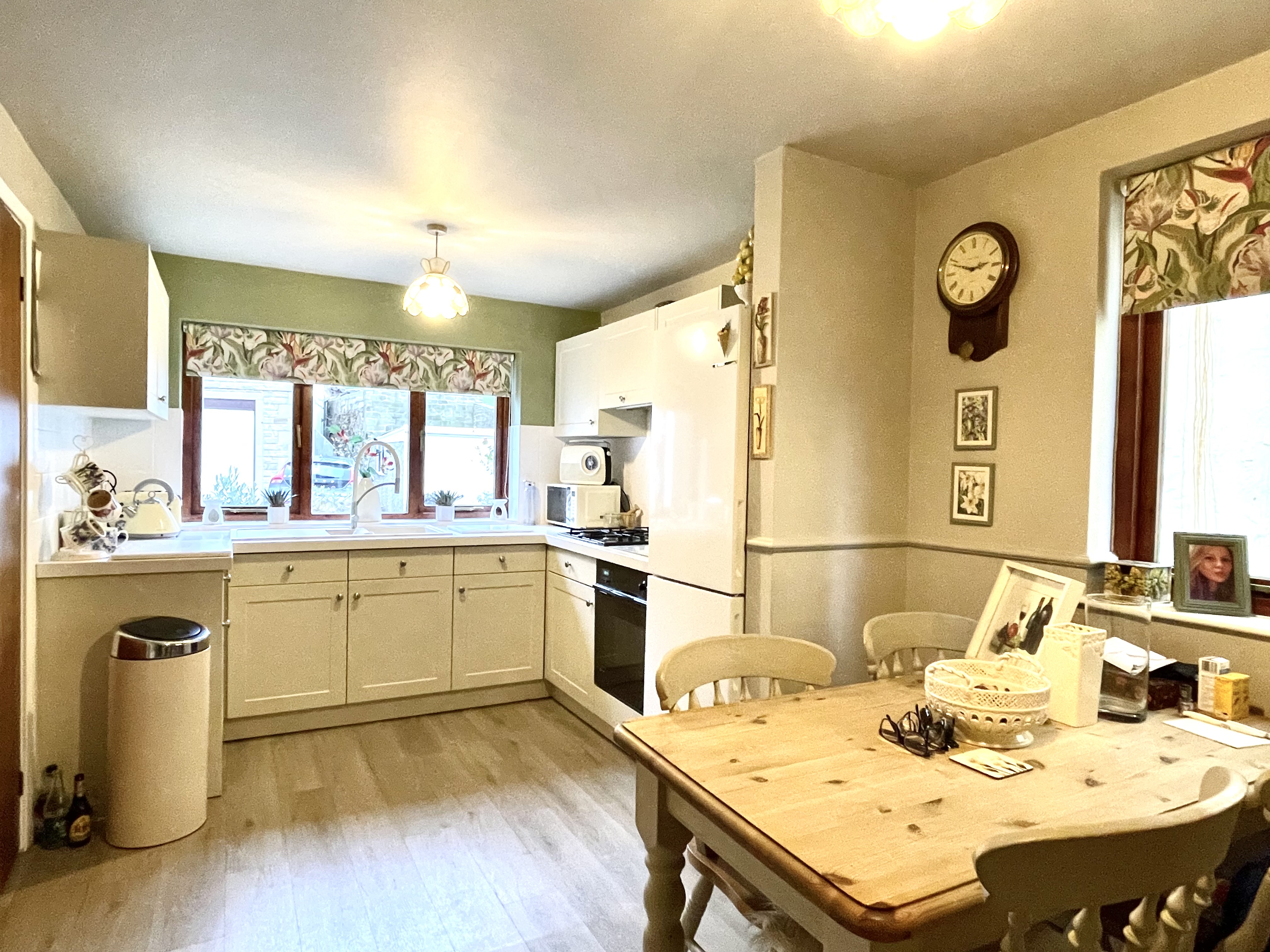 With timber and sealed unit double glazed windows to both rear and side elevations, there are two ceiling light points, two doors giving access to the hallway, grey oak effect laminate flooring, central heating radiator and fitted with a range of shaker style base and wall cupboards, drawers, overlying worktops with an inset one and a half bowl single drainer sink with Monobloc tap, four ring Neff gas hob with extractor hood over and Neff electric fan assisted oven together with space for fridge/freezer.