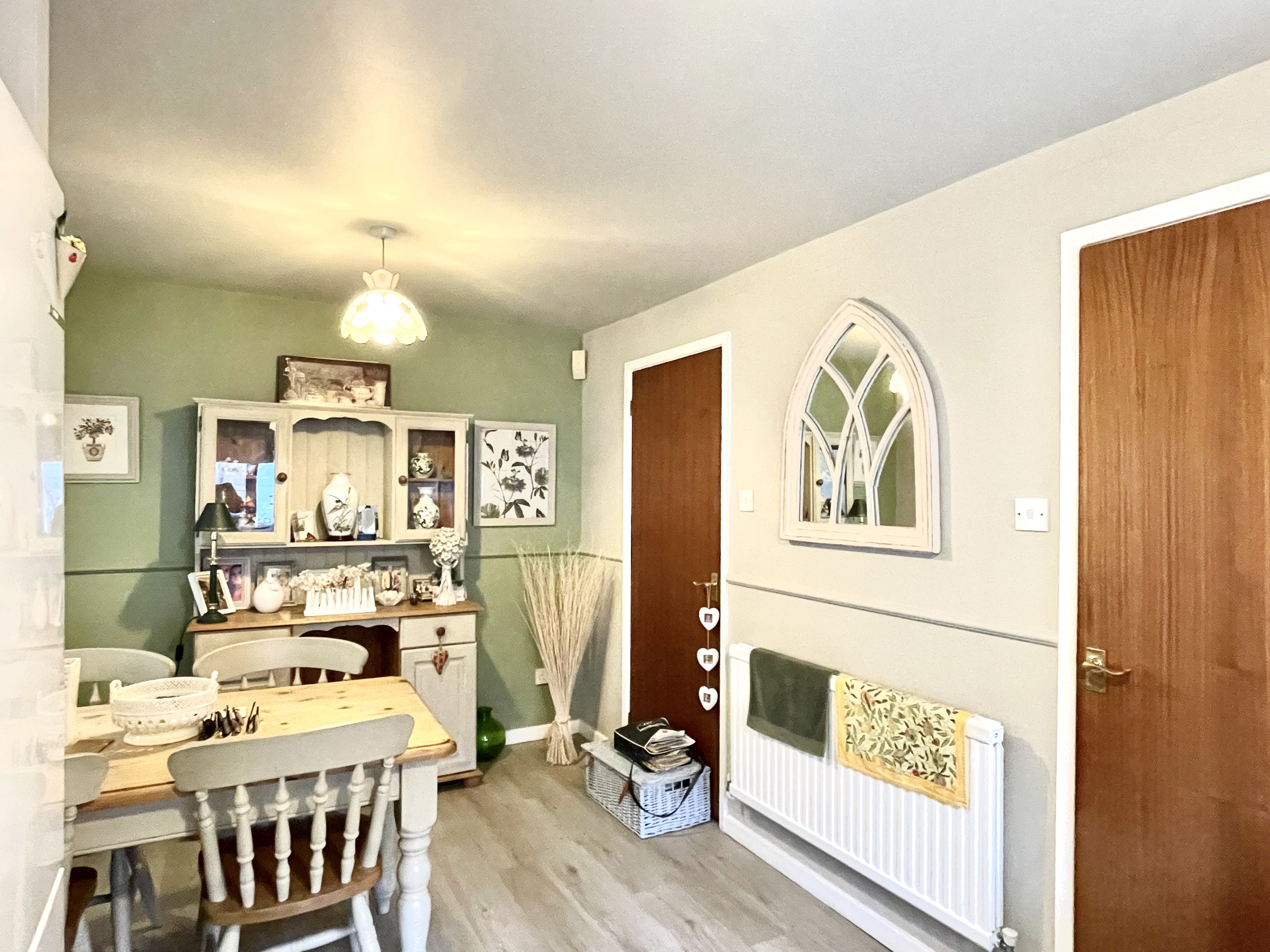 With a walk in bay having pvcu double glazed windows looking out over the front garden, there is an adjacent pvcu and sealed unit double glazed door, ceiling coving, wall light point, two central heating radiators and as the main focal point of the room there is a fire place with timber surround, tiled inset and home to a flame effect electric fire which rests on a tiled hearth.