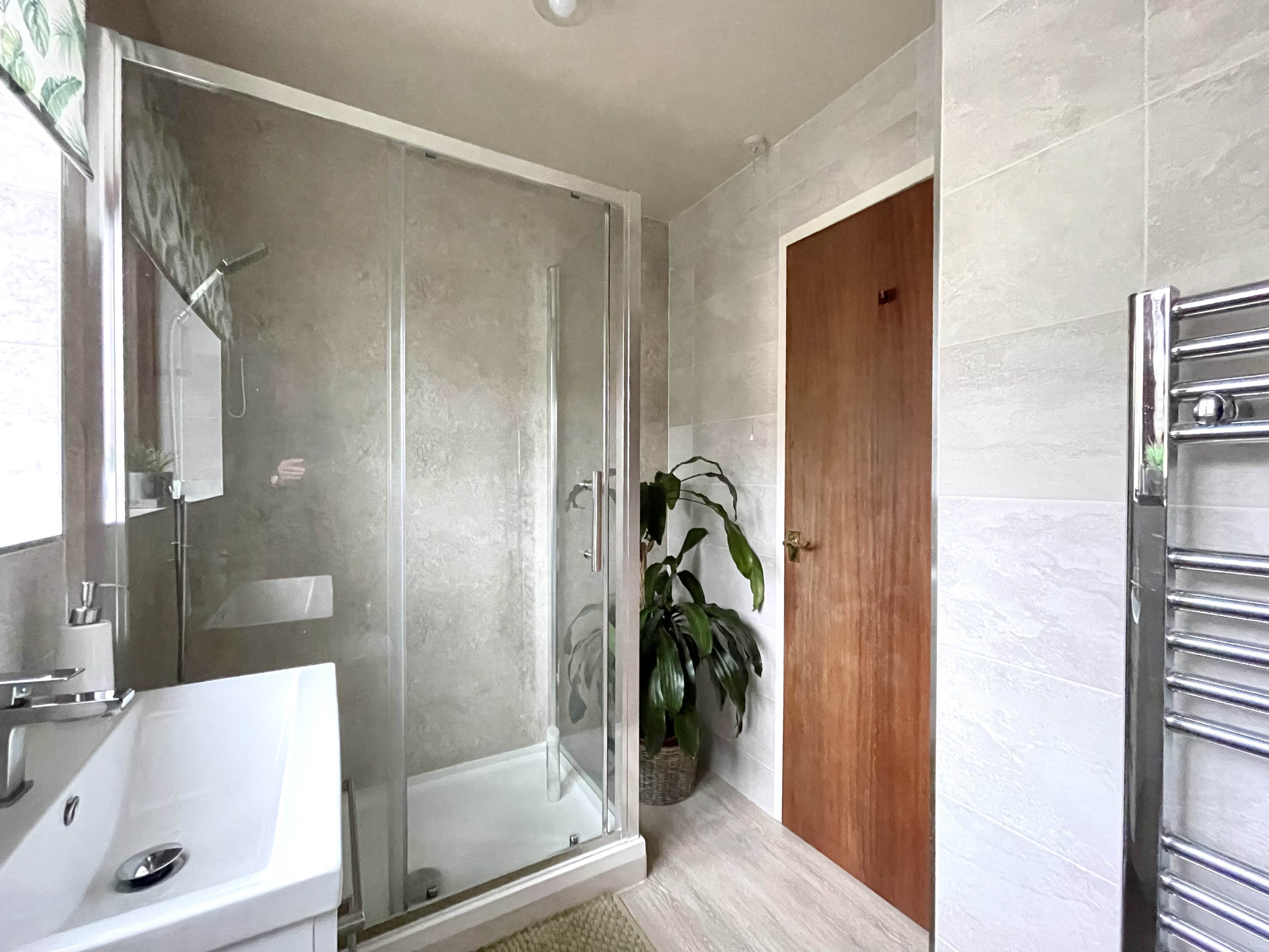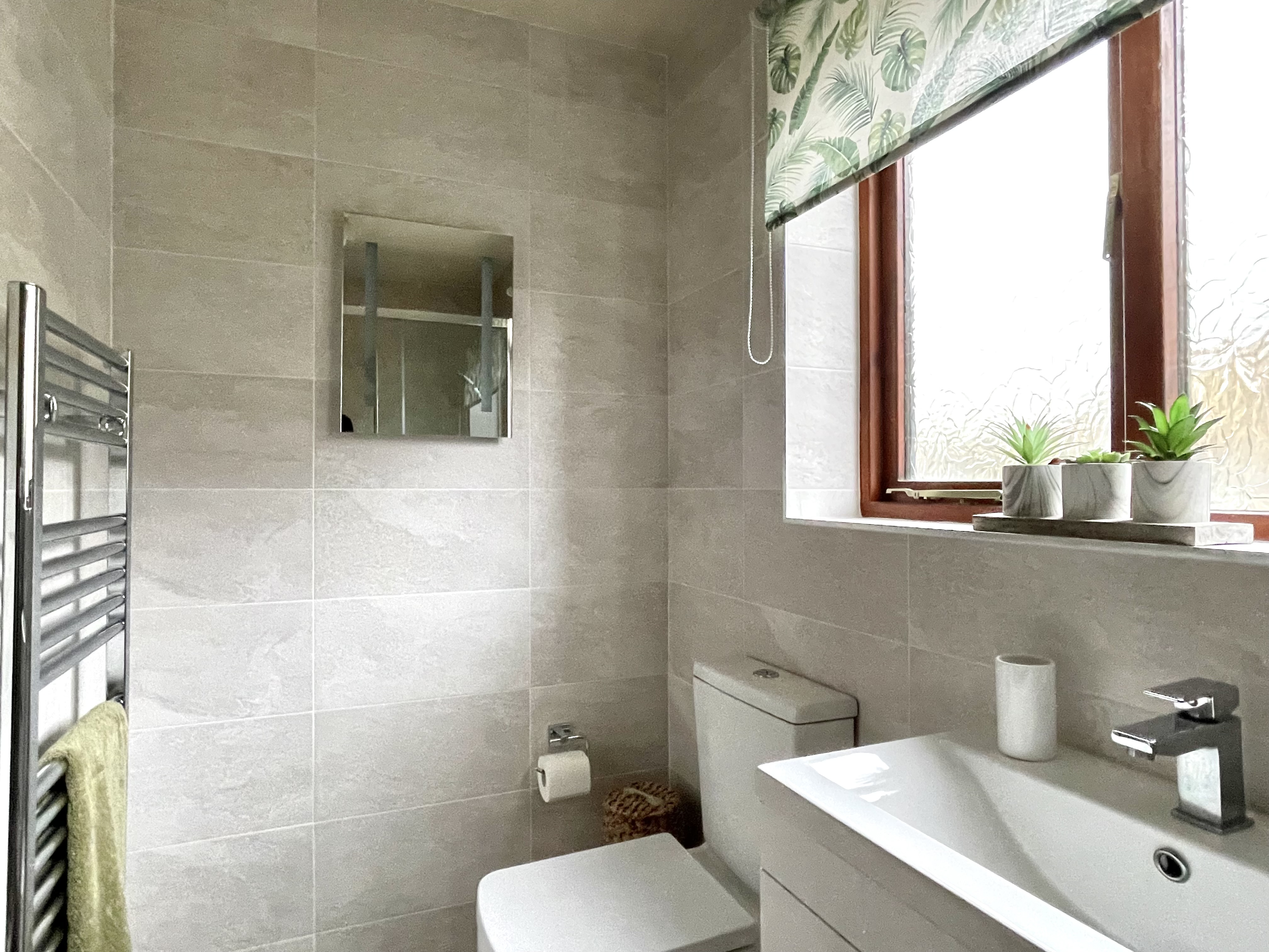 With a frosted timber and sealed unit double glazed window, ceiling light point, floor to ceiling tiled walls, chrome ladder style heated towel rail and fitted with a suite comprising wall home vanity unit incorporating wash basin with chrome mono block tap, low flush wc and with a corner shower cubicle with easy clean panelled walls together with glass sliding door and chrome shower fitting.