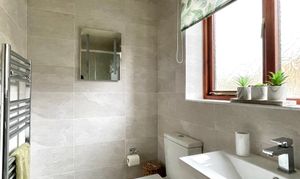 With a frosted timber and sealed unit double glazed window, ceiling light point, shaver socket, wall mounted ideal logic gas fire central heating boiler, central heating radiator and fitted with a suite comprising pedestal wash basin with tiled splashback and low flush wc.