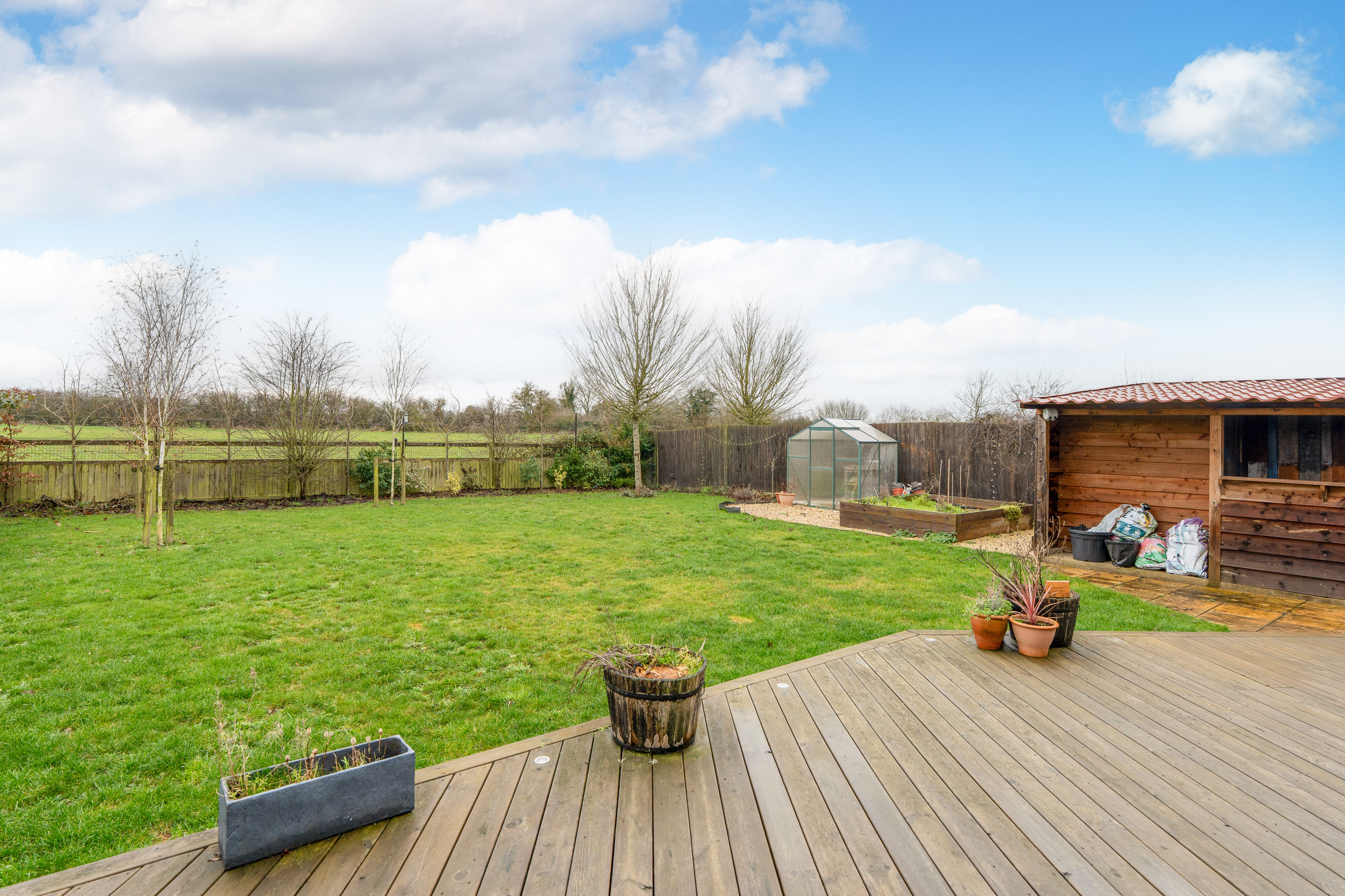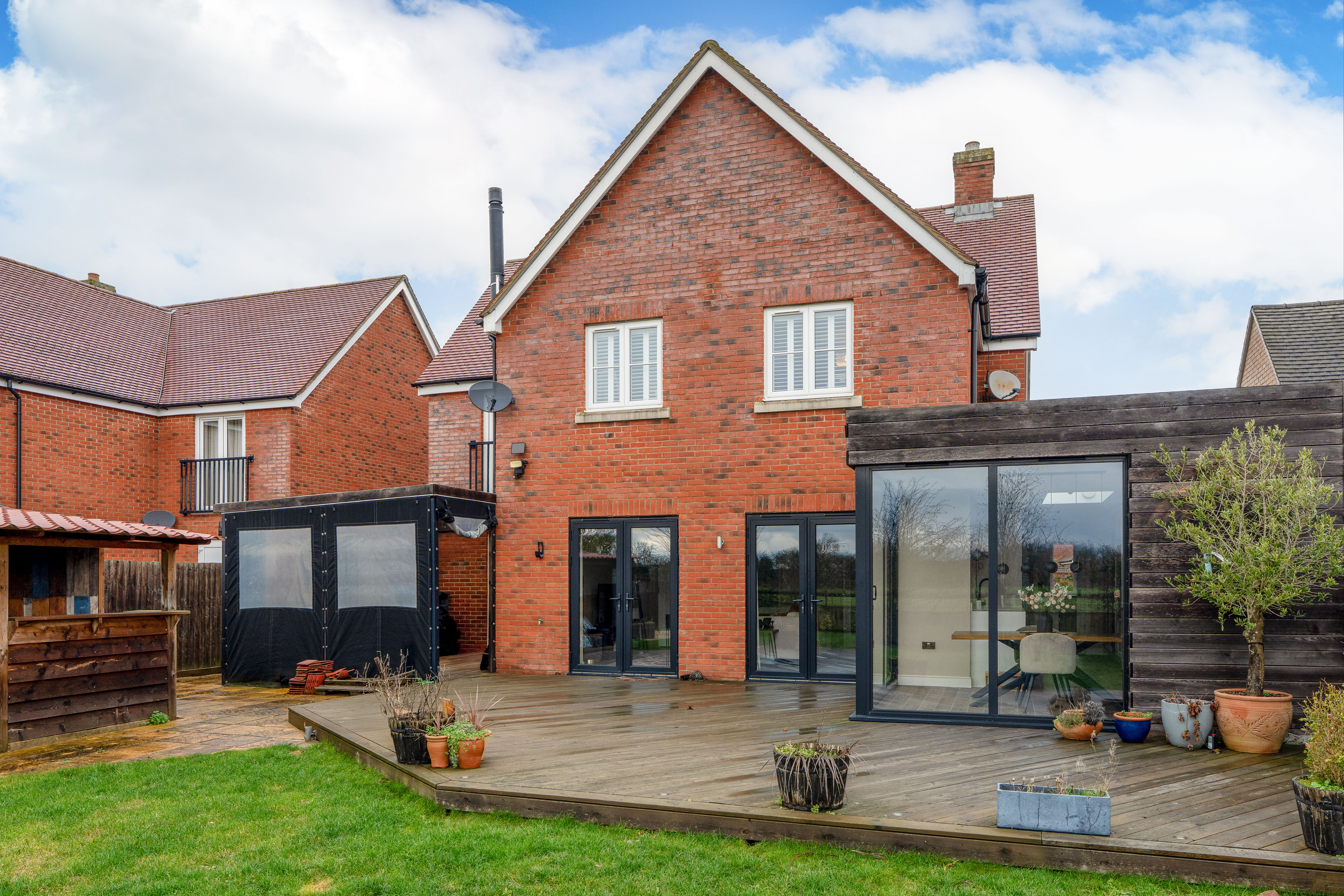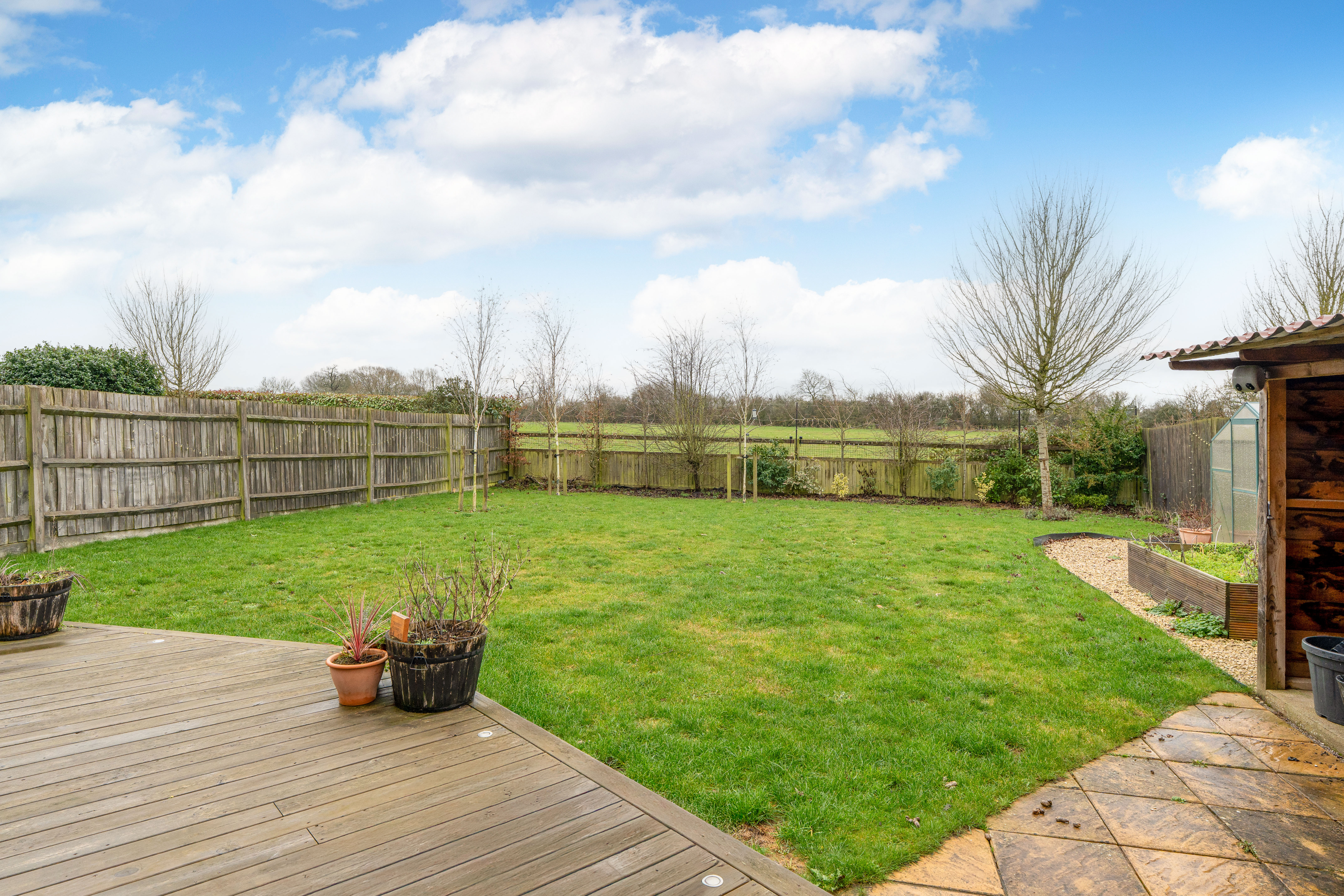- Private Garden & Outbuilding – Generous rear garden with covered area, shed, and garage access.