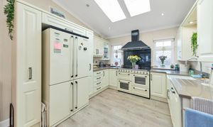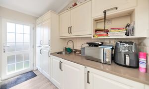 The kitchen/dining room is wonderfully open-plan, with windows and double French doors to a dual aspect, Velux windows, a range of modern base and wall units, quartz worktops, laminate flooring to the kitchen and carpet to the diner, inset lighting, a range cooker, an extractor hood, an integrated dishwasher, a butler sink, and American fridge/freezer, dining setting and smaller kitchen appliances. The utility room provides further storage, integrated washer/dryer, access to the garden and space for large laundry appliances.