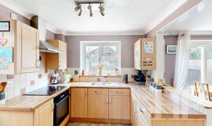 Fitted with wall and base level units with work surface over, incorporating a single bowl, single drainer, stainless steel sink unit with mixer tap. Built-in oven and hob with extractor hood over. Space for under-counter fridge in under-stair alcove. Dual aspect with a window to the rear and a door to the side, covered area. Opening to: