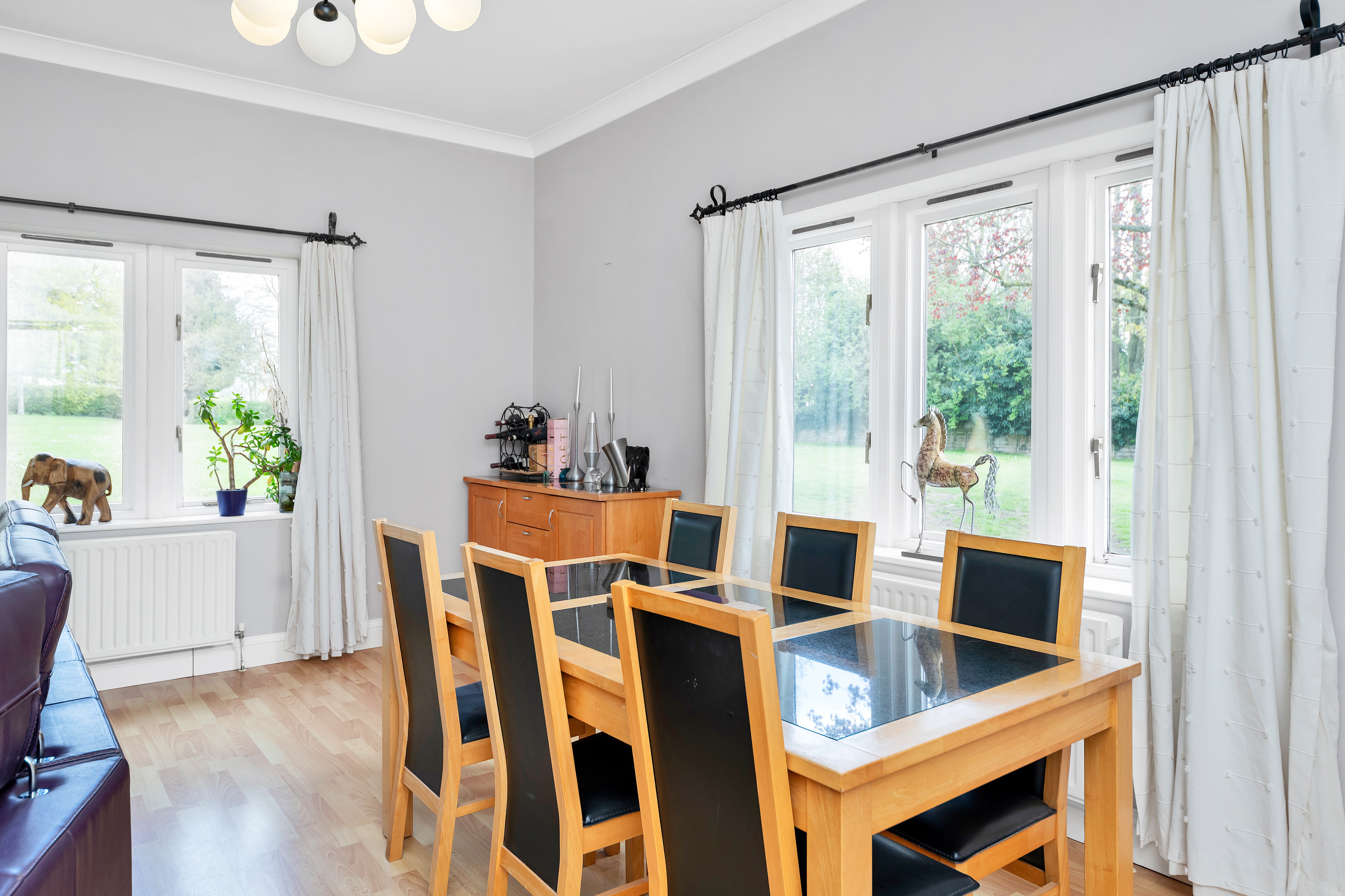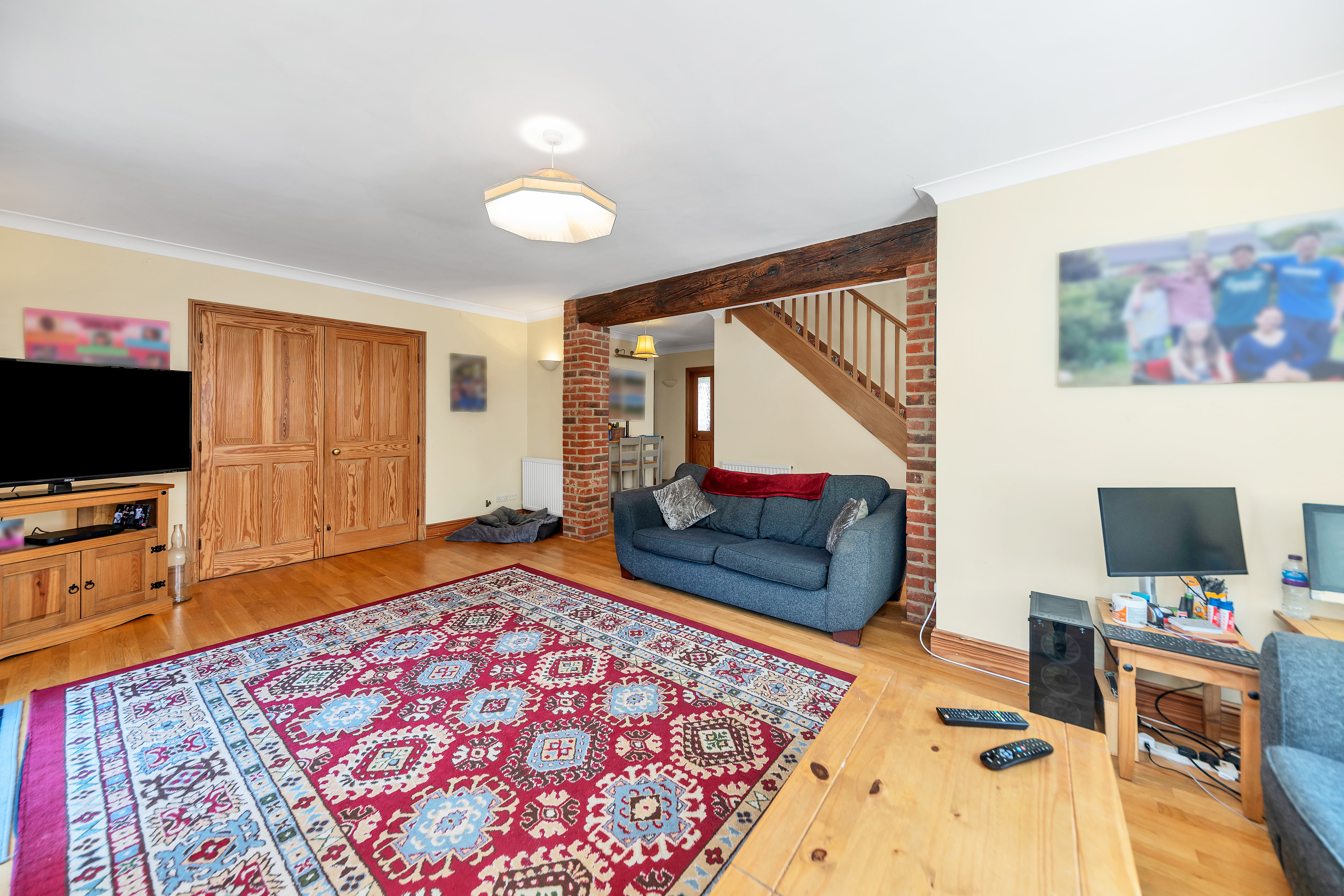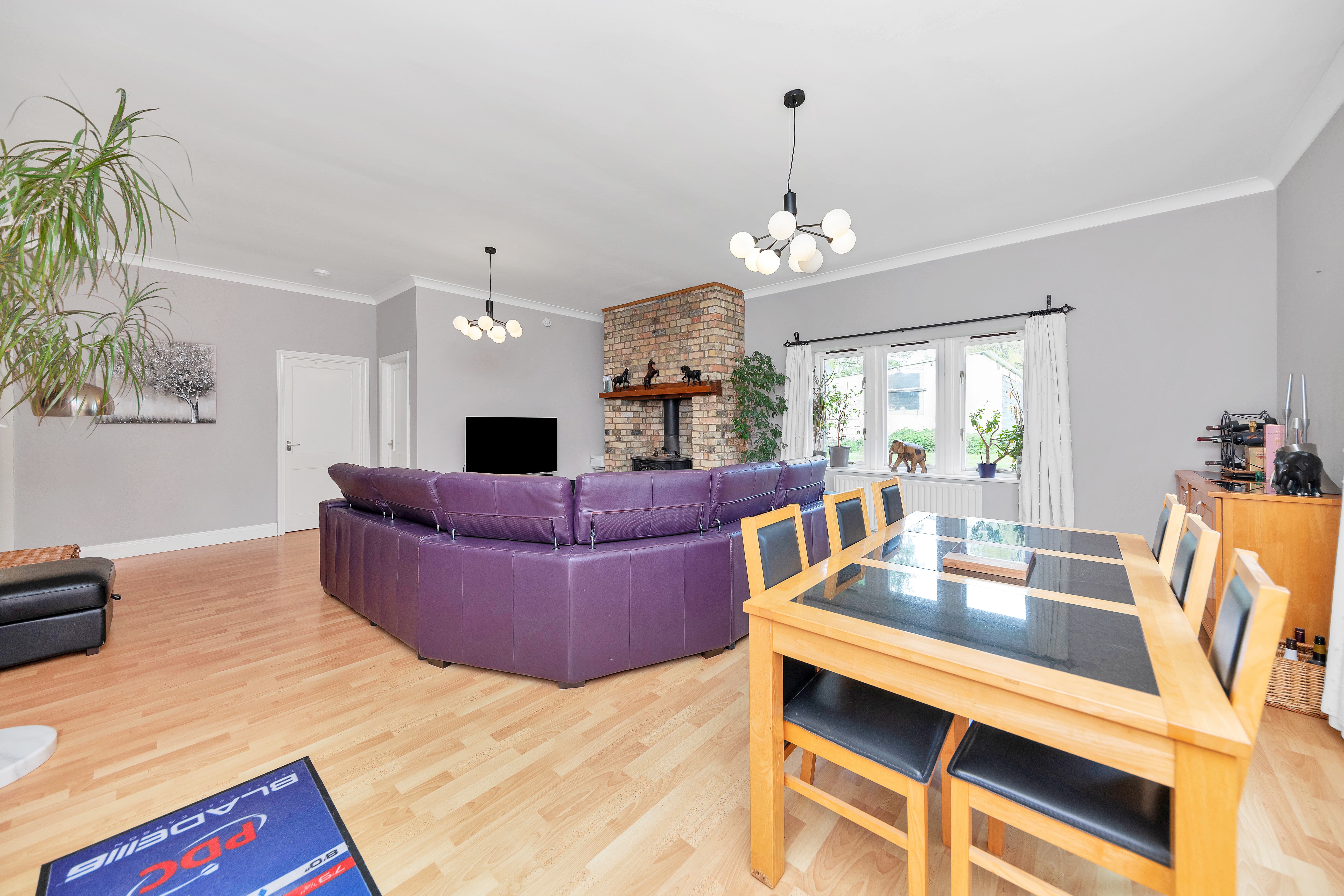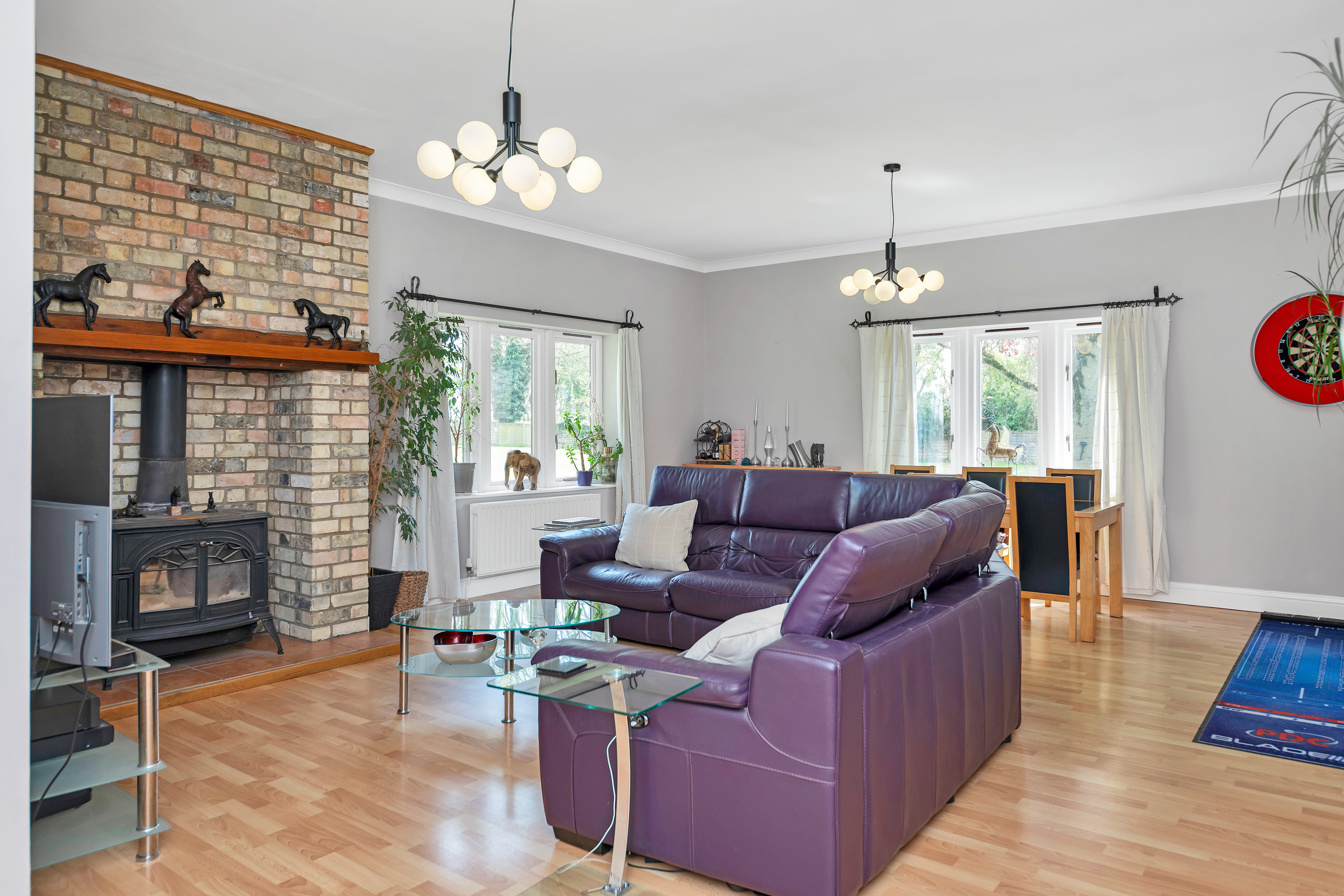 This excellently maintained detached home boasts truly excellent kerb appeal, with an attractive frontage, surrounded by well-kempt hedgerows, mature trees, and a long driveway with parking for multiple vehicles, and access to a detached barn-style dwelling to the rear. Upon stepping inside, the entrance hallway is spacious and bright, leading through to a large and nicely presented dining room, with windows and double French doors to a dual aspect, wood flooring, pendant lighting, and room for furniture. The lounge is equally generous, enjoying windows to a dual aspect, a fireplace, and ample space for a variety of lounge and storage furniture.