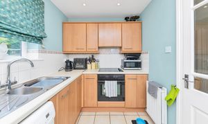 The lounge/dining room is incredibly spacious, enjoying 2 windows to a dual aspect, a fireplace with a wood-burning stove, wood flooring, pendant lighting and ample space for a variety of lounge, dining and storage furniture. The kitchen is a good size, benefiting from a window, a range of base and wall units, tiled flooring and splashbacks, laminate worktops, an integrated oven and hob, and space for a range of kitchen appliances.