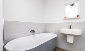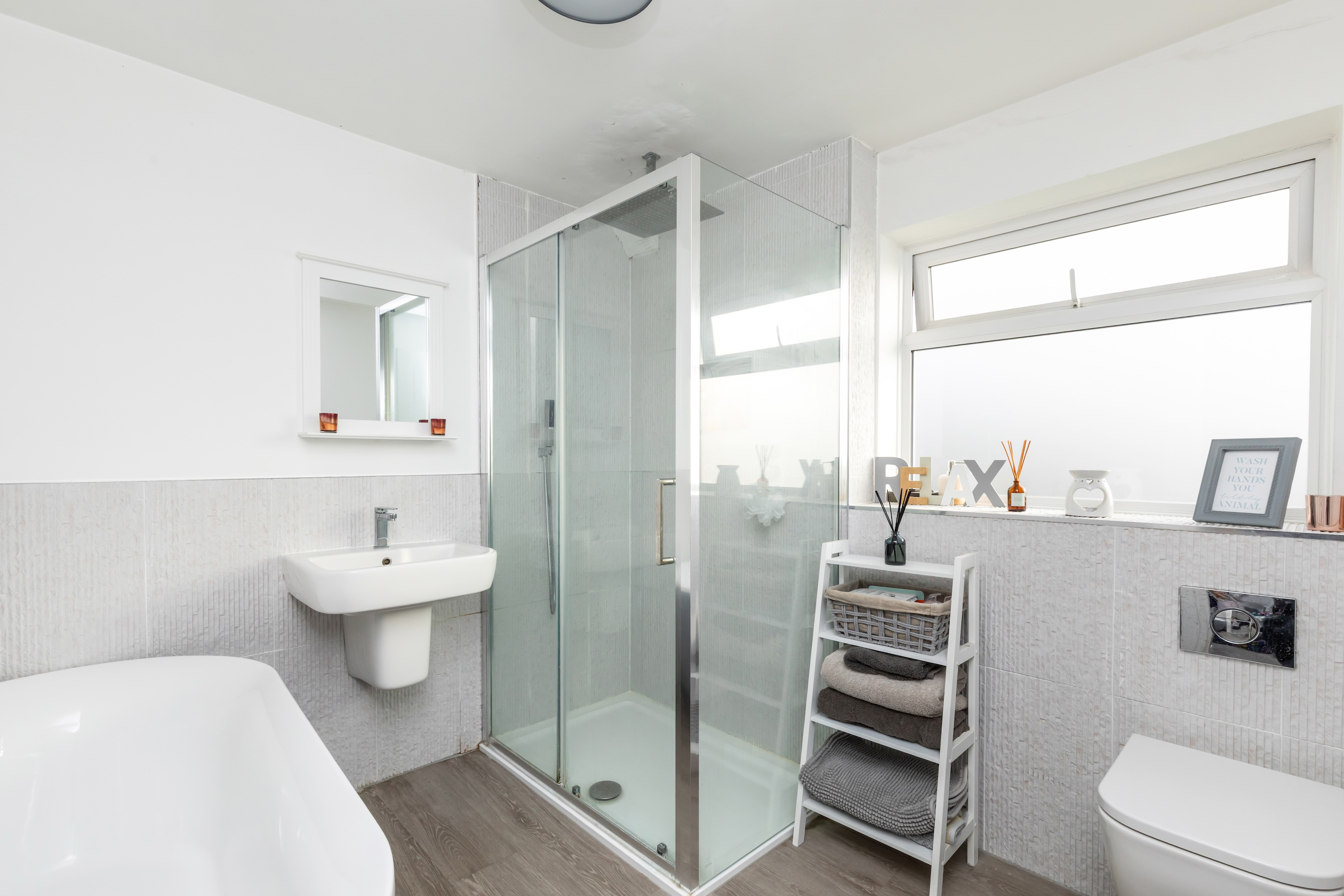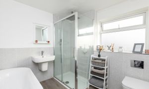 Upstairs, you’ll find three generously sized bedrooms, each enjoying a pleasant outlook. The family bathroom, accessed from the landing, has been tastefully designed and exudes luxury, featuring a freestanding bath and separate shower.