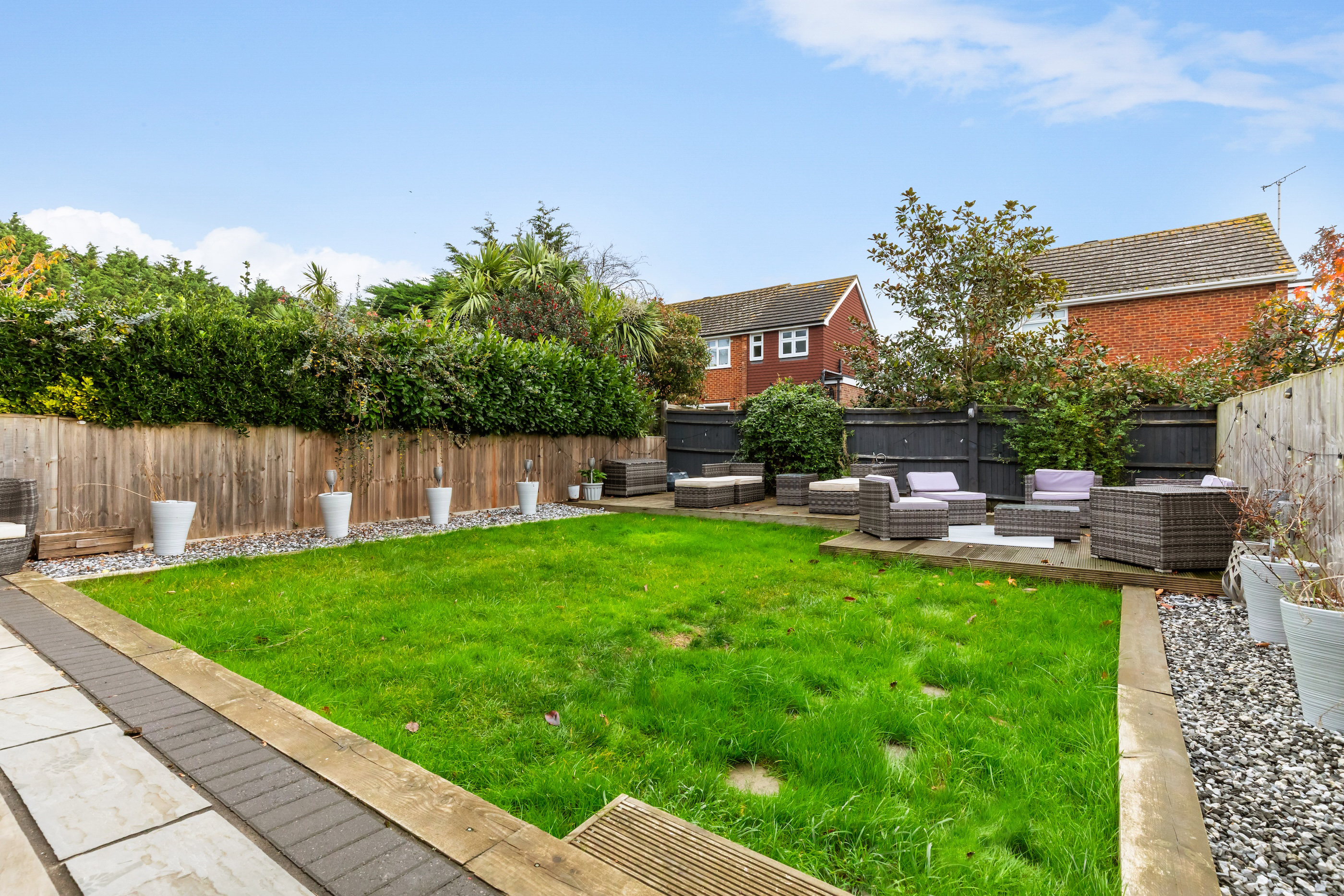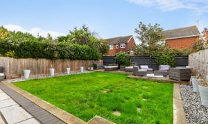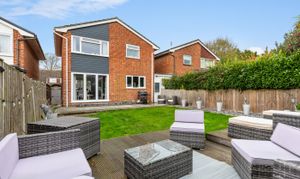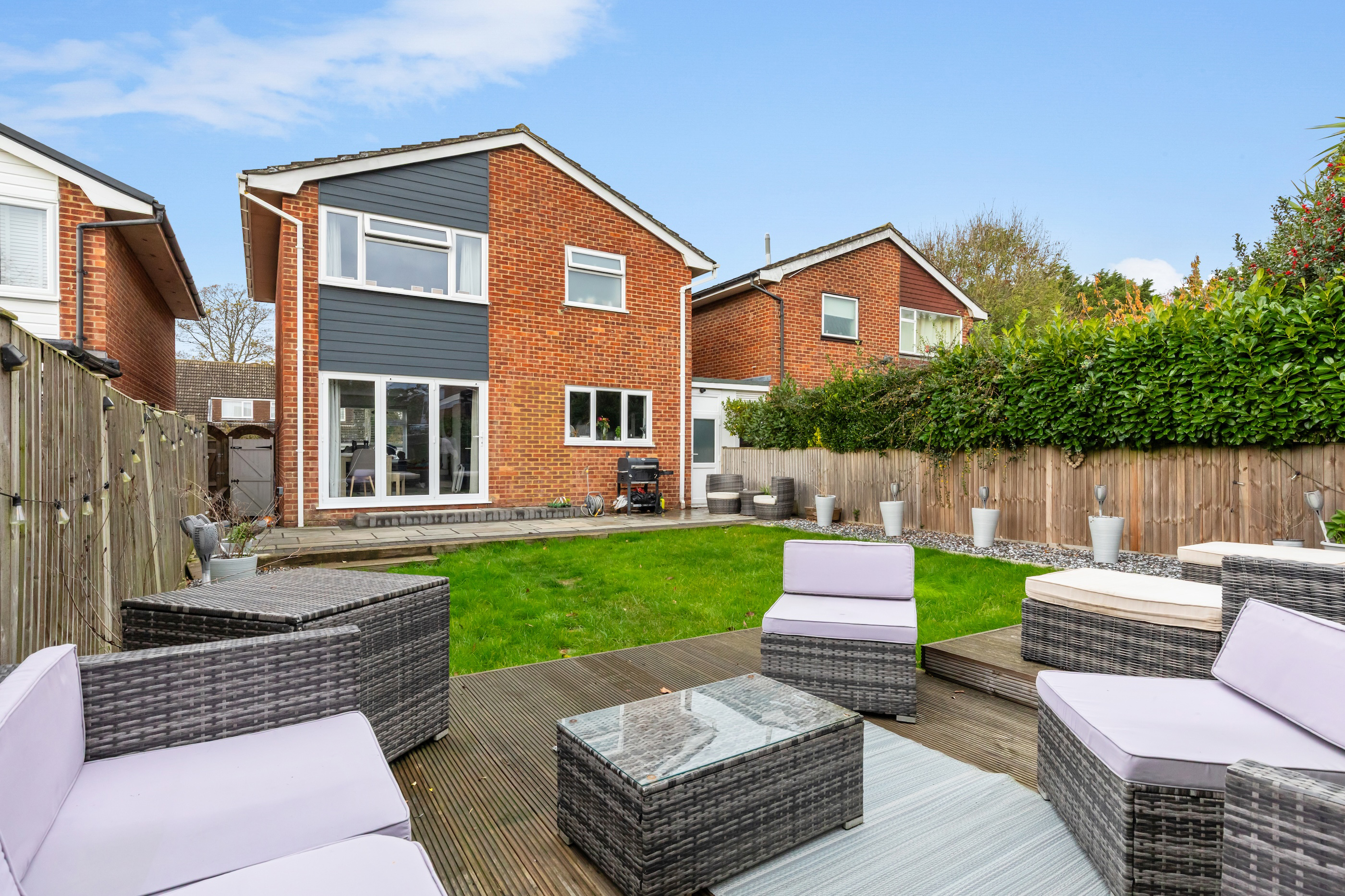 Outside, the rear garden is mainly laid to lawn with attractive raised borders, a private terrace, and a raised decked seating area at the far end, perfect for summer evenings. To the front, a private driveway provides ample parking and leads to the garage.