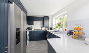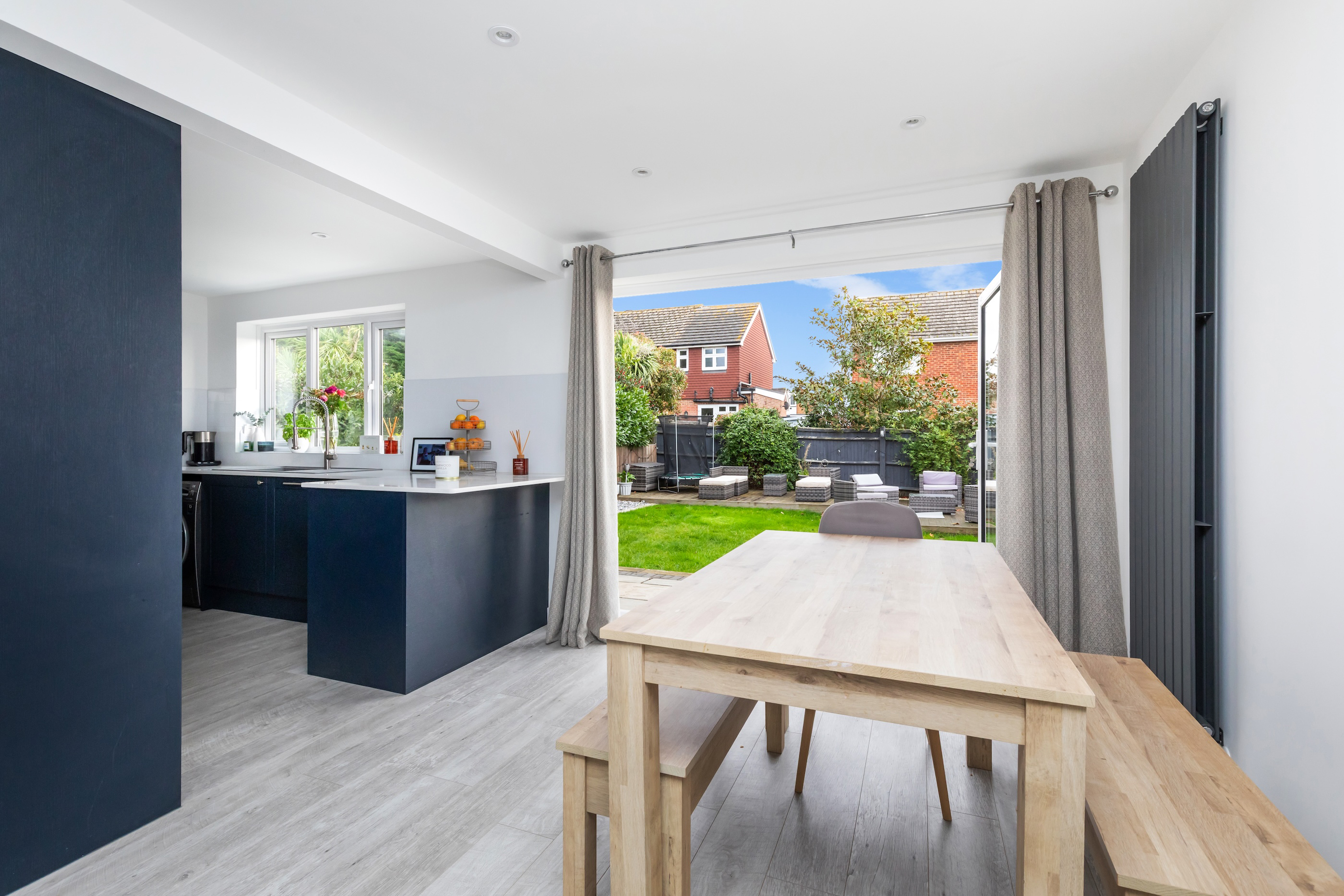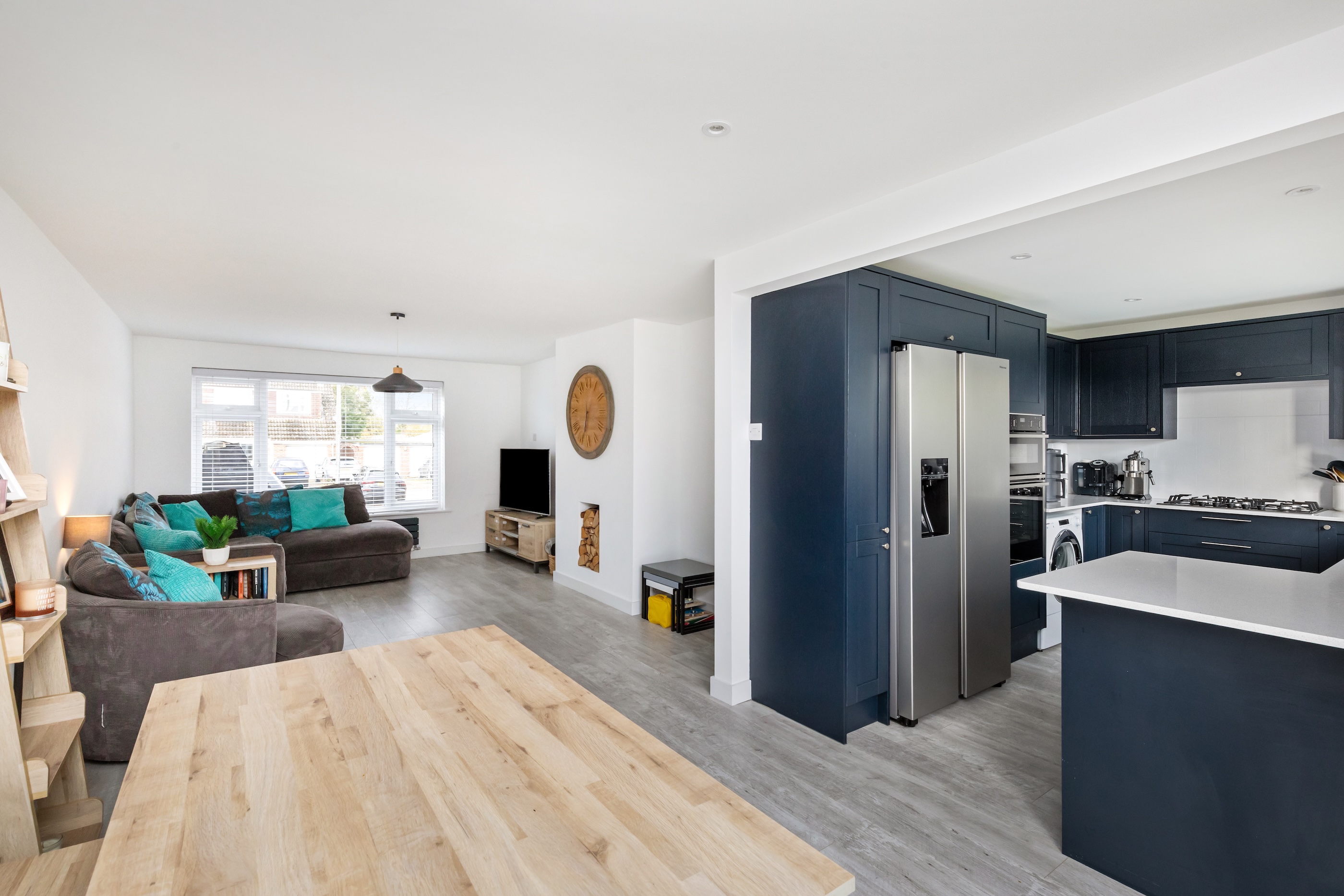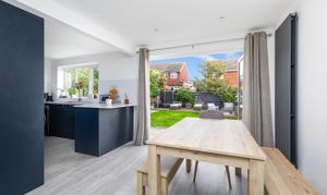 This spacious three-bedroom property is beautifully presented throughout and showcases open-plan living at its finest. The welcoming entrance hall provides access to all principal rooms, including a spectacular open-plan kitchen and dining area, perfect for entertaining. The newly fitted kitchen features a range of integrated appliances, a stylish breakfast bar, and stunning bi-folding doors that open onto a private terrace, ideal for alfresco dining.