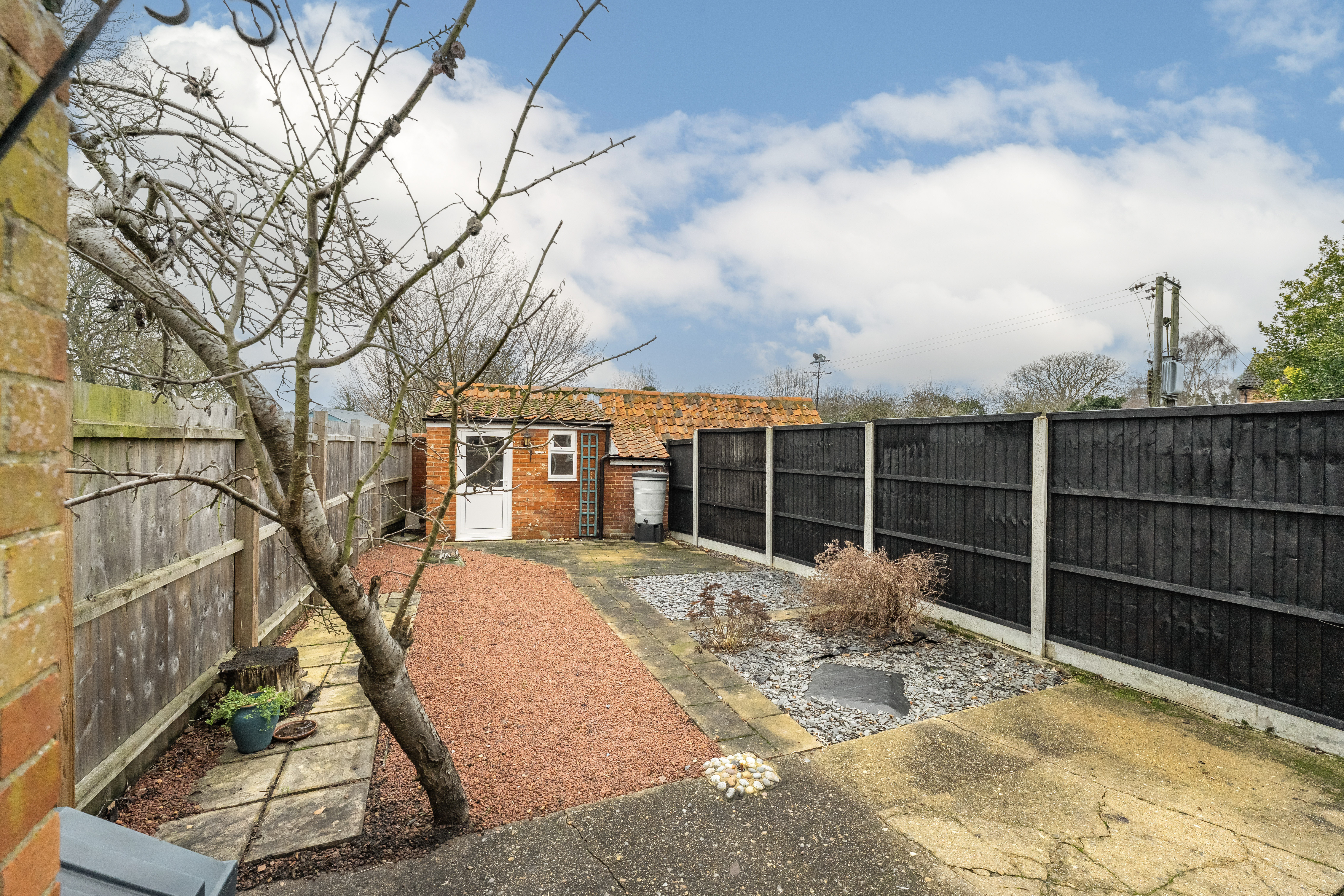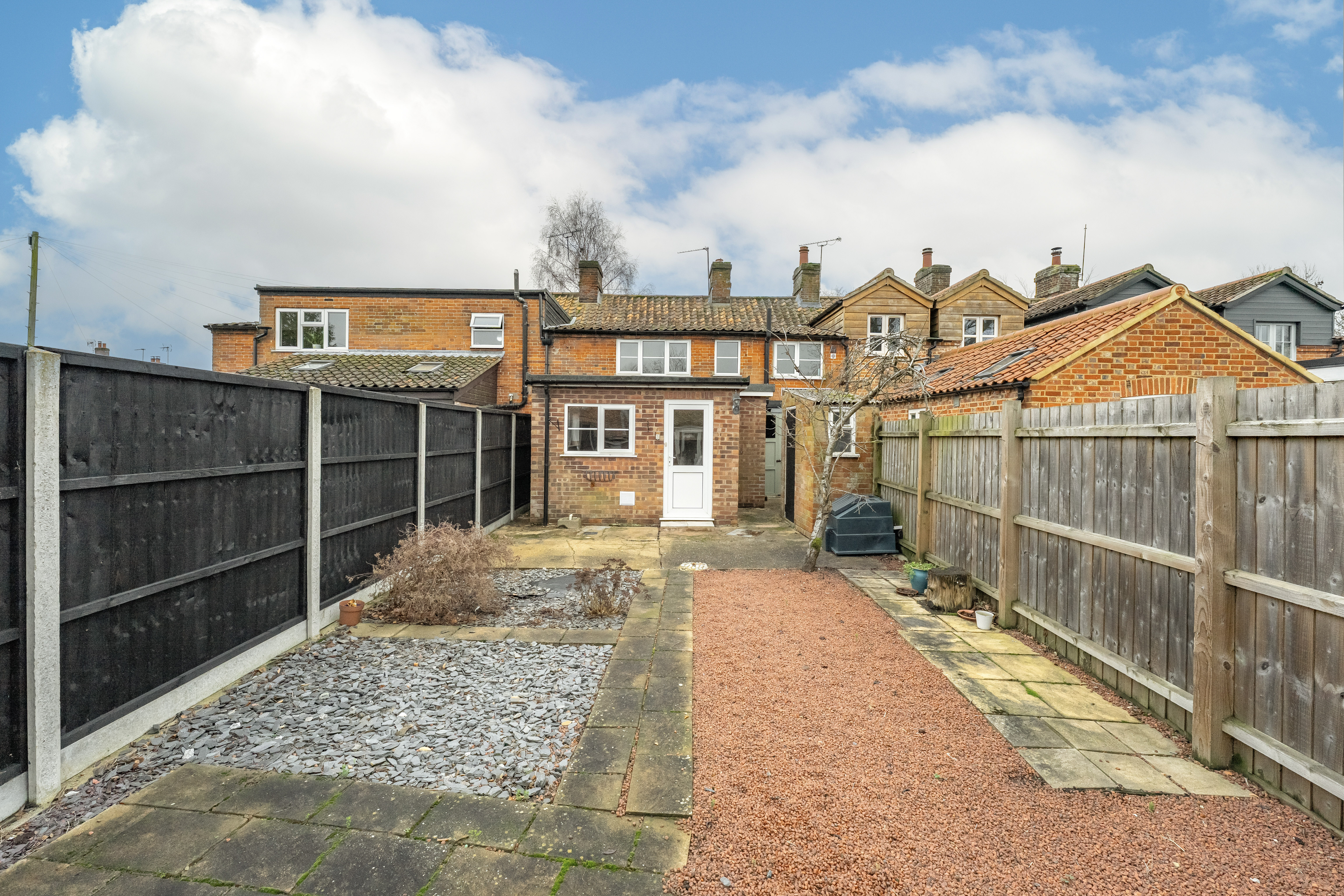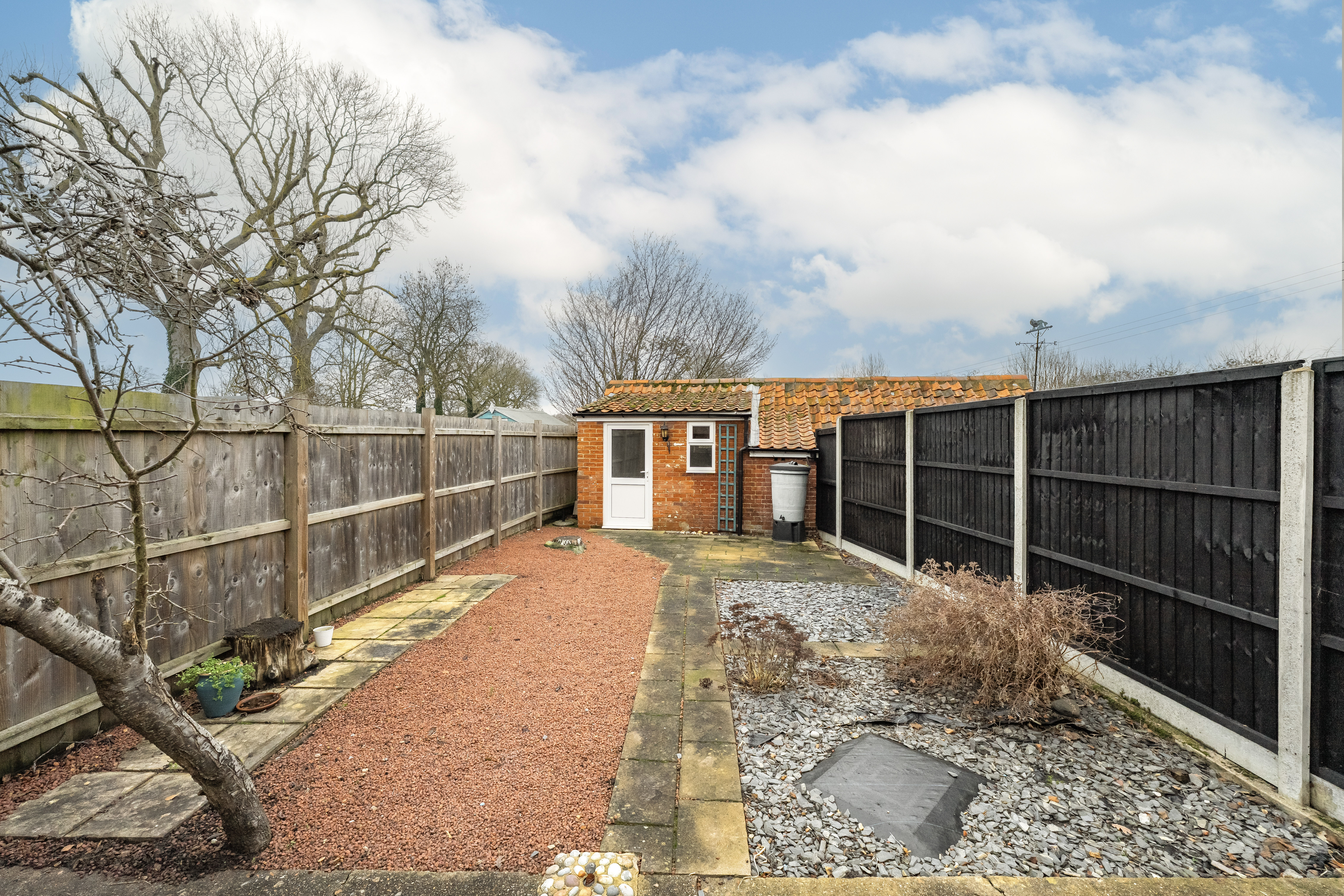- Low-maintenance rear garden with stone chippings and slate beds
