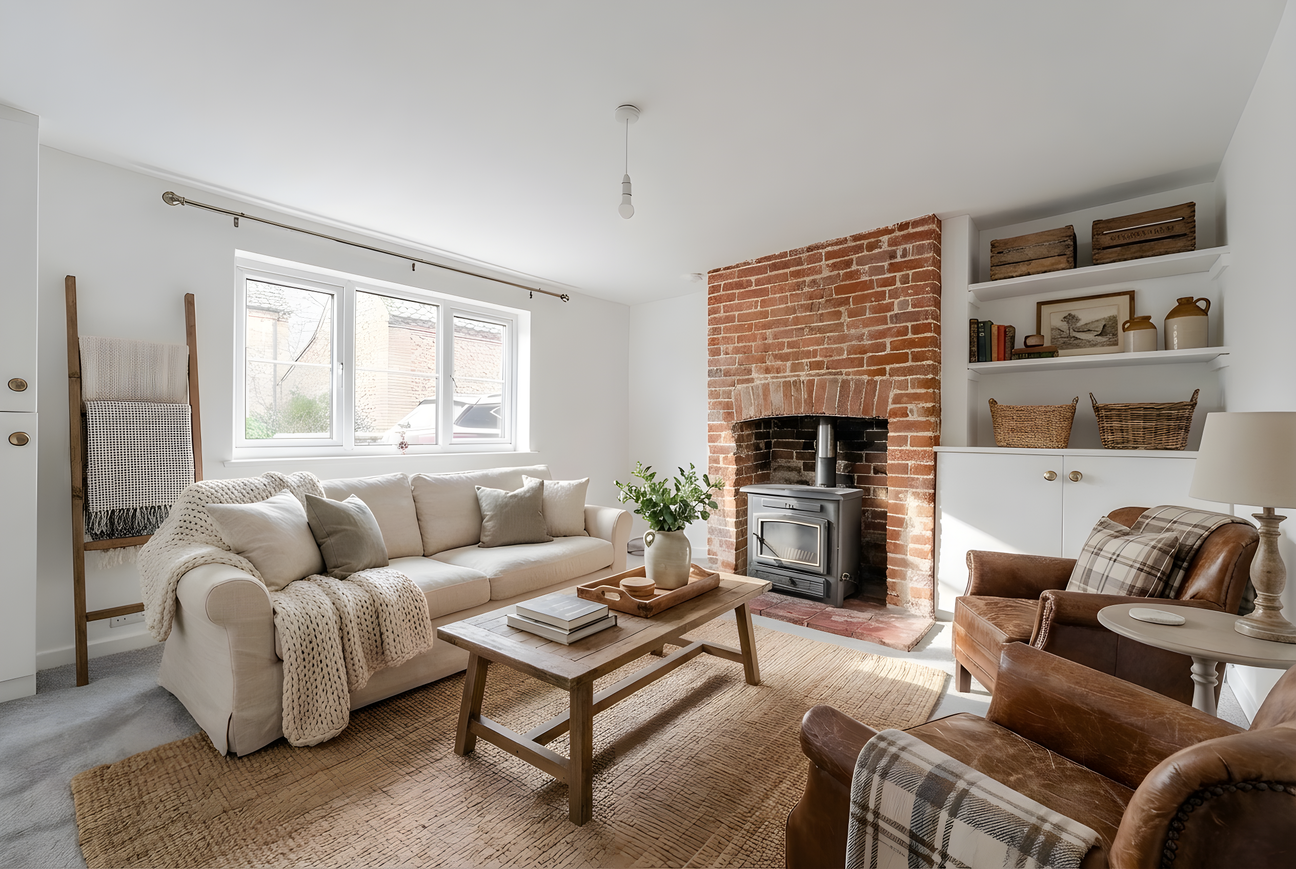 - Cosy front lounge with decorative fireplace and wood burner