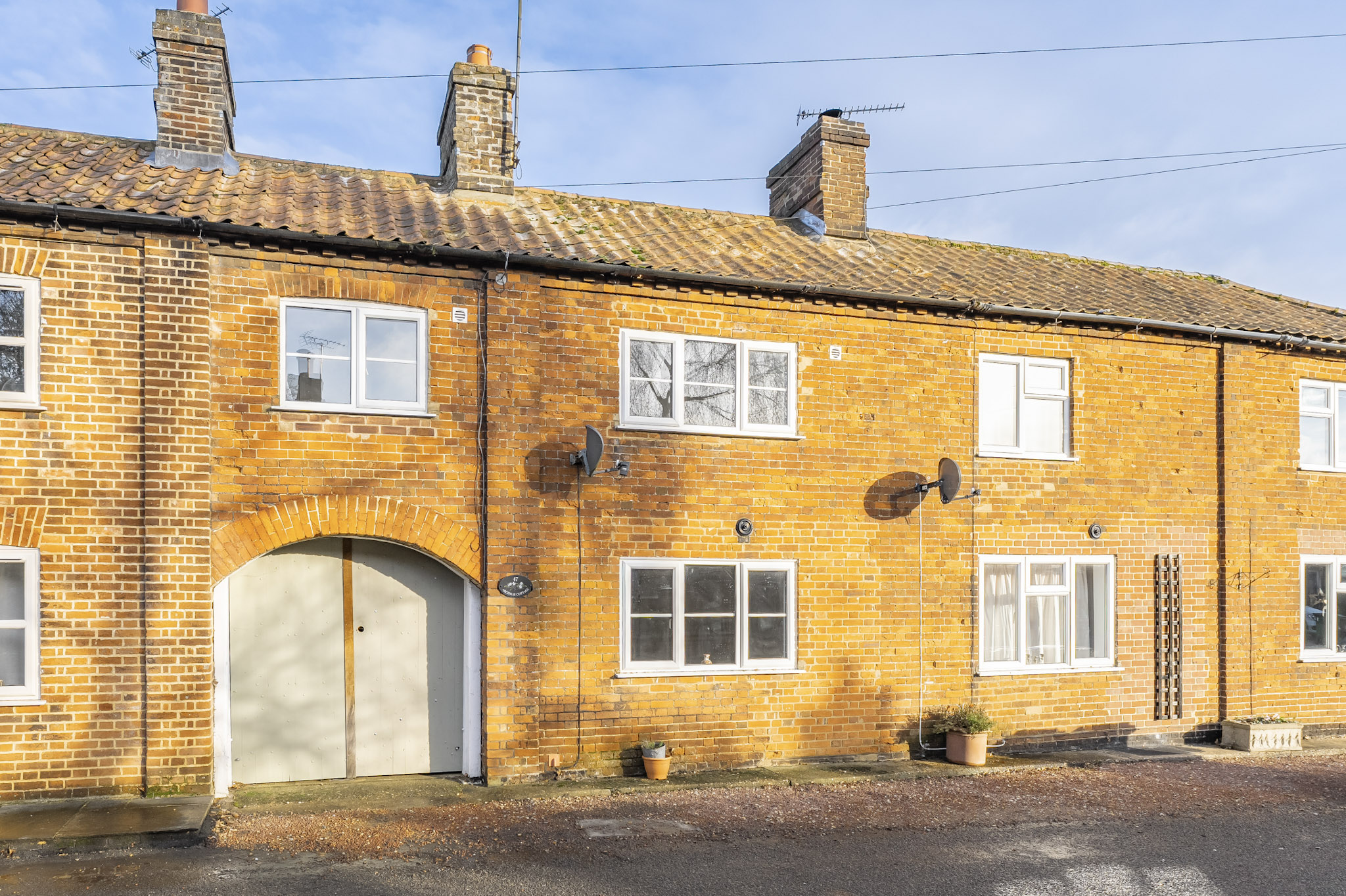 Upstairs, the cottage comprises three bedrooms, two of which are fitted with built-in wardrobes, providing generous storage. A well-appointed family bathroom completes the first floor, a rare and convenient feature in cottages of this style. Recent redecoration and new carpets enhance the fresh, welcoming feel of the home, which also benefits from electric central heating and double glazing throughout.