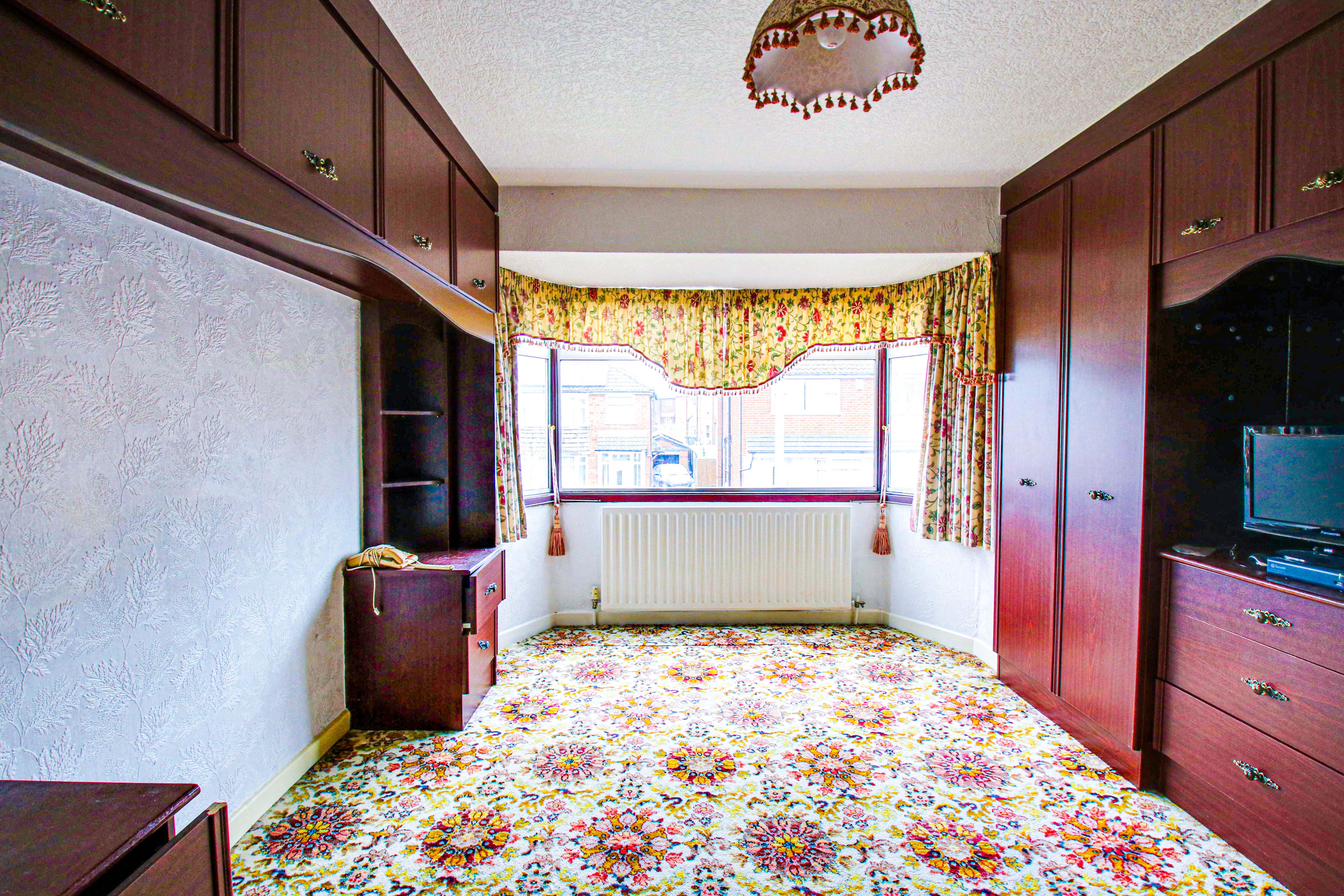 Front facing aluminium bay window, fitted range of wardrobes, drawers and units. Radiator.