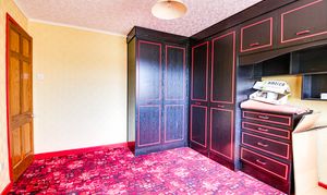 Rear facing aluminium window, fitted range of wardrobes and units. Radiator.