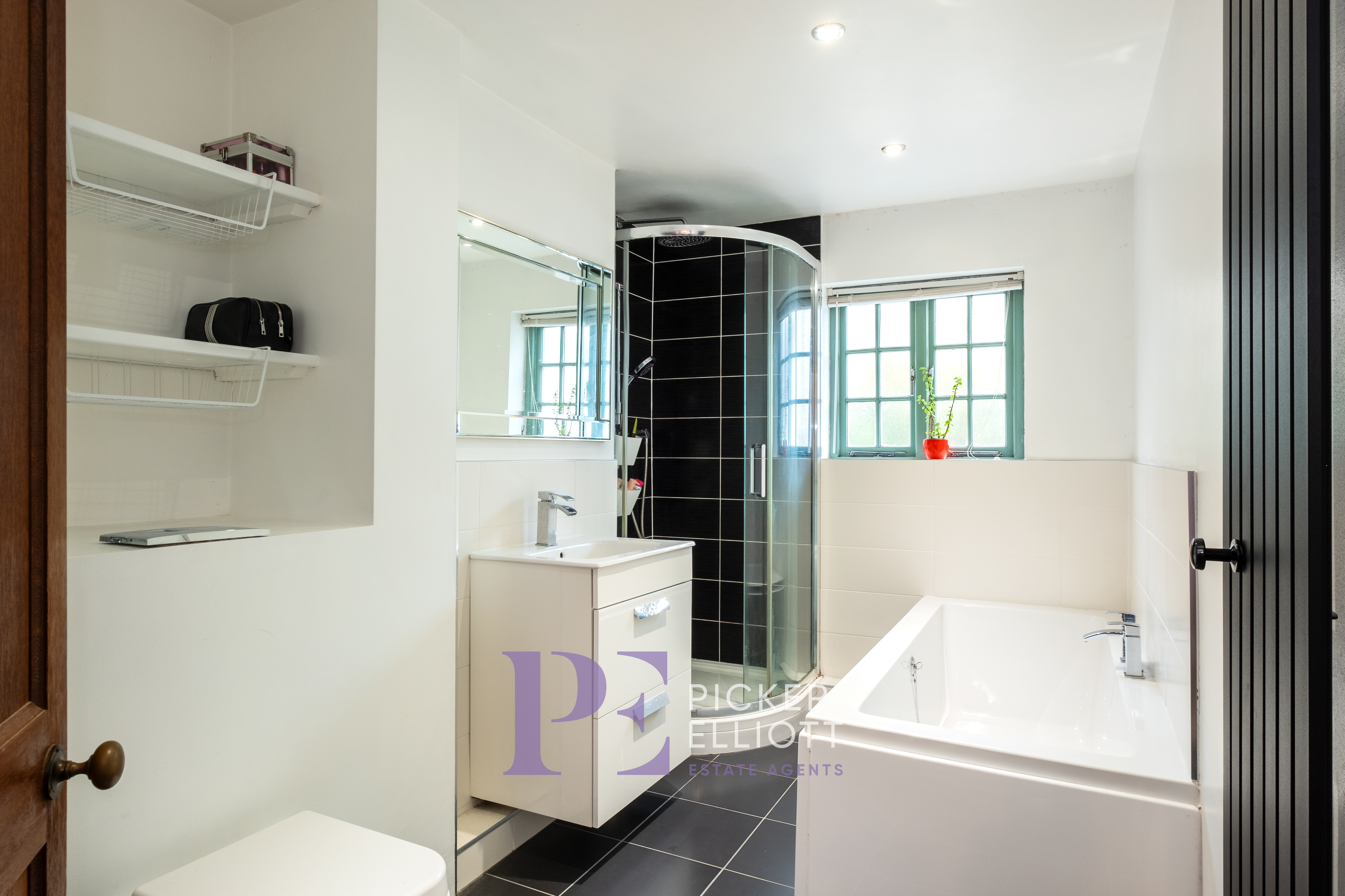 A spacious bathroom with a white suite comprising a back-to-wall toilet, washbasin with vanity unit, bath, corner shower cubicle, vertical radiator, double glazed casement window with frosted glass, and access to under-stairs storage.