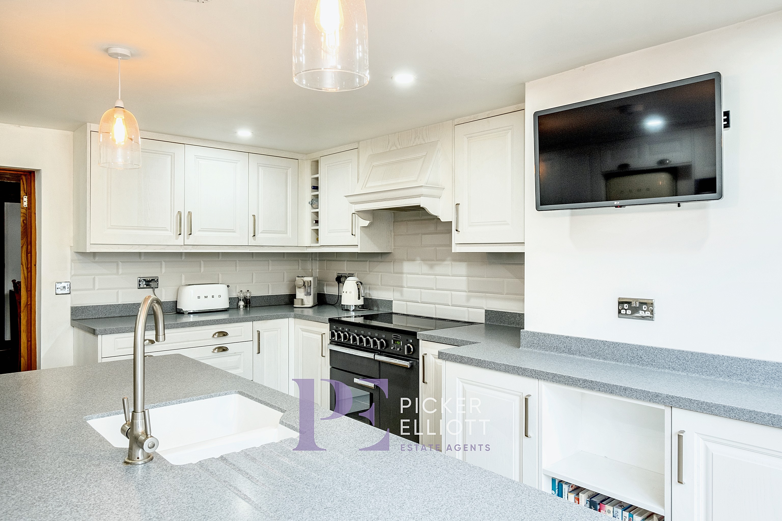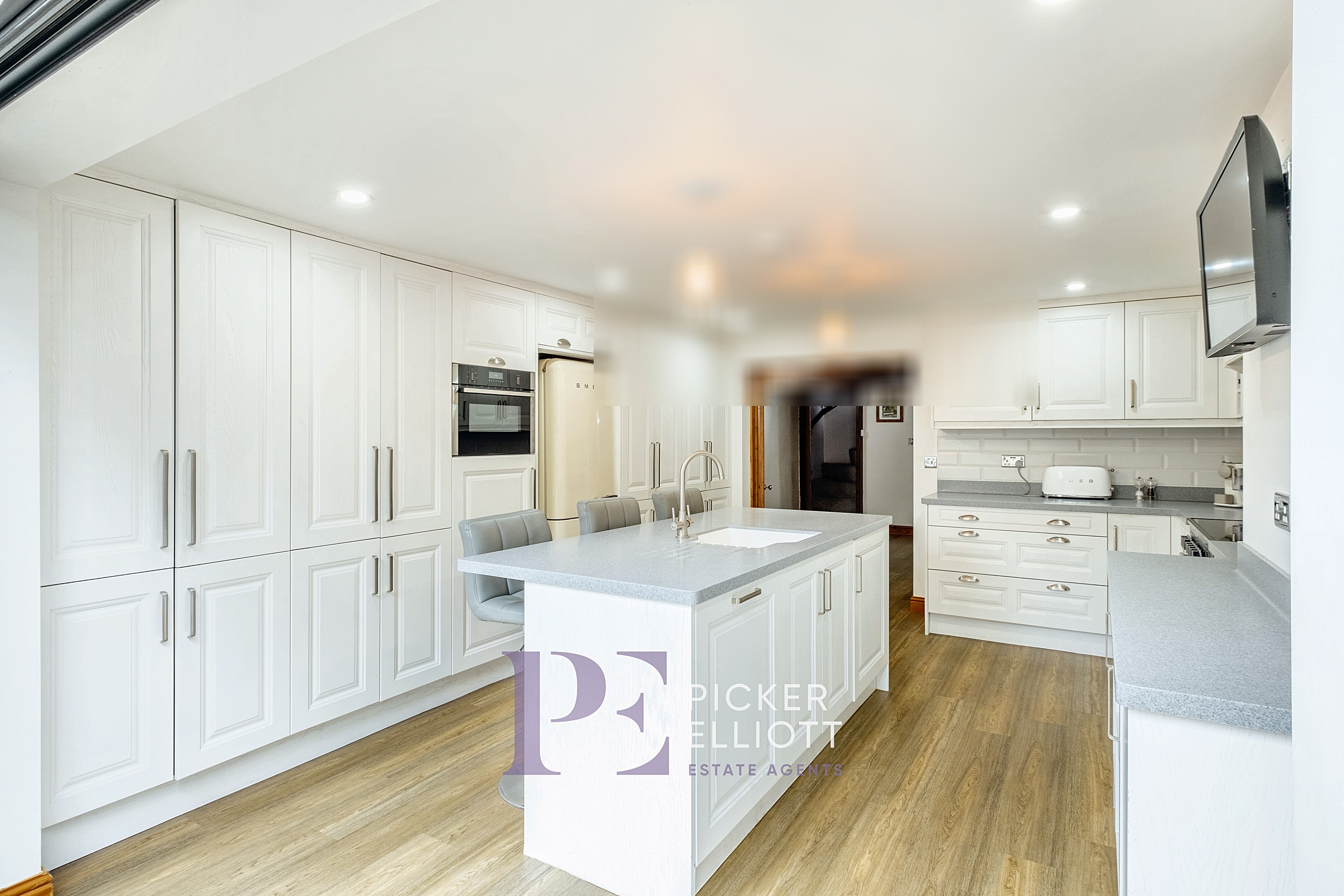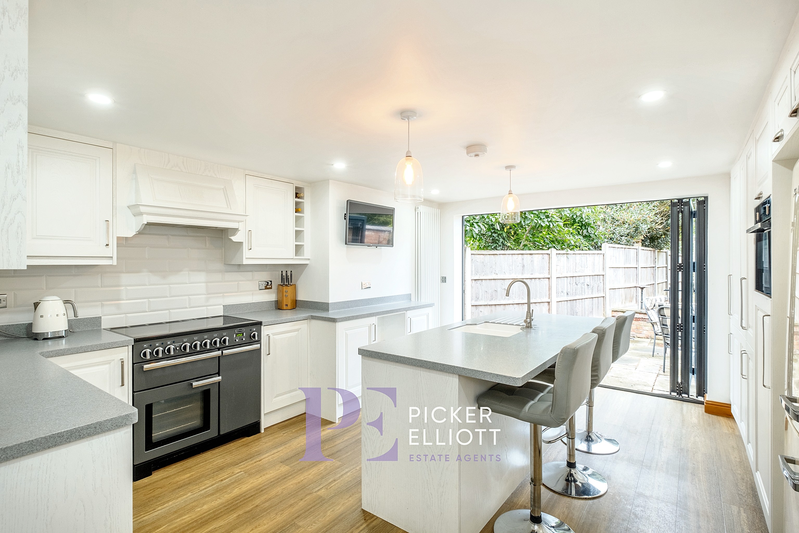 The kitchen has wood effect flooring and bi-folding doors to the rear, and a range of base and wall units with quartz worktops and metro tiling to the splashbacks. There is a freestanding Rangemaster oven with an extractor hood above. There is a central island with an inset ceramic sink, a mixer tap, an integrated dishwasher, and a breakfast bar. There is also a concealed oil-burning boiler and a concealed space and plumbing for a washing machine.