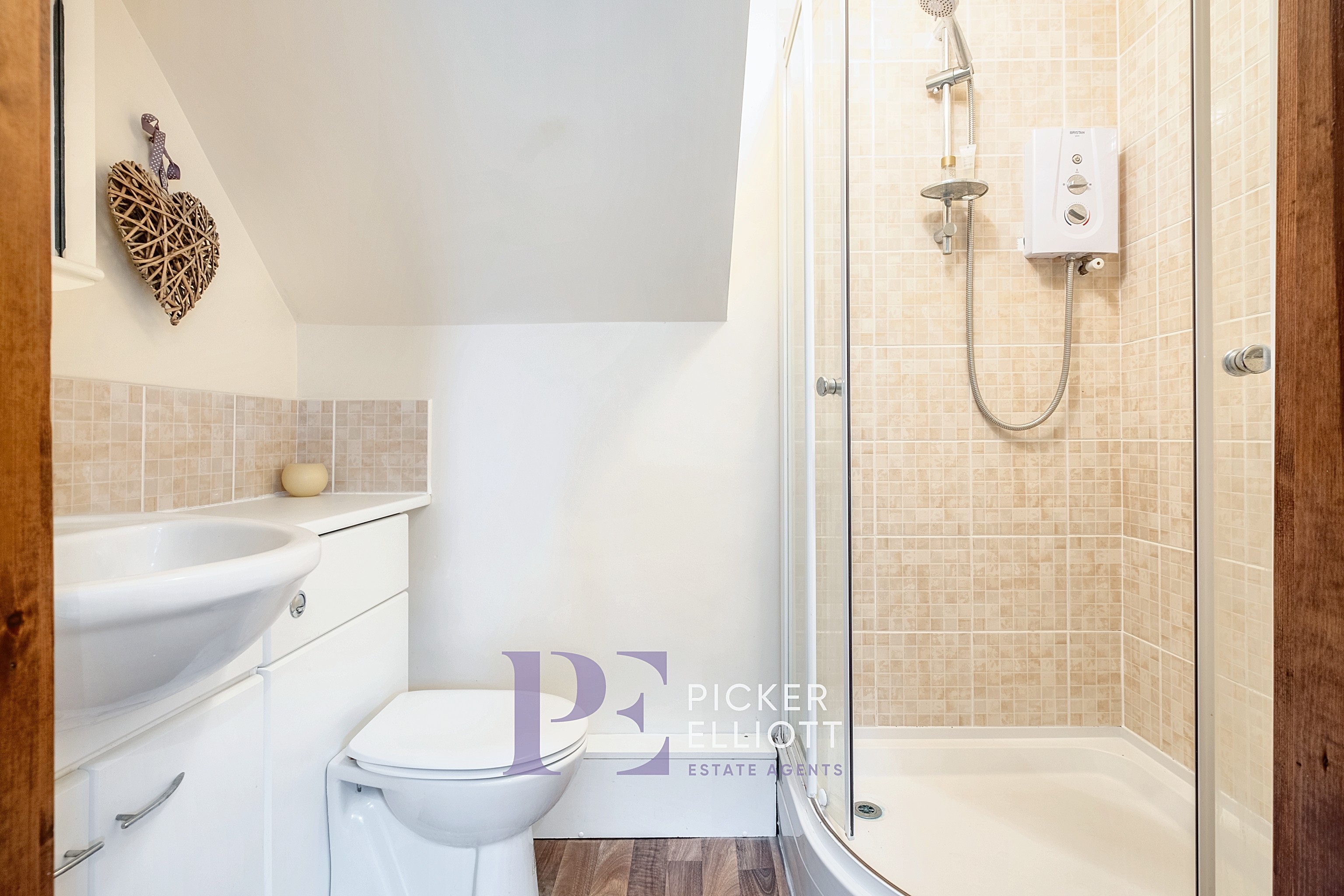 Having a vanity unit with wash basin and button-flush toilet, corner shower cubicle with electric shower, central heating radiator and extractor fan.