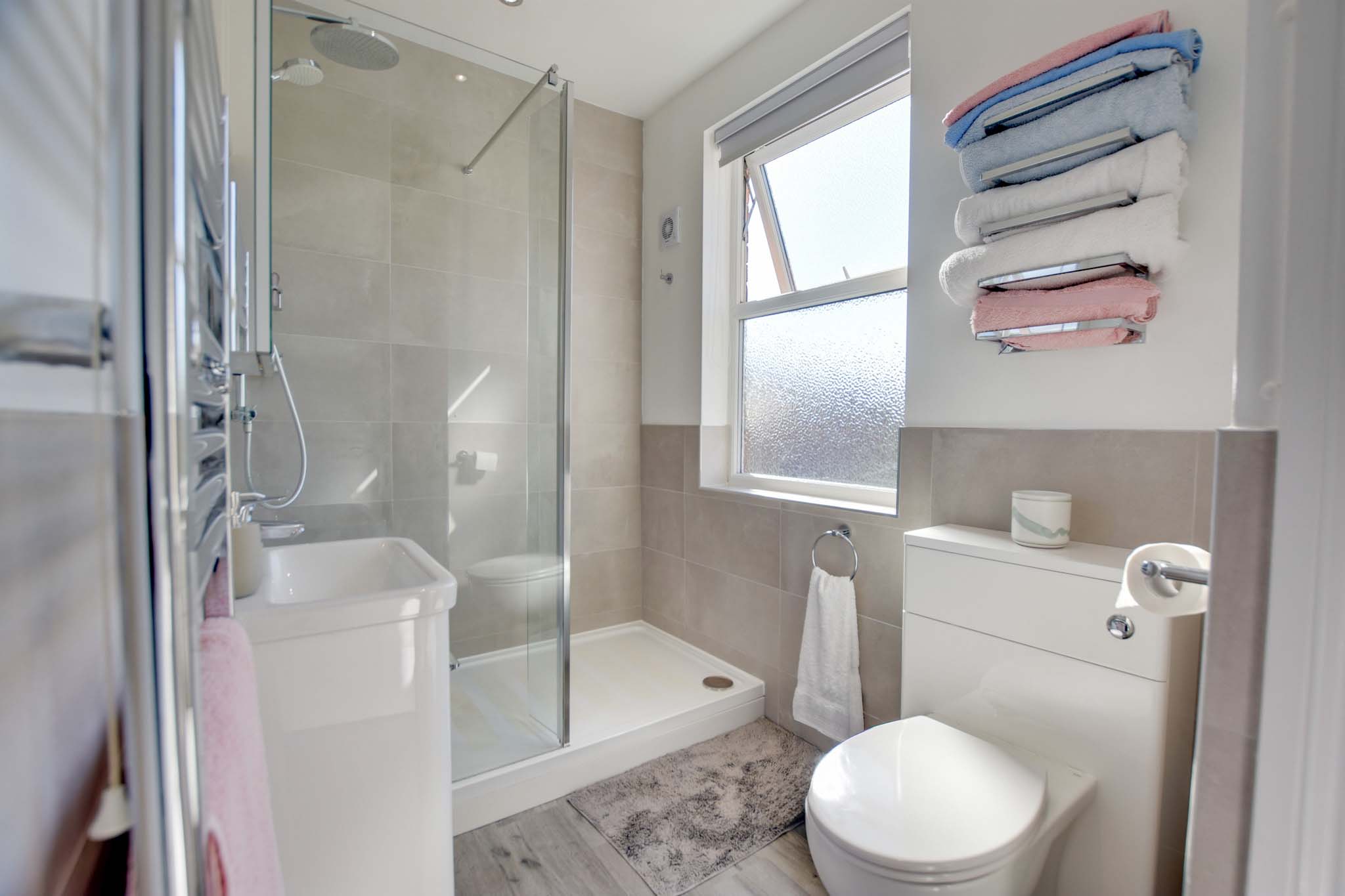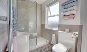 Features double-glazed window to rear elevation, walk-in tiled shower cubicle with overhead rainfall shower and handheld shower, wash hand basin, low-level WC, partly tiled walls, inset ceiling spotlights, extractor fan, and heated chrome towel rail.
