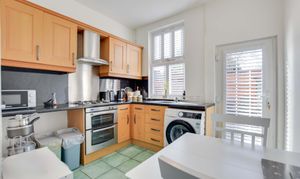 Features double-glazed window to rear elevation, stainless steel sink and drainer unit with a range of wall and base units with work surfaces over, built-in oven and gas hob with stainless steel splashback and chimney hood over, plumbing for washing machine, tiled flooring, and radiator