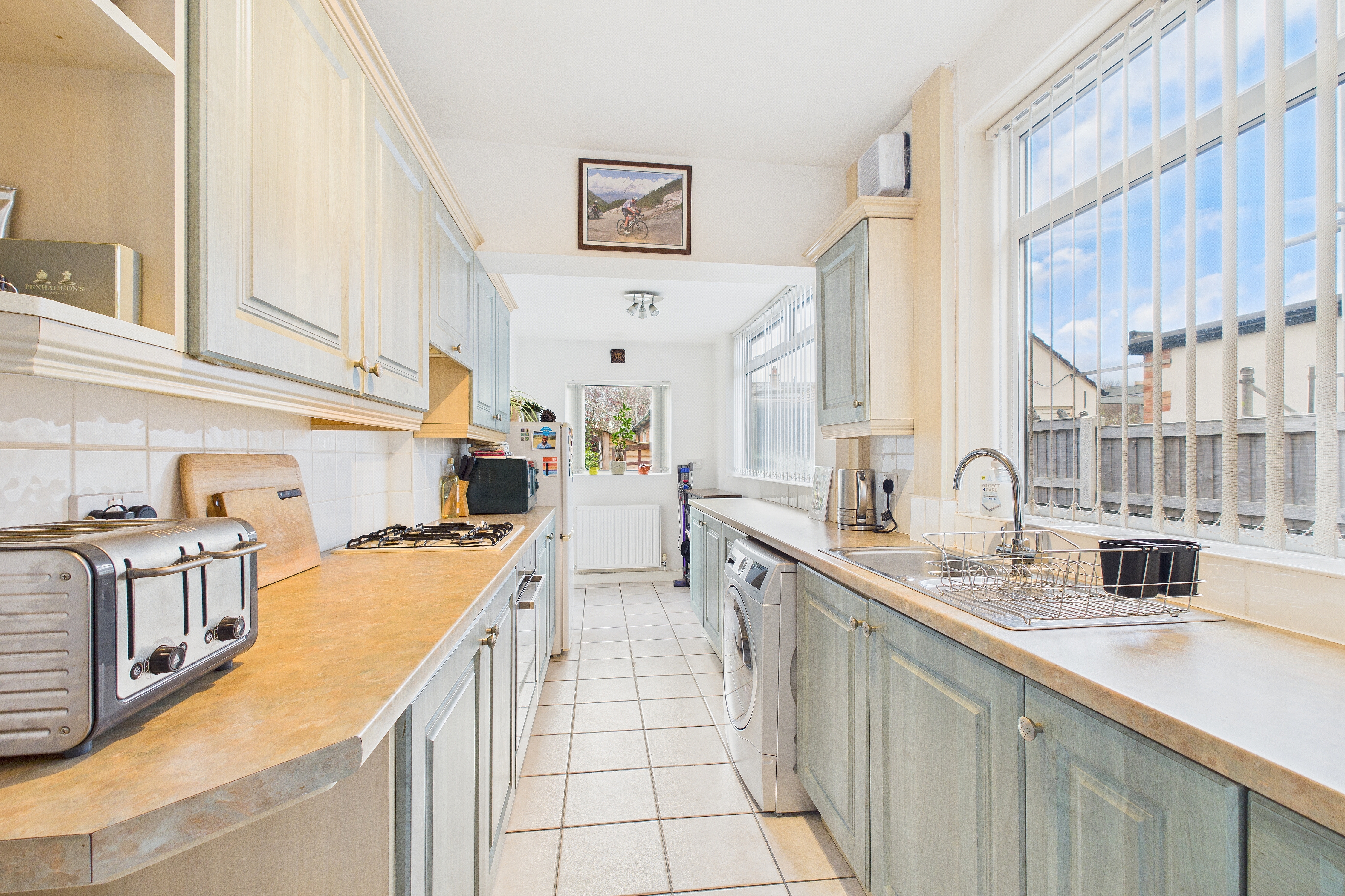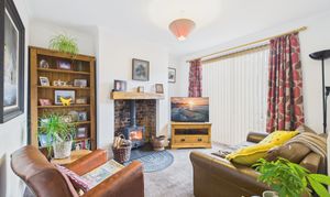 Inside, a welcoming entrance hall features quality vinyl flooring, a useful cloaks cupboard, a spindled staircase to the first floor, and additional under-stair storage. The traditional ground-floor layout includes two separate reception rooms and the kitchen. The front sitting room features an attractive recessed fire, while the rear reception room boasts a cast-iron log burner with exposed brick recess, wooden mantel, and sliding patio doors leading out to the garden. The kitchen is fitted with a range of wall, base and drawer units with work surfaces and space for appliances, and also houses the Worcester gas combination boiler.