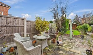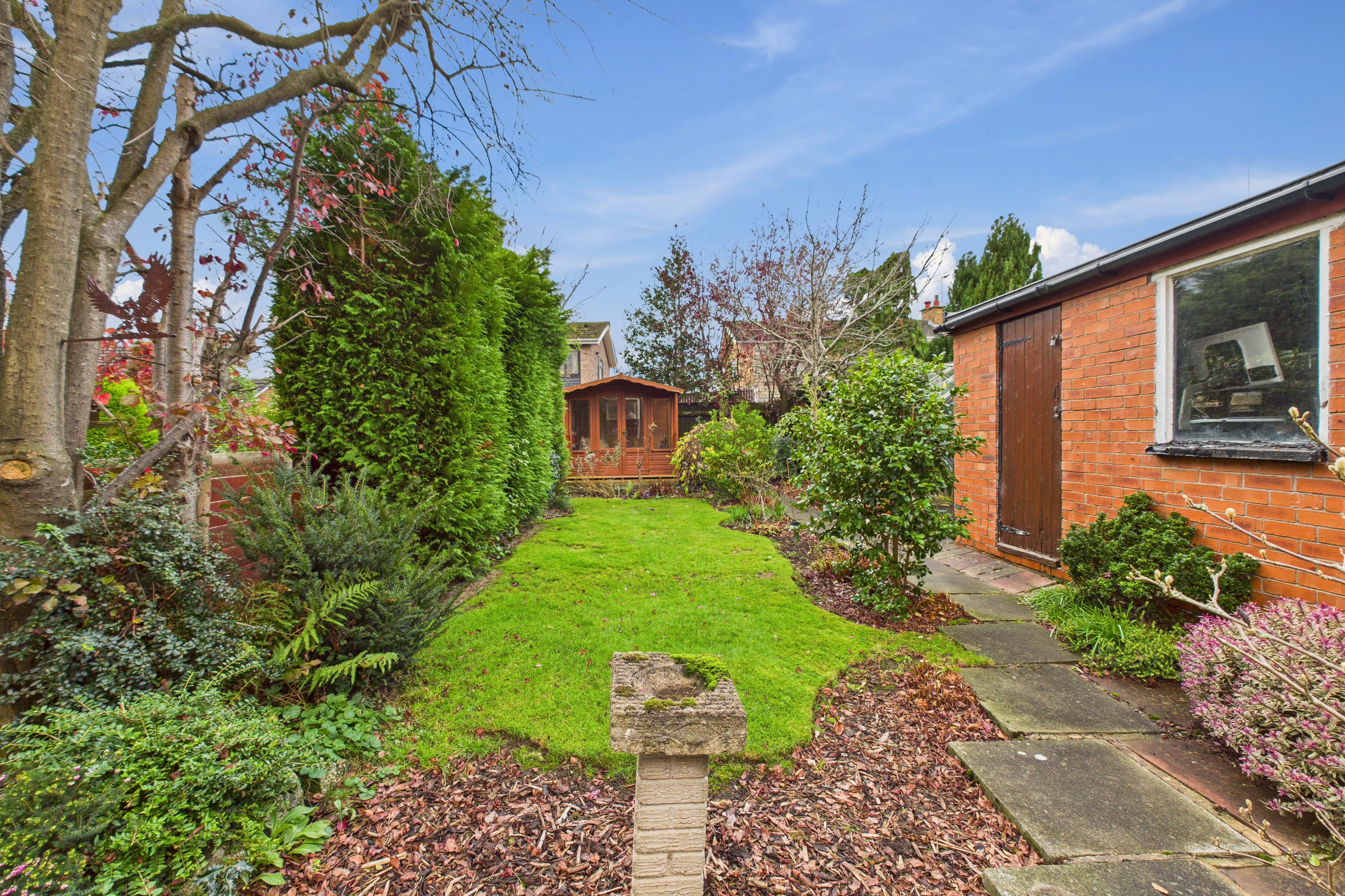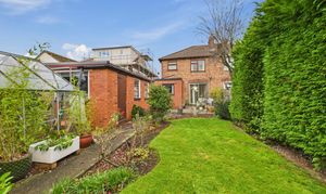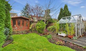 The south-westerly facing rear garden is a pleasant space featuring a patio seating area, shaped lawn with mature borders, and, towards the far end, a timber-glazed summer house and a greenhouse.