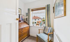 To the first floor, the landing provides access to three bedrooms—two doubles and a single. The third bedroom offers an ideal work-from-home space, while the rear double includes built-in wardrobes. The recently updated bathroom serves all bedrooms and features a stylish white suite comprising panelled bath with dual shower over and tiling, vanity sink unit, low-level WC, and a striking column radiator with towel rail. A particularly useful enhancement to the property is the converted loft space, accessed via a pull-down ladder from the landing. With flooring, power, lighting and a skylight window, it provides excellent storage and presents further scope for full conversion, subject to the usual consents.