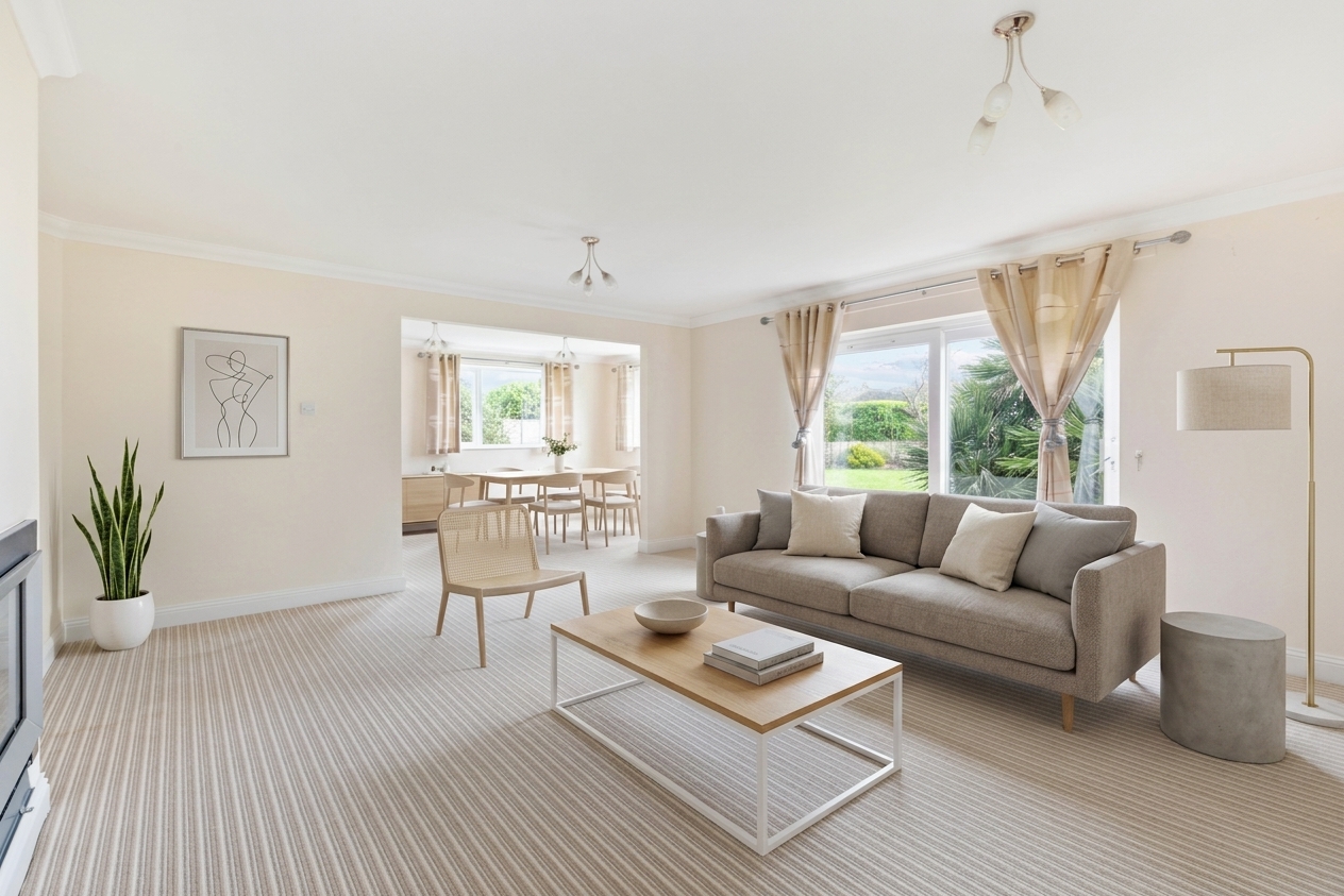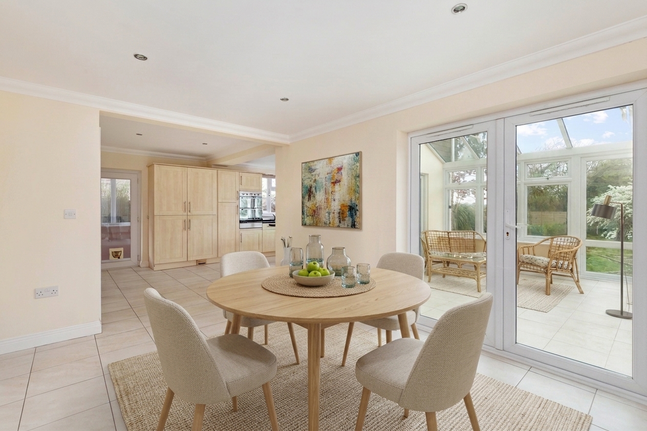 The entrance hall leads to all principal rooms, including a spacious open-plan kitchen/breakfast room, an ideal space for entertaining and hosting guests. A separate utility area is conveniently positioned adjacent, with internal access from the kitchen to the integral garage. Flowing from this space is a large conservatory, which opens onto the rear garden.