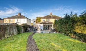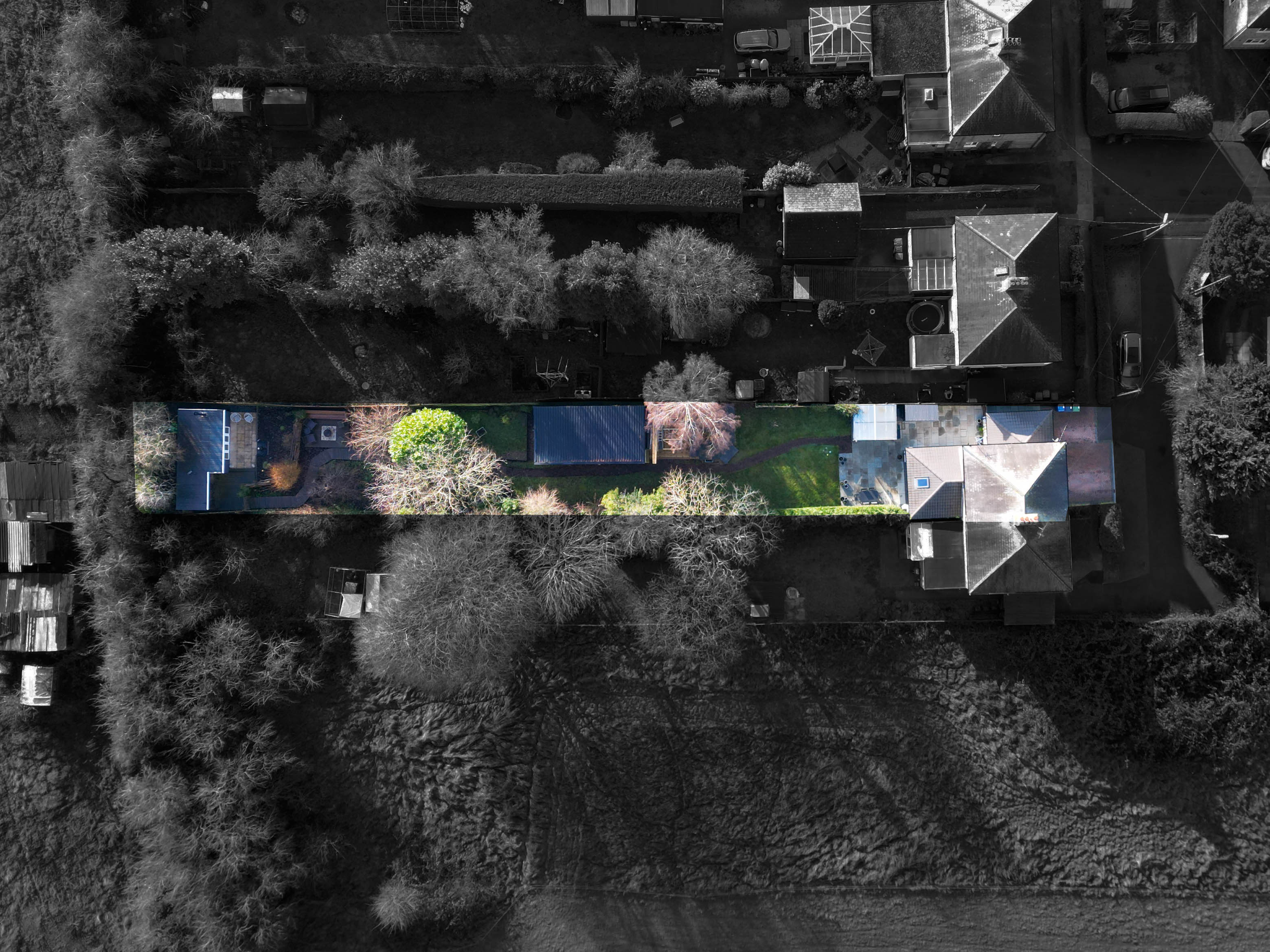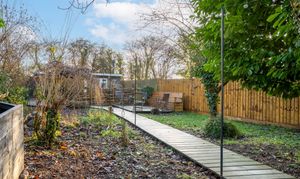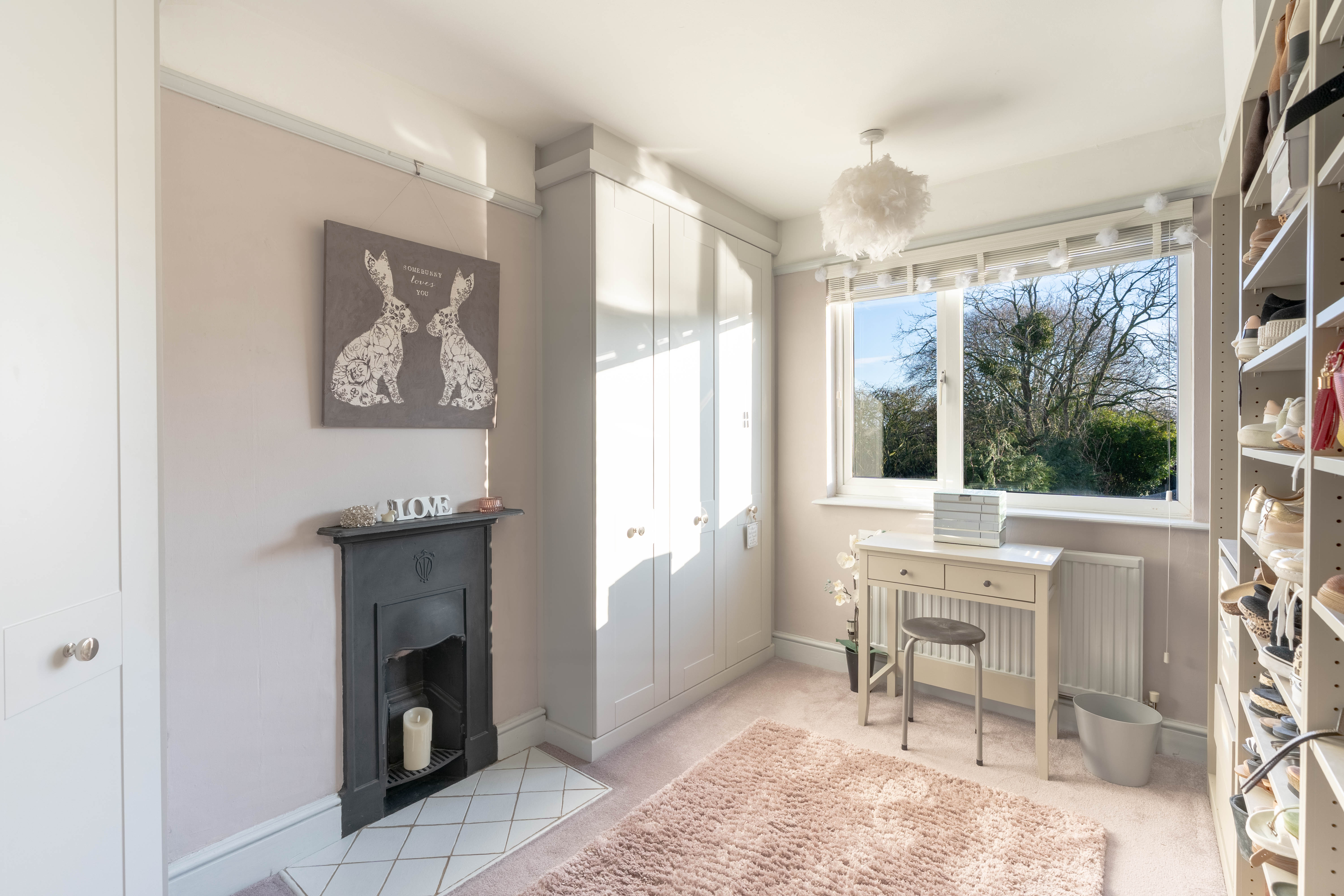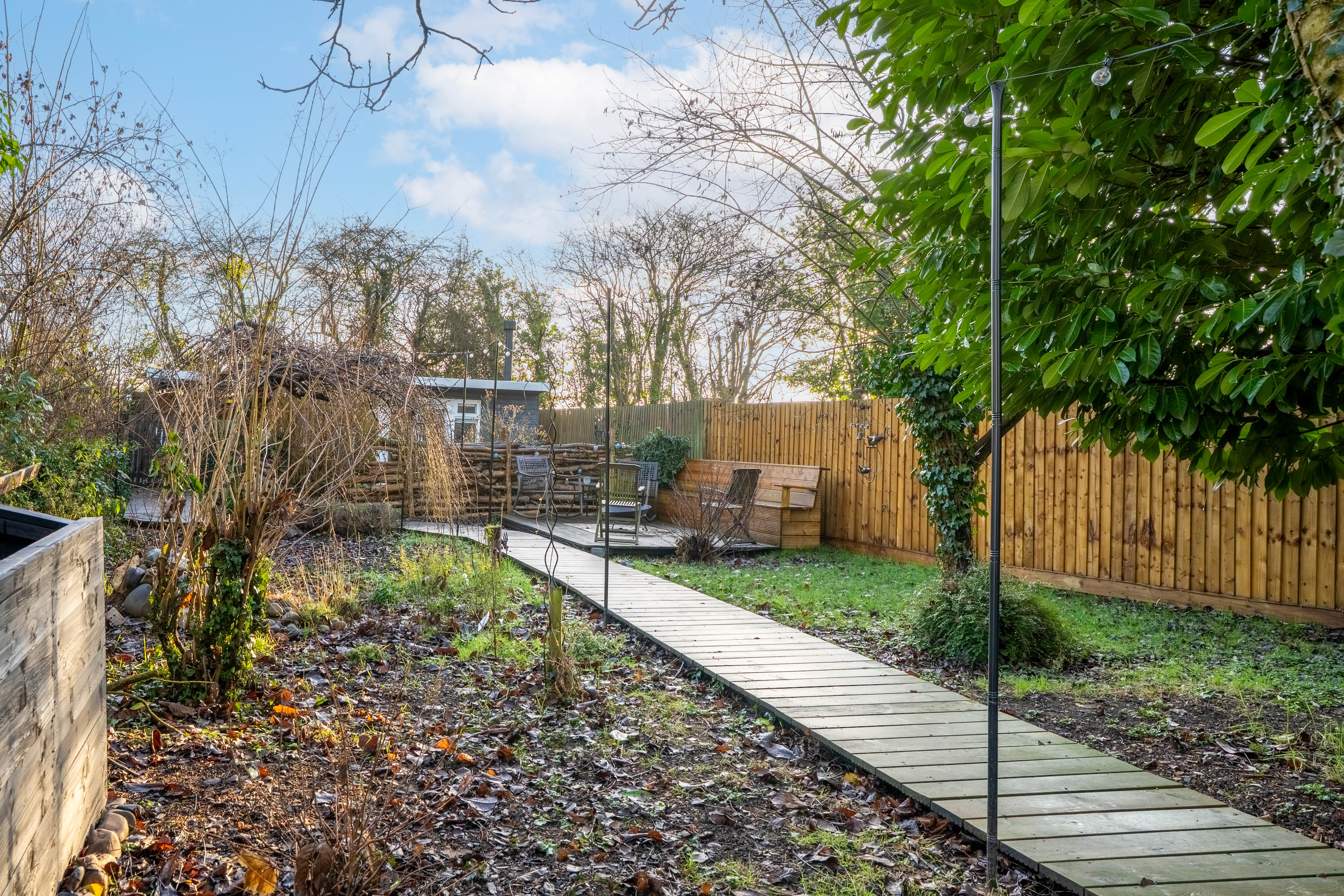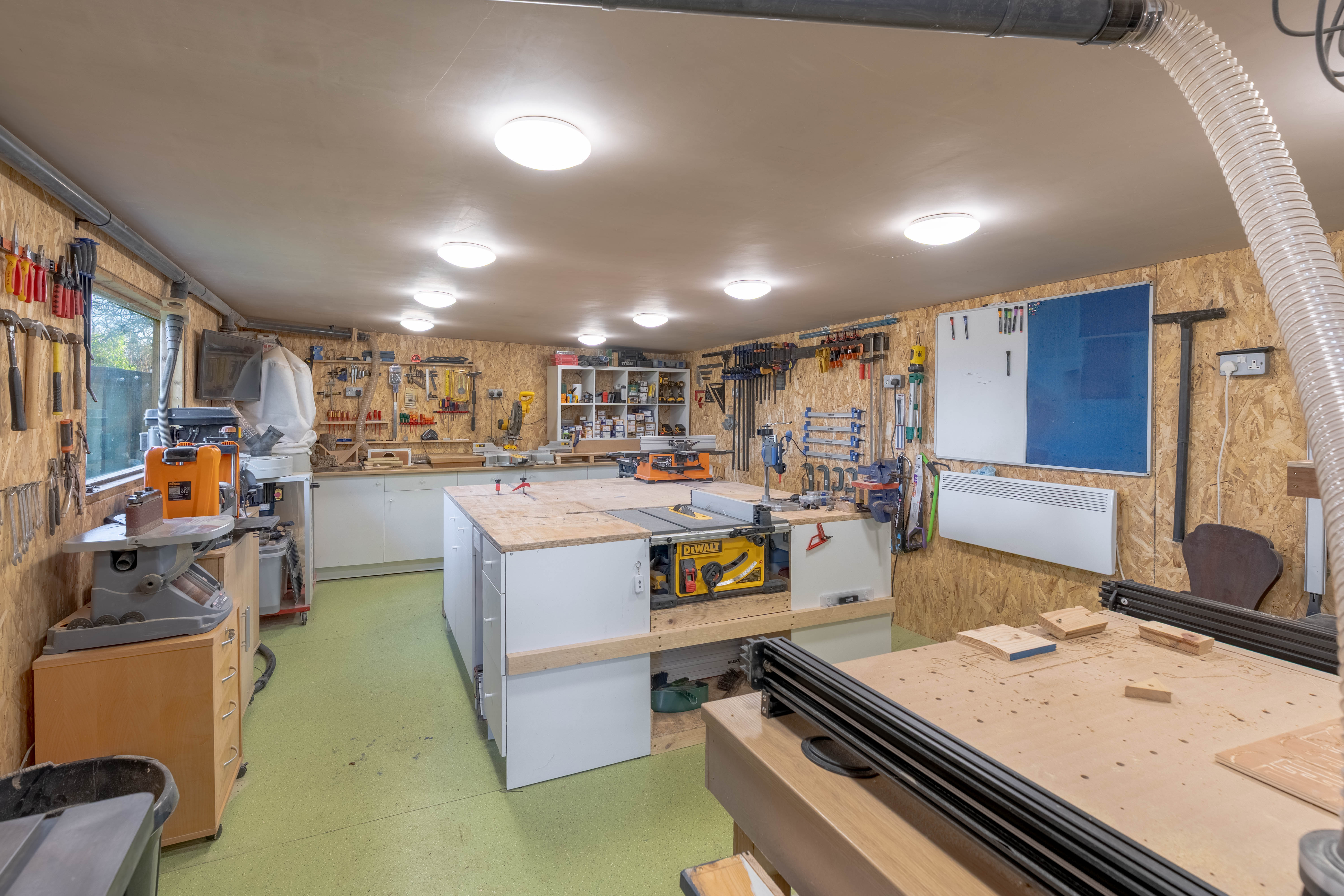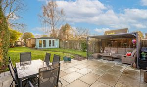 The property is situated at the end of a small cul-de-sac, within walking distance of the bustling village centre. To the front, there is off-road parking for three vehicles, complemented by an electric vehicle charging point, with a further fourth allocated space outside the property. A side access leads to the rear garden, which begins with a paved patio area and a private seating space with pergola. The lawn extends attractively down the garden, leading to a variety of useful and well-maintained outbuildings. These include a home office/gym, a purpose-built workshop, and a potting shed with an adjoining vegetable growing area and mature trees.